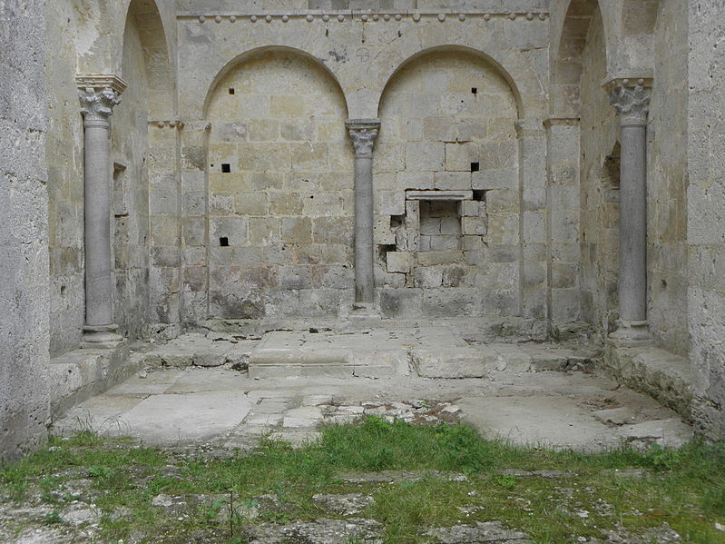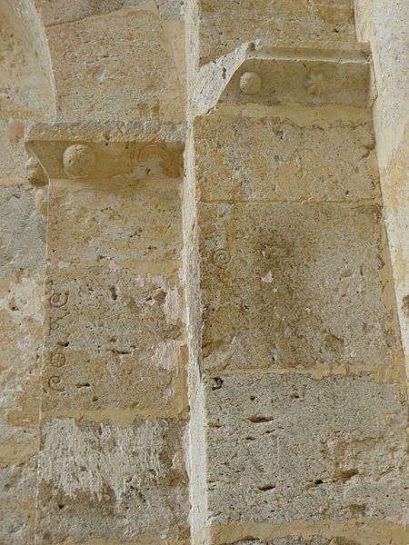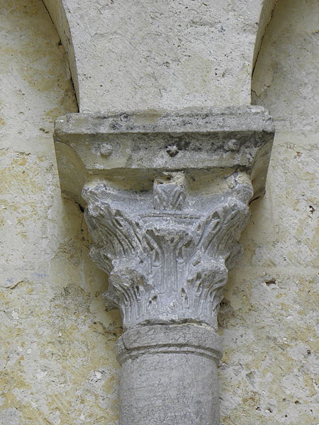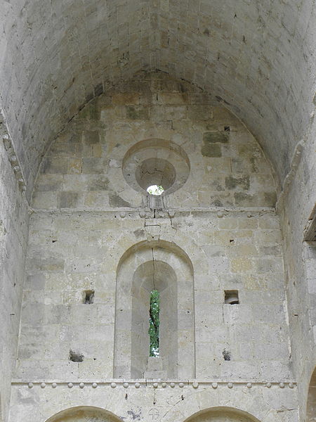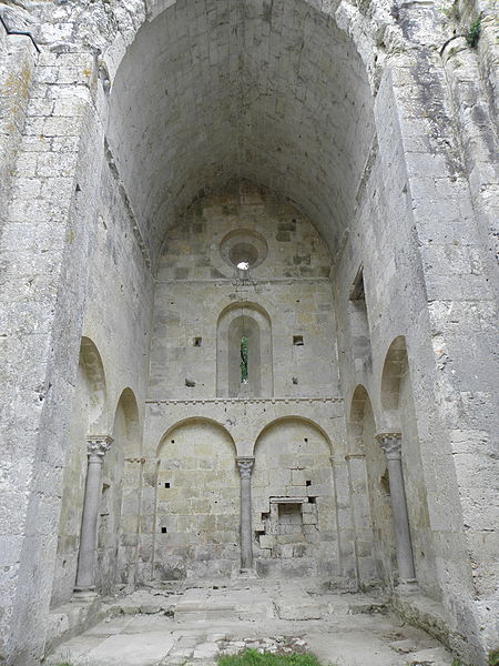 Le chœur, de plan carré, s'ouvre sur la nef par un arc triomphal brisé ; son élévation orientale est organisée en trois étages séparés par des corniches ornées de boules reposant sur des modillons en quart-de-rond. Sur chacune des trois faces, la partie inférieure présente, au‑dessus d'une banquette, deux arcades appuyées sur des pilastres et, au centre, sur une colonnette en marbre rouge et un chapiteau remployés. Dans la partie intermédiaire se trouvent des fenêtres en plein cintre, à la fois au sud et à l'est, cette dernière étant surmontée, dans l'étage supérieur, d'un oculus.
