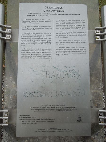 L'église Saint-Pierre de Germignac, en Charente-Maritime (Nouvelle-Aquitaine), présente des parties d'époques différentes. La partie la plus ancienne montre, par le mélange du plein cintre et de l'ogive, l'empreinte de la fin du XIIe siècle, tandis que la portion la plus récente, de style ogival primaire, se rattache au XIIIe siècle. L'édifice adopte un plan en croix latine dont les bras sont occupés par des chapelles. Plusieurs chapiteaux sculptés ponctuent l'intérieur ; deux piliers, surmontés de chapiteaux à feuillages et de tailloirs ornés d'étoiles, pourraient appartenir à une construction antérieure, peut‑être des Xe ou XIe siècles. La façade, flanquée de deux puissants contreforts, s'ouvre par une porte ogivale aux voussures moulurées ; la voussure médiane porte cinq personnages sculptés, au centre le Christ nimbé et bénissant, et de part et d'autre deux personnages montés sur un animal, chacun sous un dais. La partie supérieure de la façade se termine par un pignon triangulaire. Le clocher, constitué par une tour carrée, s'élève au‑dessus de la seconde travée est de l'église ; ses quatre faces sont percées de fenêtres géminées. L'église Saint-Pierre est inscrite au titre des monuments historiques par arrêté du 23 février 1925.