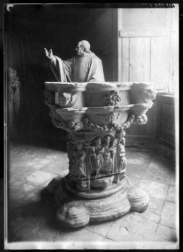 À l'intérieur, la nef est séparée des bas-côtés par de forts piliers ronds et éclairée par des fenêtres étroites qui évoquent le style roman. Près de l'entrée se trouve une sculpture en pierre représentant le Christ aux liens. Les fonts baptismaux, en pierre sculptée et datés de 1567, présentent une cuve carrée ornée de festons et de guirlandes reposant sur un fût sculpté ; les colonnettes d'angle ont disparu. Quatre sujets sculptés, séparés par des anges, ornent le support de la cuve : au-devant le baptême de Jésus, à droite saint Pierre et saint Paul, à gauche l'Assomption de la Vierge avec des anges tenant une couronne au-dessus d'elle, et derrière probablement saint Jean. Le bandeau qui entoure la cuve porte l'inscription « O MR DEI MEMENTO MEI ». Sur la cuvette de plomb intérieure est gravée la mention « Jesus, via, veritas et vita.18. 1657 » ; au fond figurent les lettres « FL.NC.SP. », dont le sens demeure inconnu. Les fonts sont classés au titre d'objet parmi les monuments historiques depuis le 21 février 1907.