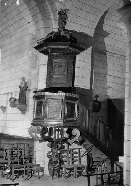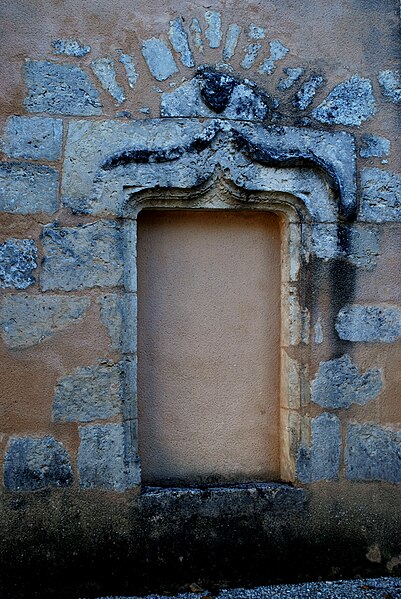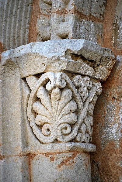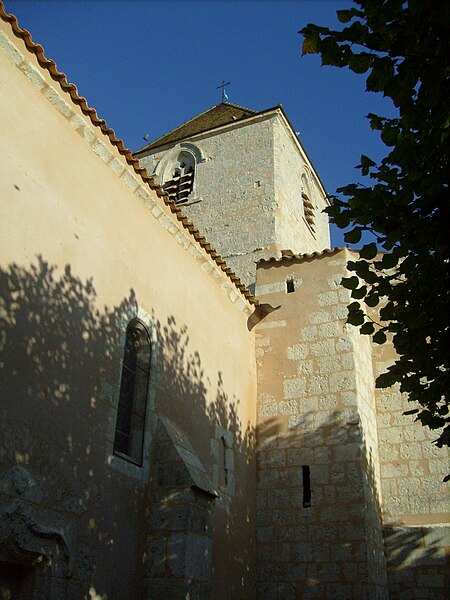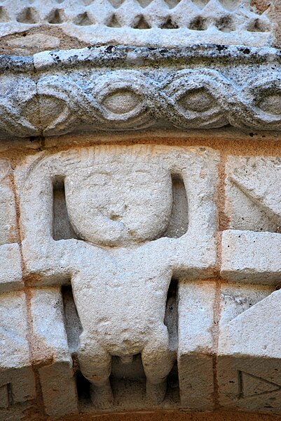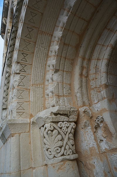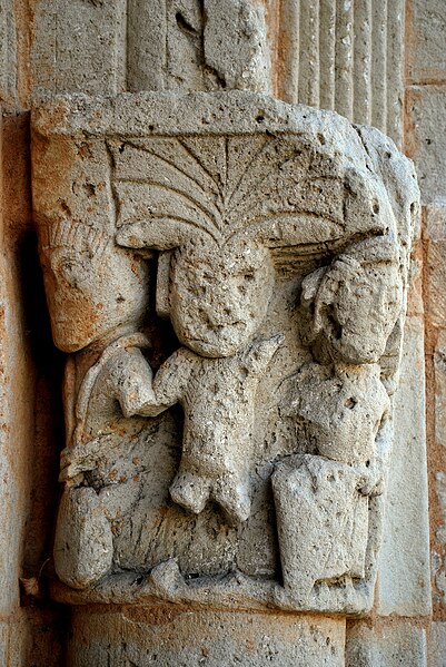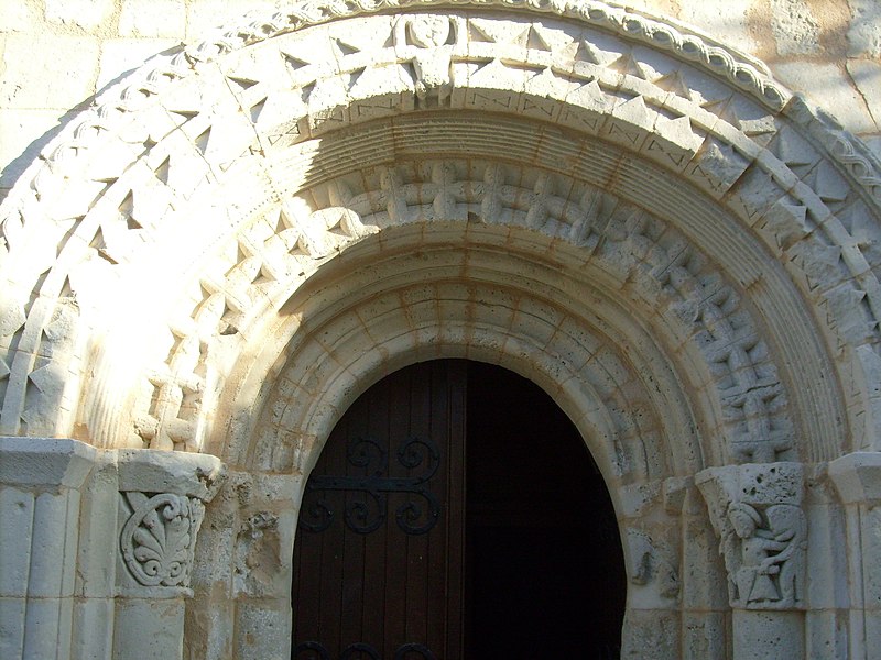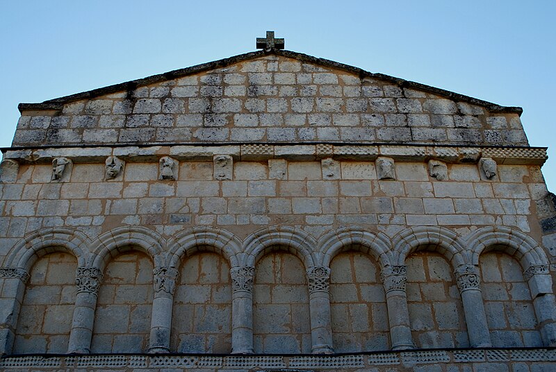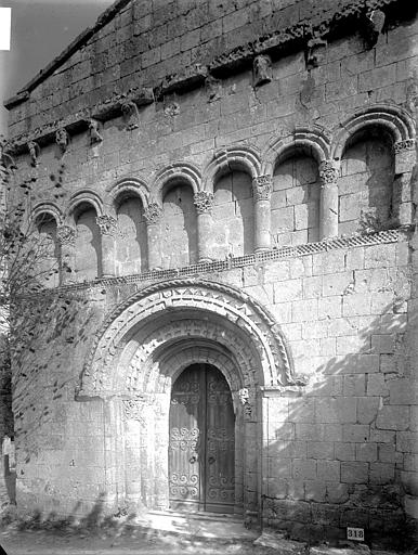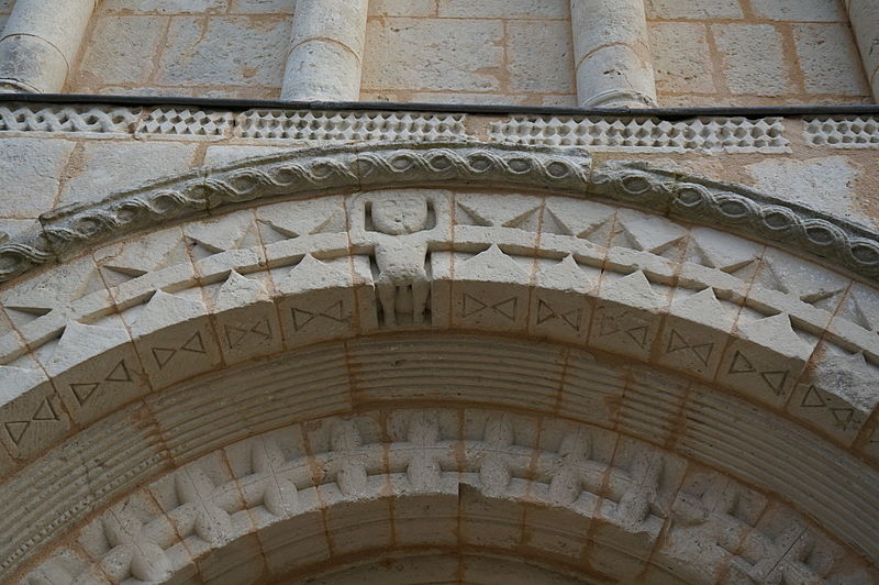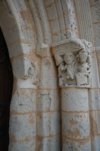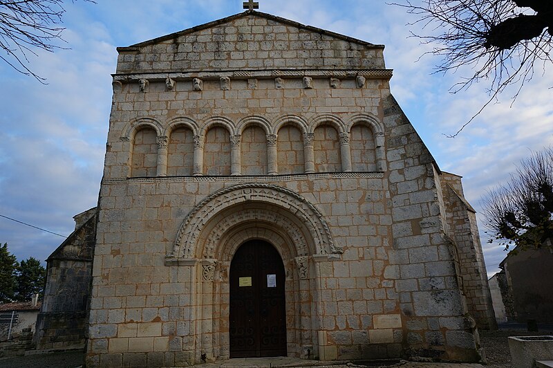La façade occidentale est rythmée par des bandeaux en trois niveaux : au premier se trouve un portail à trois voussures au décor géométrique, sur colonnettes et chapiteaux sculptés, surmonté d'un atlante nu ; le deuxième niveau présente sept arcatures reposant sur des colonnes à chapiteaux végétaux ; le troisième est formé d'une corniche portée par dix modillons et se termine en pignon. Le chapiteau nord du portail affiche un décor végétal simple, tandis que le chapiteau sud est historié et représente quatre personnages : à gauche un avare, reconnaissable à la lourde bourse suspendue à son cou ; au centre un être maléfique mutilé (privé de bras et de jambes) qui se relie à une femme placée à l'angle de la corbeille ; cette femme enlace le cou d'un monstre qui tient de la main gauche un bâton orné d'un fanion triangulaire.