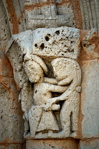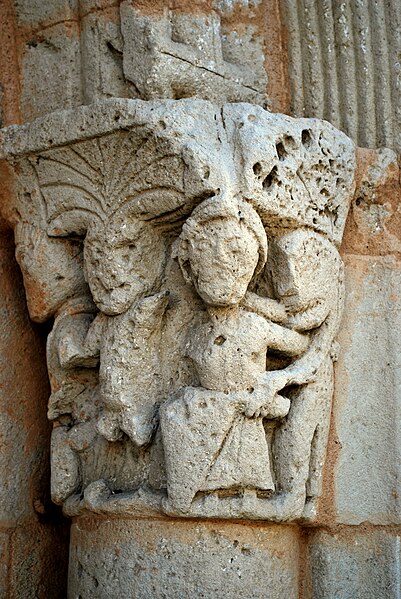 Les sujets non bibliques des chapiteaux et des modillons relèvent souvent de mises en garde contre les péchés capitaux, en particulier la luxure et l'avarice, comme l'illustre la composition du chapiteau sud. Il ne subsiste que deux modillons identifiables : l'un représente un monstre tirant la langue, geste considéré comme obscène, l'autre une scène de copulation, motif fréquent en Aquitaine et en Poitou-Charente (on en trouve notamment à l'église de Saint-Caprais-de-Bordeaux). On peut raisonnablement supposer que les modillons martelés portaient des sujets analogues. L'église Saint-Pierre-ès-Liens est inscrite au titre des monuments historiques : sa façade occidentale en 1925, puis l'ensemble de l'édifice en 2000.