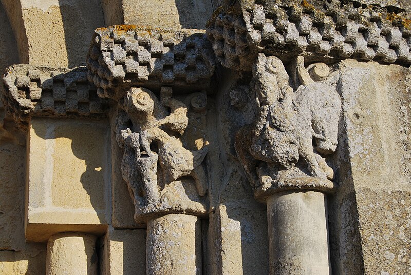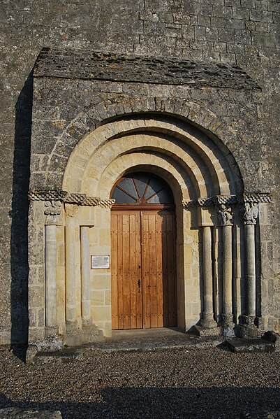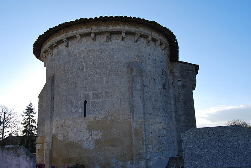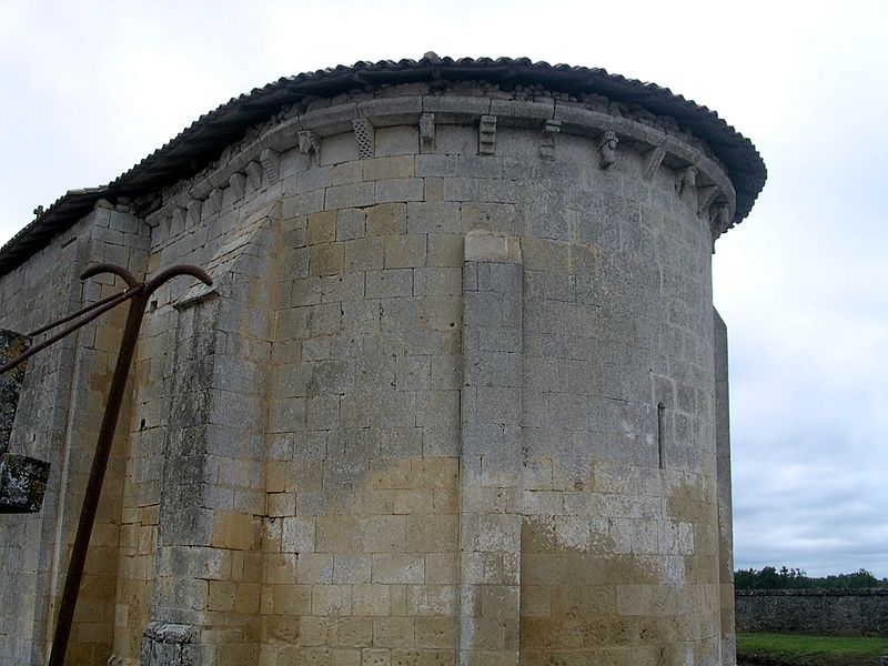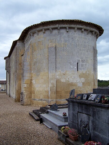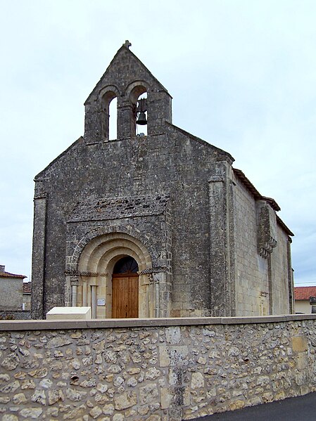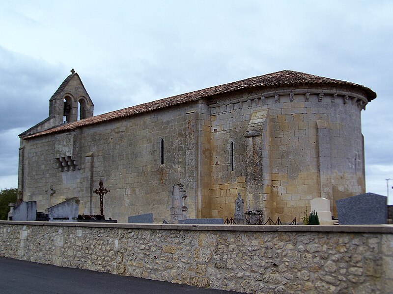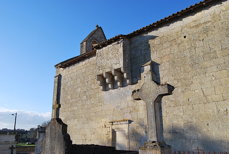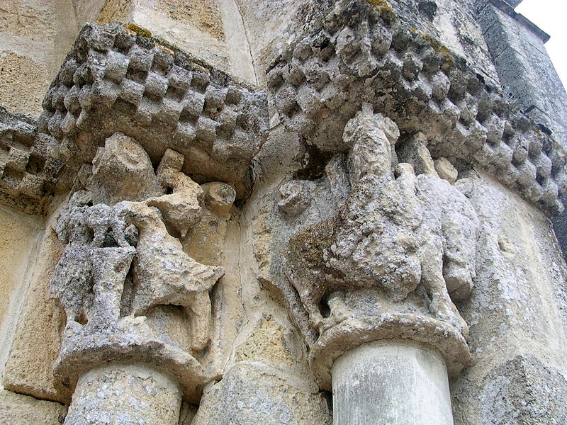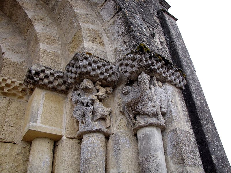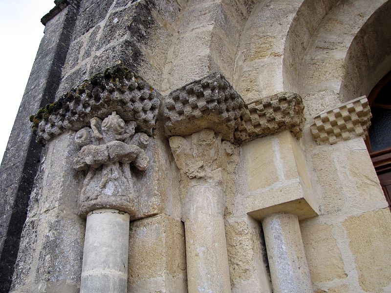 L'église Saint-Pierre de Martres, en Gironde, se situe au cœur du bourg, à proximité de la route départementale D119. L'édifice, d'origine romane, date du XIIe siècle ; il a été remanié aux XIVe et fortifié au XVIe siècle, puis réparé aux XVIIIe et XIXe siècles. Le plan comprend une nef unique non voûtée et lambrissée, un chœur de plan carré et une abside semi-circulaire voûtés, éclairée par une petite baie axiale. La façade ouest présente un portail roman muni de colonnettes à chapiteaux historiés et surmonté d'un clocher-mur percé de deux baies. L'ensemble est bâti en pierres de taille ; certaines pierres du mur sud portent des marques de tâcherons. Une partie du mur nord a été refaite et le bâtiment est flanqué d'une série de contreforts plats, plus saillants au nord qu'au sud. Les remaniements extérieurs liés aux guerres de Religion comprennent la construction, sans doute au XVIe siècle, d'une échauguette sur le flanc nord, partiellement appuyée sur un contrefort et pourvue de trous de visée pour armes à feu. Sur le flanc sud, une petite porte ouverte au XVe siècle est surmontée d'une bretèche servant d'assommoir et d'emplacement de tir ; cette porte, remaniée au XVIIIe siècle, porte le monogramme IHS. À l'intérieur, la nef est dépourvue d'ornementation et deux autels latéraux ont été installés à l'extrémité orientale ; le chevet est couvert par une voûte surhaussée reposant sur un arc triomphal en anse de panier. Les sculptures romanes, attribuées à un atelier actif au milieu du XIIe siècle et inspiré notamment par l'abbaye de Saint-Ferme, ornent le portail et le sanctuaire. Le portail s'ouvre dans un avant-corps à quatre voussures ; trois d'entre elles reposent sur des colonnettes modernes dont les chapiteaux portent un tailloir et une frise continue de billettes. Parmi les six chapiteaux du portail, quatre sont d'époque romane et historiés ; trois d'entre eux sont encore identifiables : le chapiteau nord montre deux grands félins squelettiques accolés, l'un des chapiteaux sud représente des oiseaux buvant à un calice eucharistique et le second illustre la fuite en Égypte avec la Vierge à l'âne. Sous la corniche du chevet, les modillons présentent des têtes de loup ou de monstre et des motifs géométriques, sans grande leçon moralisatrice explicite. Les chapiteaux du sanctuaire offrent des scènes plus narratives et symboliques : le premier chapiteau nord évoque la vocation des premiers disciples par une embarcation et des rameurs, avec la présence d'un personnage auréolé, tandis qu'un lion et un oiseau figurent en arrière-plan ; ce type de composition renvoie aux évangiles et trouve un parallèle à l'église Saint-Sulpice de Daubèze. Le second chapiteau nord représente deux dogues déchirant une tête humaine sur la face visible des fidèles, et, sur la face cachée, un rapace fondant sur un lièvre, image allégorique de la lutte contre la luxure. Le chapiteau sud 1 montre deux lions affrontés séparés par un entrelacs central. Le chapiteau sud 2 illustre la condamnation des « hommes invertis » : deux figures accroupies ont la tête en proie à un lion et tiennent des becs de rapace ; la présence d'un médaillon dorsal associe cette scène, dans l'iconographie romane locale, à une dénonciation de l'homosexualité. L'édifice est inscrit au titre des monuments historiques par arrêté du 21 novembre 1925.