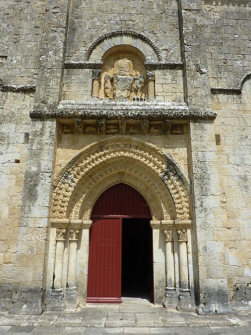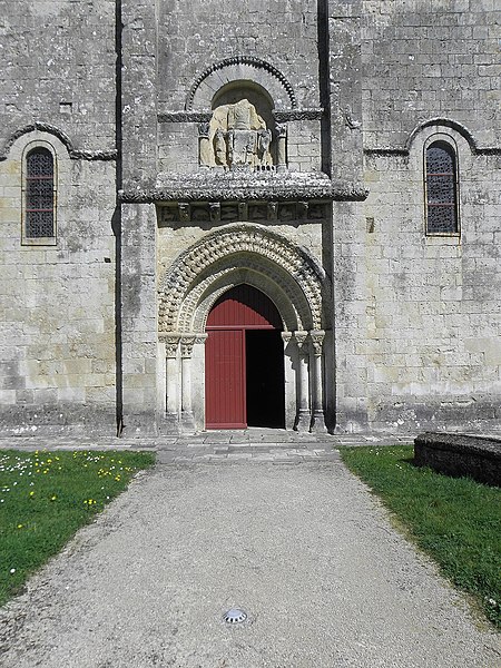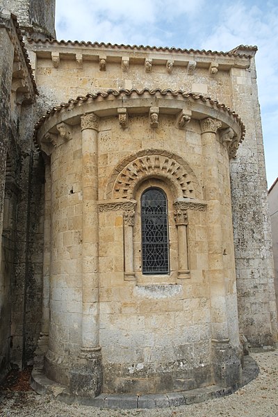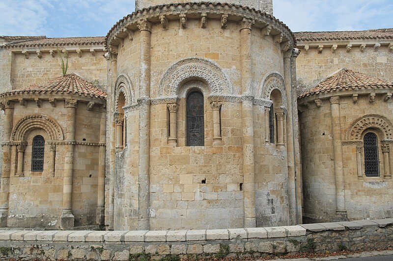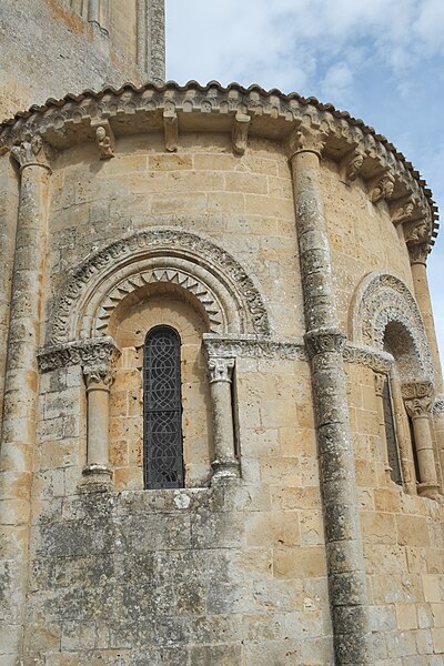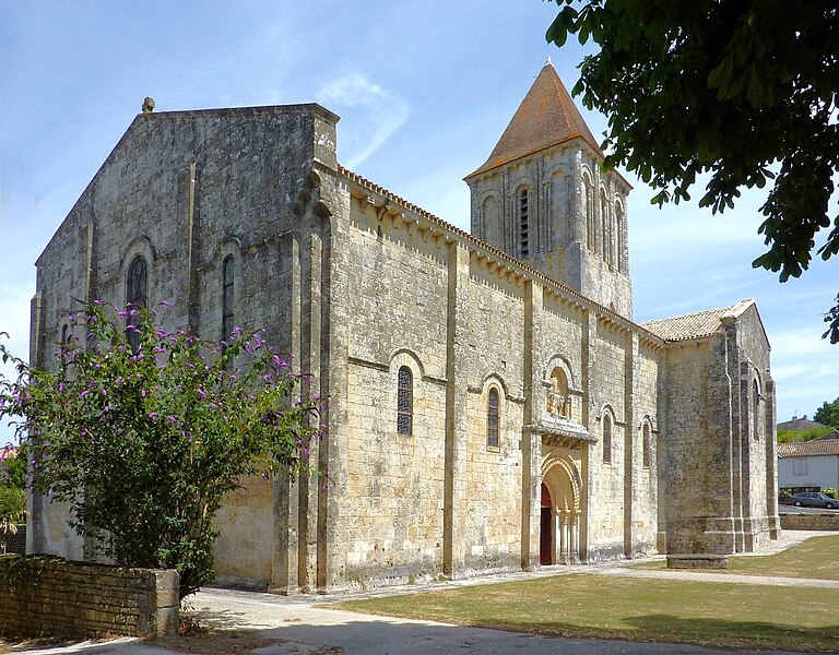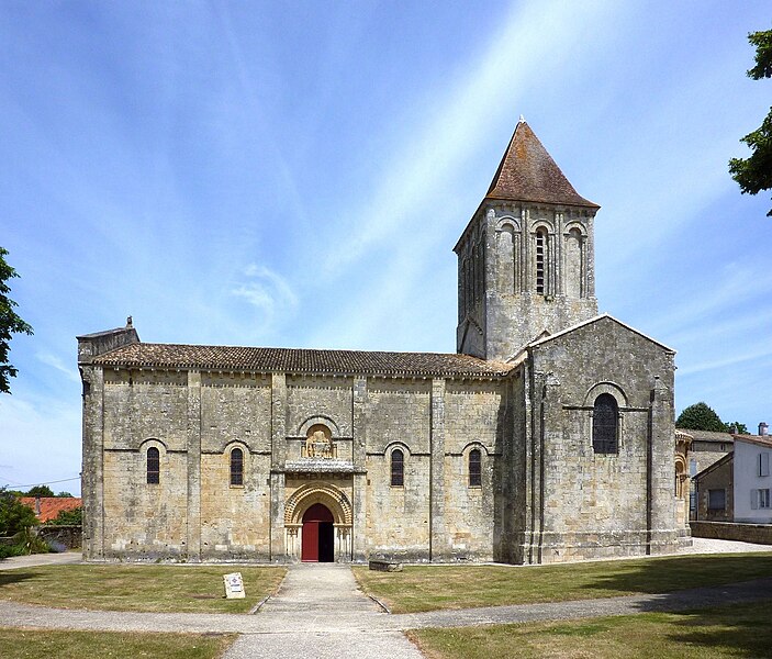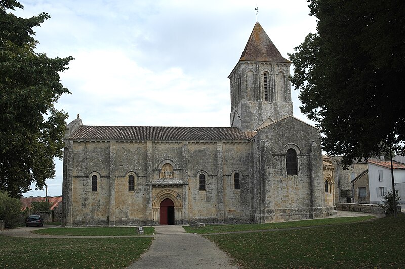 Le plan est simple : une large nef mène à un transept à bras plats flanqué de deux absidioles qui contrebutent l'abside centrale du chevet. La croisée du transept est surmontée d'une tour carrée percée de quatre baies étroites et coiffée d'un toit pyramidal daté de 1466. À l'extérieur, la façade occidentale reste sobre tandis que le chevet et les absidioles présentent un riche décor sculpté, notamment des archivoltes de fenêtres ornées de motifs géométriques. Le flanc sud conserve un portail latéral dont les voussures montrent des animaux de l'Apocalypse et les signes du zodiaque; il est surmonté d'une niche abritant une statue mutilée du Christ entre la Vierge et saint Jean. Entre le portail et la niche, une corniche soutenue par des modillons représente des centaures, l'Agneau pascal et les symboles des évangélistes; sous la corniche du chevet figurent des masques humains et des têtes d'animaux, et l'un des chapiteaux montre deux paons se faisant la roue.