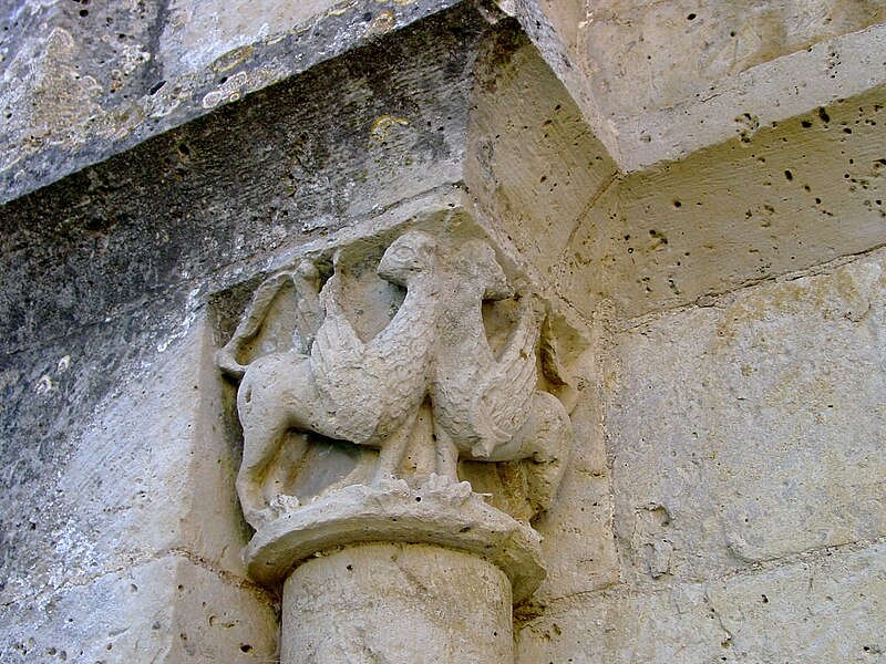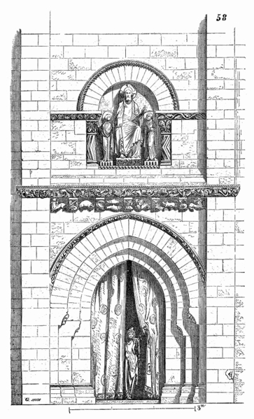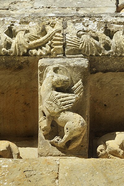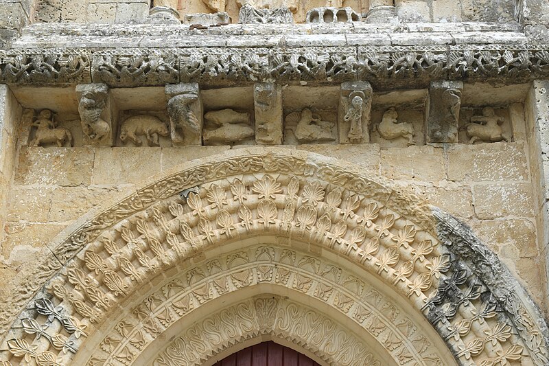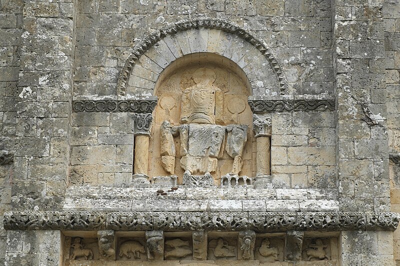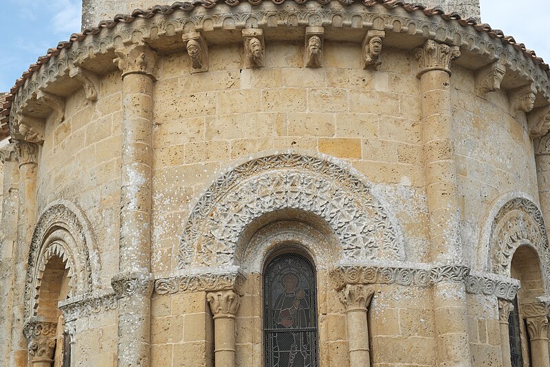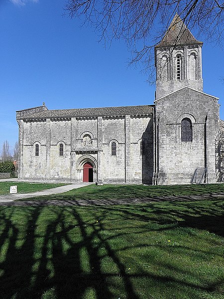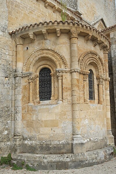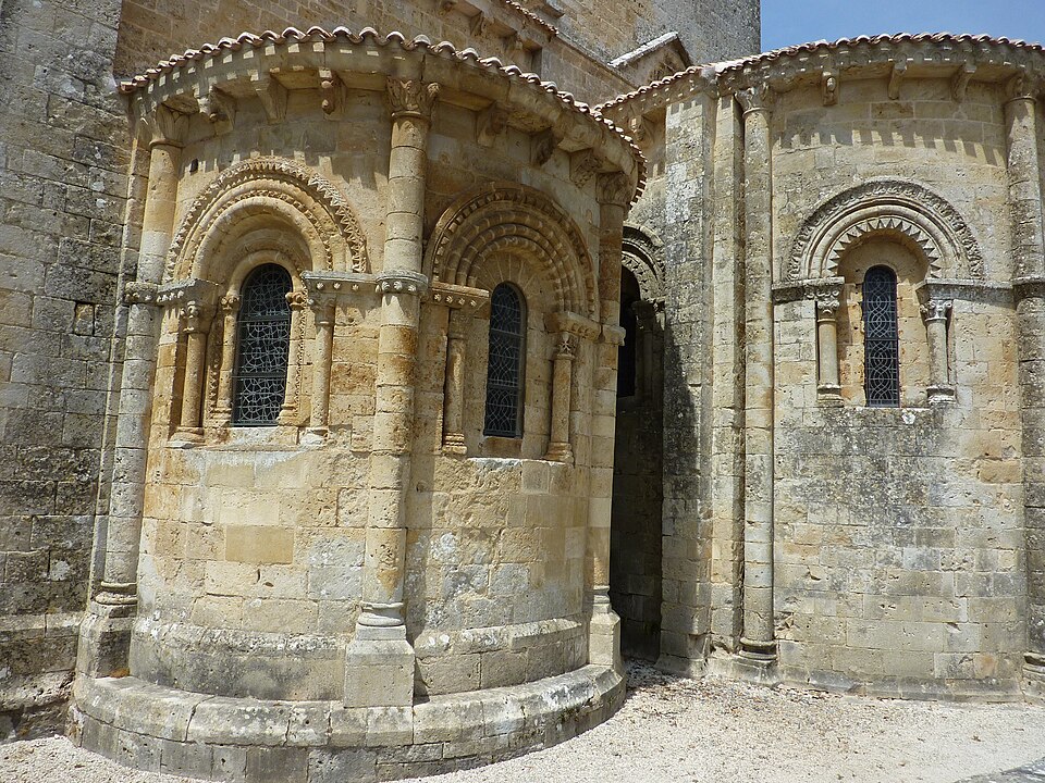 Le plan est simple : une large nef mène à un transept à bras plats flanqué de deux absidioles qui contrebutent l'abside centrale du chevet. La croisée du transept est surmontée d'une tour carrée percée de quatre baies étroites et coiffée d'un toit pyramidal daté de 1466. À l'extérieur, la façade occidentale reste sobre tandis que le chevet et les absidioles présentent un riche décor sculpté, notamment des archivoltes de fenêtres ornées de motifs géométriques. Le flanc sud conserve un portail latéral dont les voussures montrent des animaux de l'Apocalypse et les signes du zodiaque; il est surmonté d'une niche abritant une statue mutilée du Christ entre la Vierge et saint Jean. Entre le portail et la niche, une corniche soutenue par des modillons représente des centaures, l'Agneau pascal et les symboles des évangélistes; sous la corniche du chevet figurent des masques humains et des têtes d'animaux, et l'un des chapiteaux montre deux paons se faisant la roue.