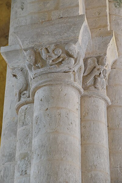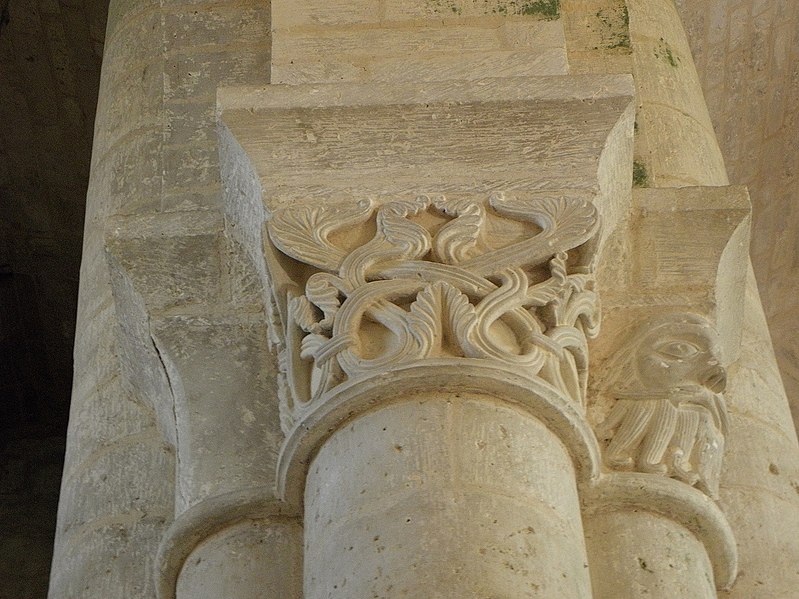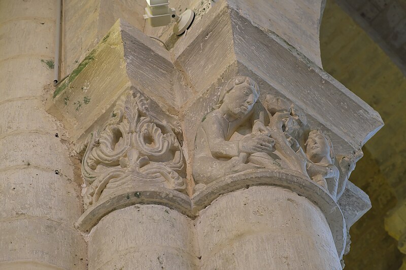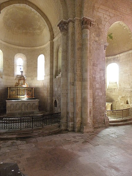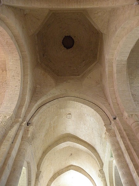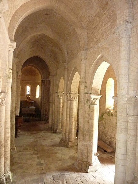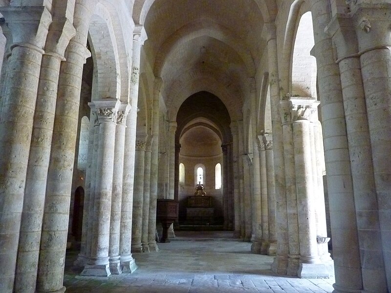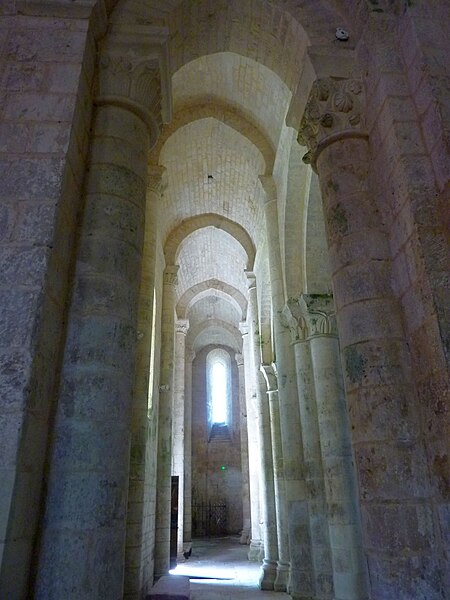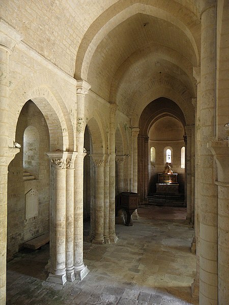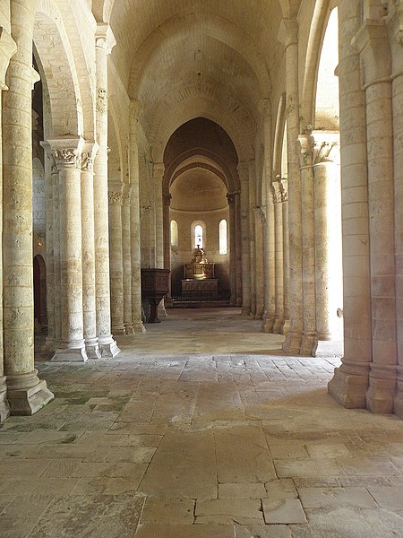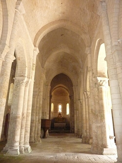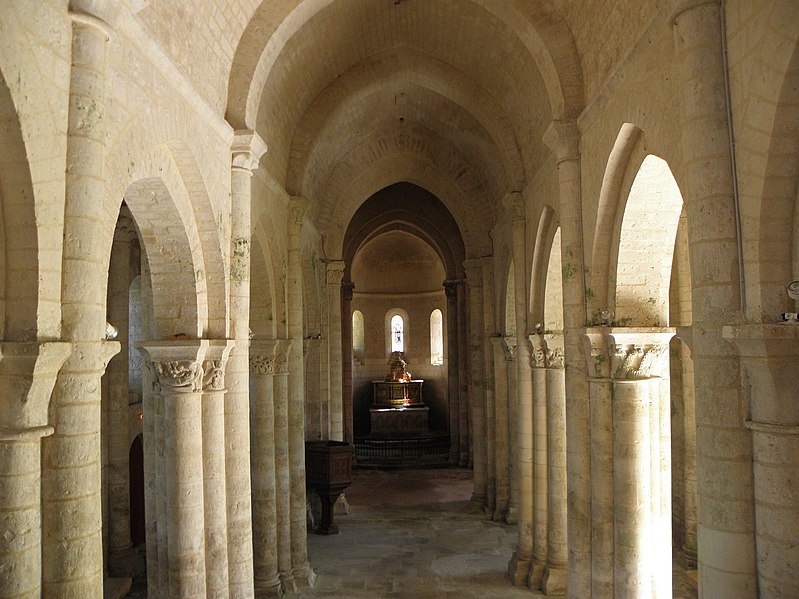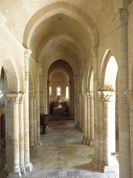 À l'intérieur, la nef est divisée en trois vaisseaux voûtés en berceaux brisés et organisée en cinq travées par huit piliers composés de quatre colonnes flanquées de quatre colonnettes. Deux des plus remarquables chapiteaux figurent la Mise au tombeau et le Tireur d'épine, thème apprécié des pèlerins, tandis que d'autres présentent un masque barbu, un ange, deux oiseaux affrontés, deux chimères et un griffon. La croisée est couverte par une coupole octogonale sur trompes et le pavé de la nef conserve plusieurs pierres tombales du XVIIIe siècle.