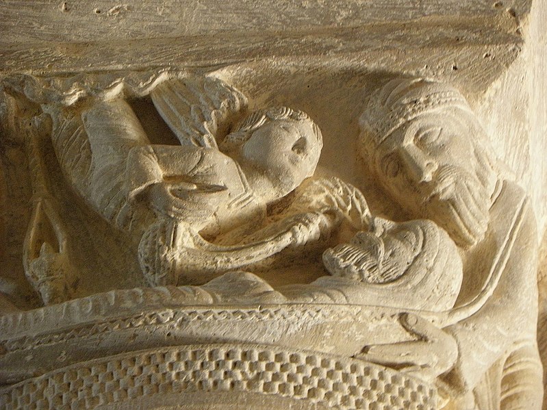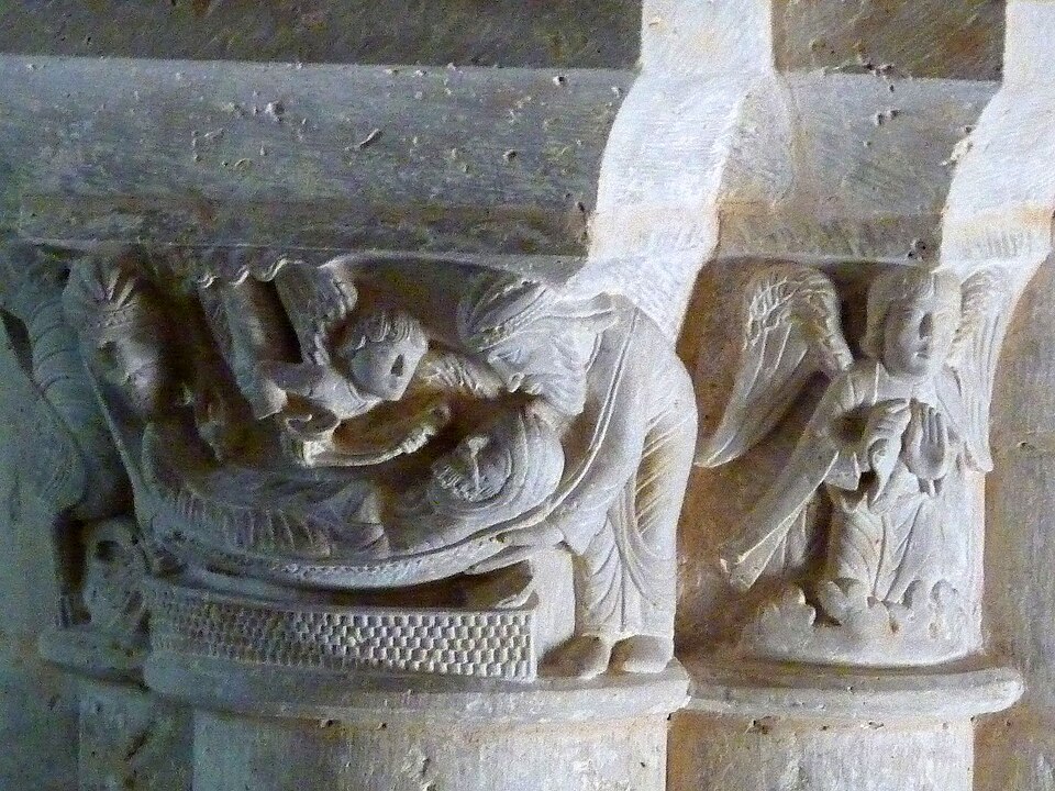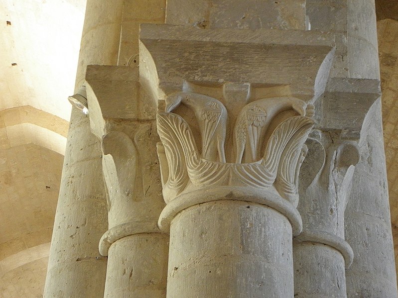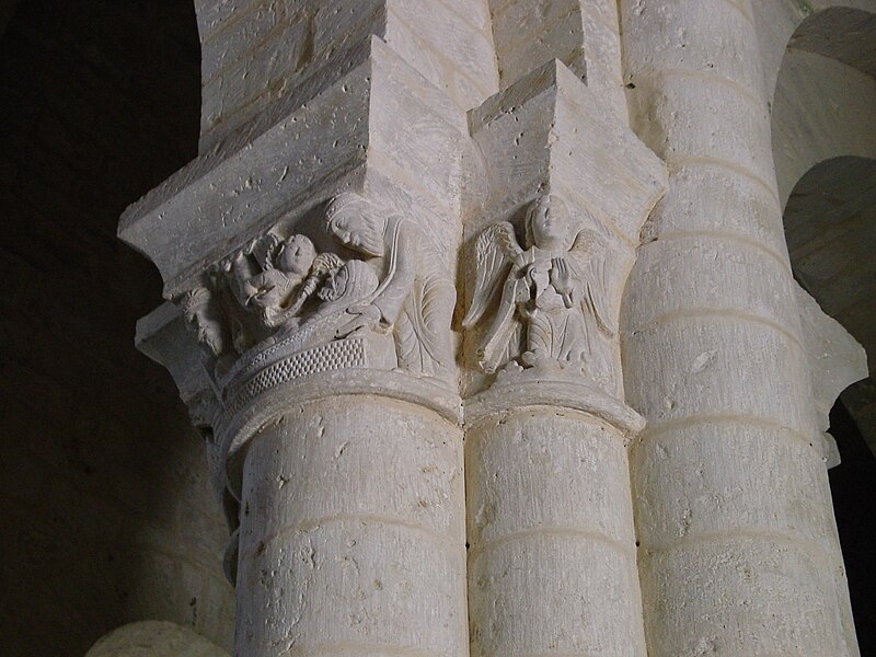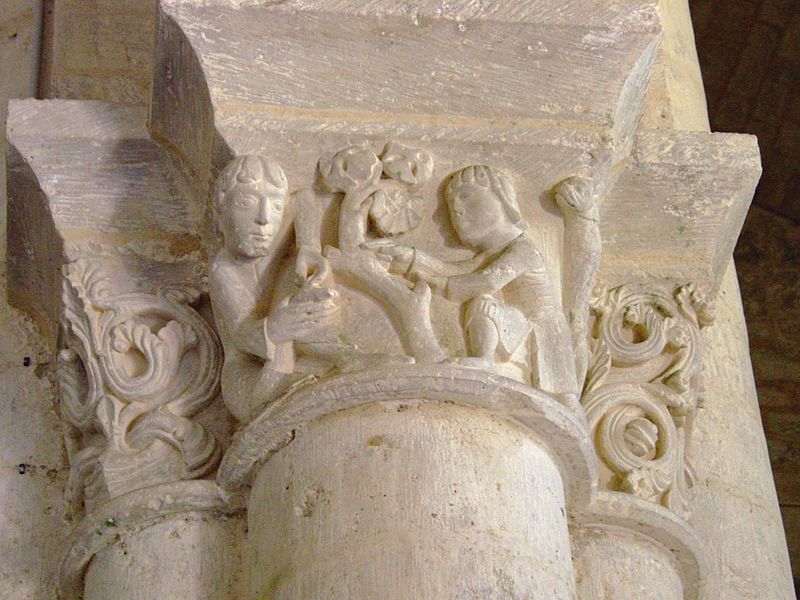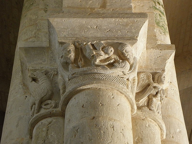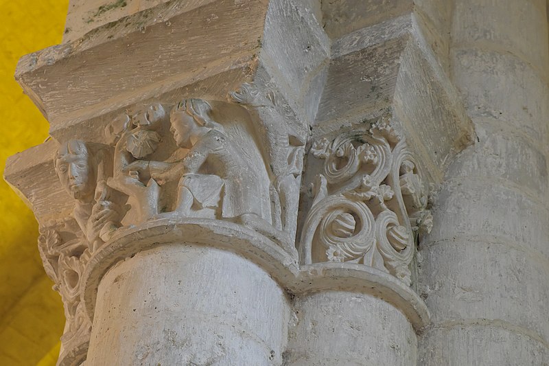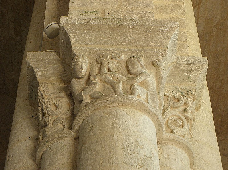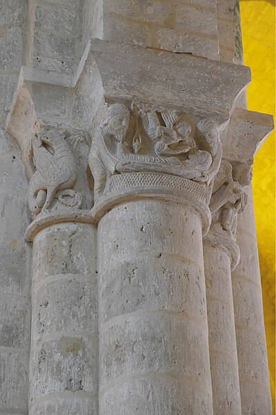 À l'intérieur, la nef est divisée en trois vaisseaux voûtés en berceaux brisés et organisée en cinq travées par huit piliers composés de quatre colonnes flanquées de quatre colonnettes. Deux des plus remarquables chapiteaux figurent la Mise au tombeau et le Tireur d'épine, thème apprécié des pèlerins, tandis que d'autres présentent un masque barbu, un ange, deux oiseaux affrontés, deux chimères et un griffon. La croisée est couverte par une coupole octogonale sur trompes et le pavé de la nef conserve plusieurs pierres tombales du XVIIIe siècle.