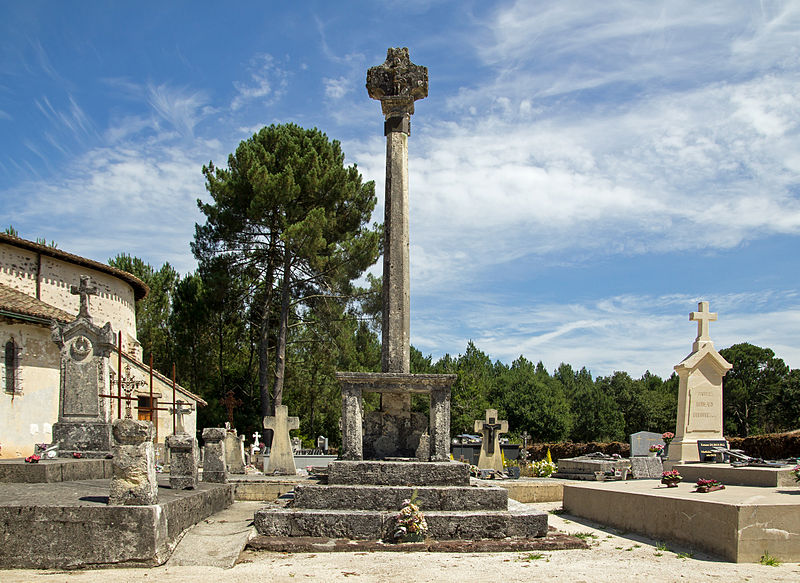 À l'extérieur, une pierre levée à demi enterrée derrière le chœur intrigue par son origine non locale et sa fonction indéterminée ; la présence, dans les environs de Mons, de mégalithes comme le dolmen de Braou à Belin, la Main du Diable à Lugos, et d'outils en silex trouvés à Salles et au Barp atteste une occupation humaine ancienne de la région. La croix du cimetière, datée du XVIe siècle et inscrite au titre des monuments historiques depuis le 24 avril 1987, se dressait en 1815 dans le bourg de Belin avant d'être déplacée à son emplacement actuel ; elle s'élève à quatre mètres, repose sur un piédestal et une colonne scellée au plomb, porte un crucifix sur sa face nord et les clés papales sur sa face sud. La croix dite des pèlerins, imposant monument apparenté à un obélisque haut d'environ 4,50 mètres et posé sur une colonne élevée fixée à un socle de sept marches, date du XVe ou du XVIe siècle ; sa fonction originelle reste discutée (amer terrestre, croix de sauvetat ou marque de sépulture des compagnons de Roland) et elle est inscrite à l'inventaire des monuments historiques depuis le 9 janvier 1990.