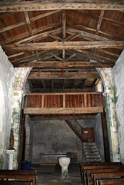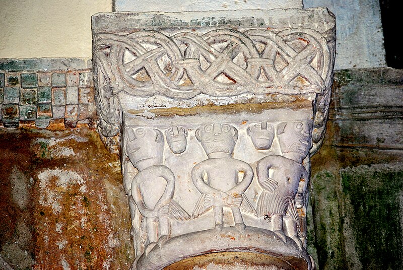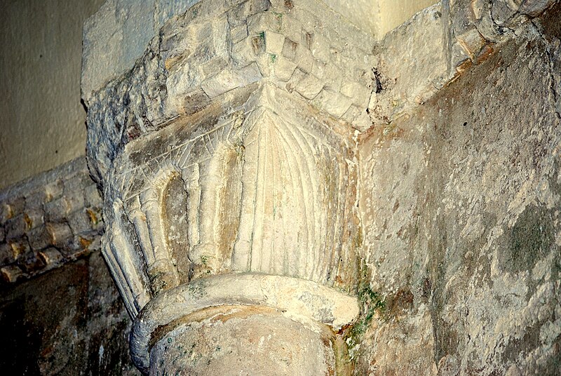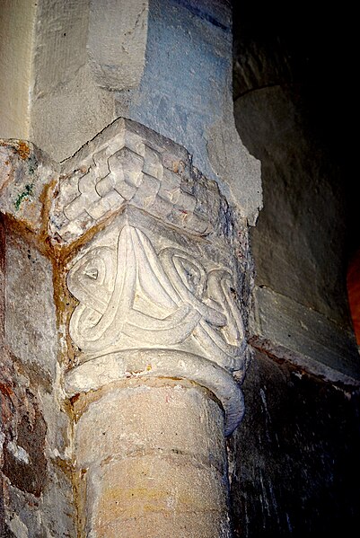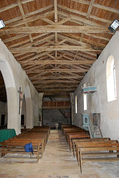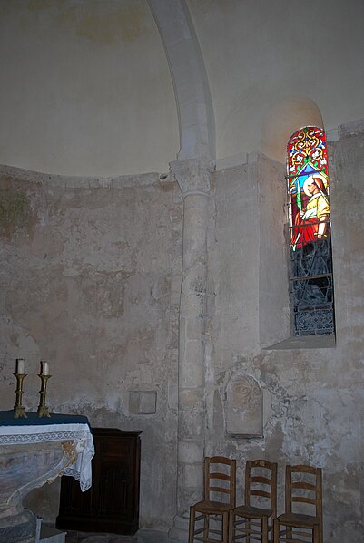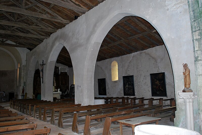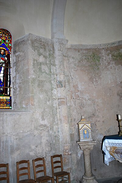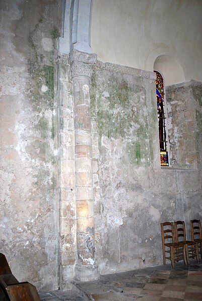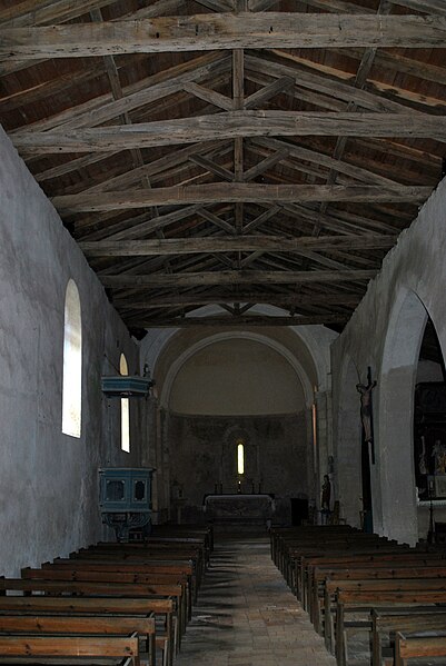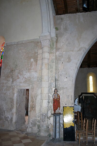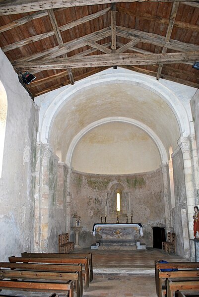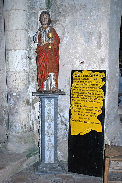 L'intérieur de l'église est sobre ; le décor sculpté se concentre dans la partie romane du chœur et du chevet. La nef communique avec le chœur par un arc triomphal en ogive, et le chœur est relié à l'abside par un autre arc ogival. Six chapiteaux datés du XIIe siècle ornent la baie axiale et les colonnes du chœur : ceux de l'arc triomphal présentent, au nord, une corbeille à rinceaux surmontée d'une frise d'oiseaux et, au sud, une corbeille figurant cinq personnages en tuniques courtes accompagnés de deux masques, interprétés tour à tour comme compagnons de Roland ou martyrs de saint Clair. Autour du chevet court un cordon à damier ; au nord du chœur une corbeille montre une triple arcature en plein cintre et des feuilles gravées, tandis qu'au sud on trouve un entrelacs simple. La baie axiale comporte, sur le chapiteau nord, trois paires de poissons aux écailles apparentes ; sur le chapiteau sud figurent des scènes complexes avec un quadrupède écailleux tenant une proie, une créature renversée aux défenses, et, sur l'autre face, deux hommes en robes longues aux manches très amples et aux chaussures pointues.