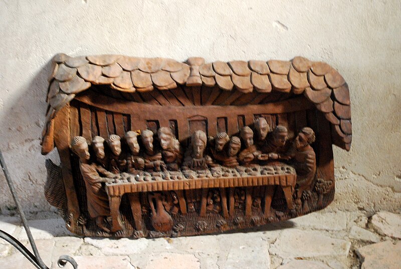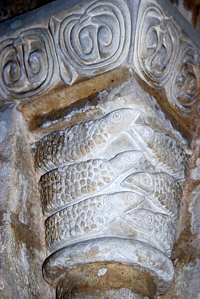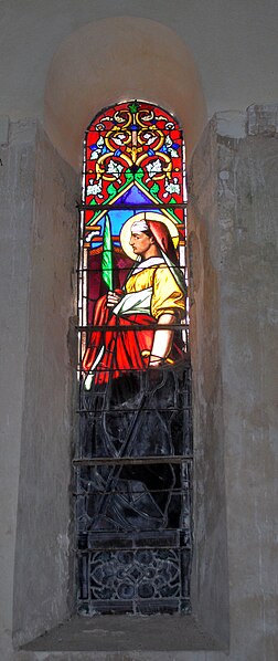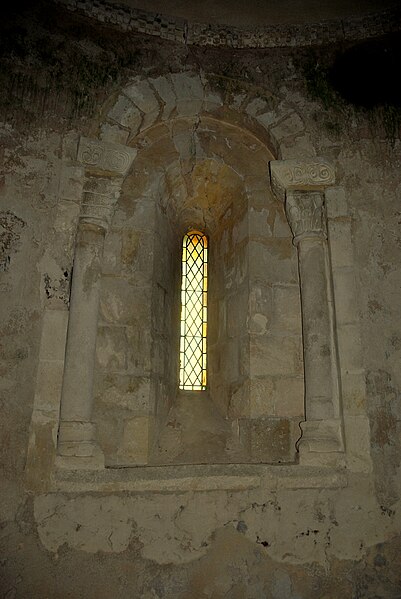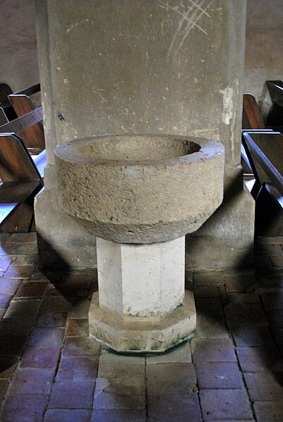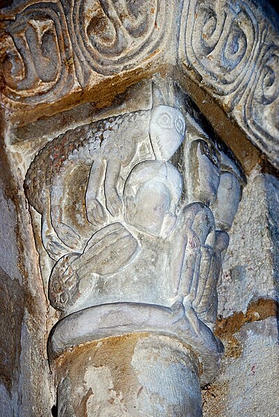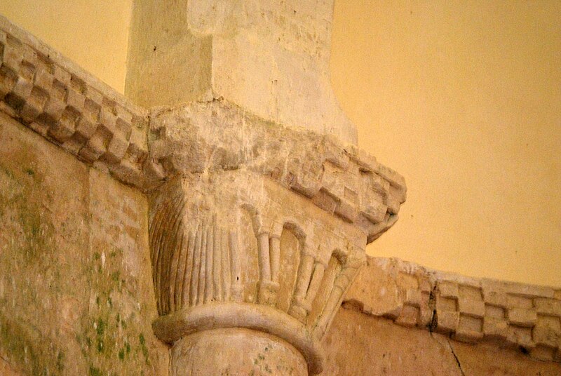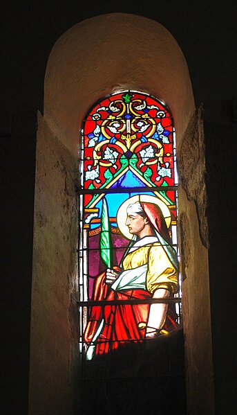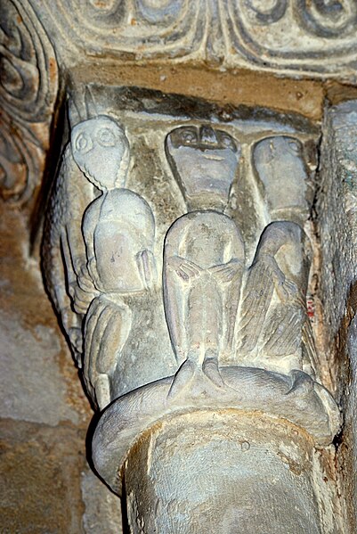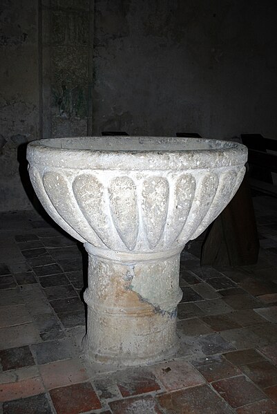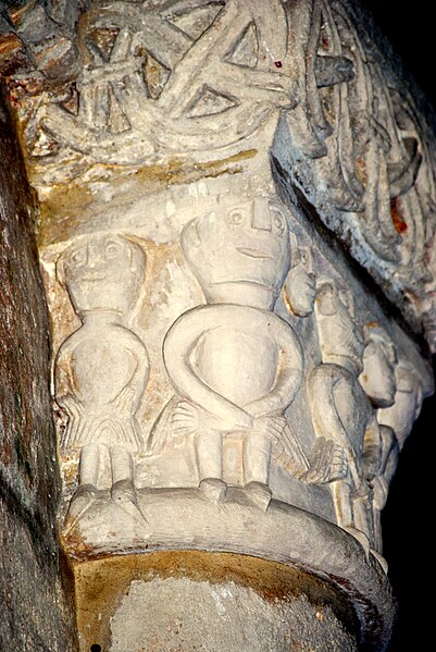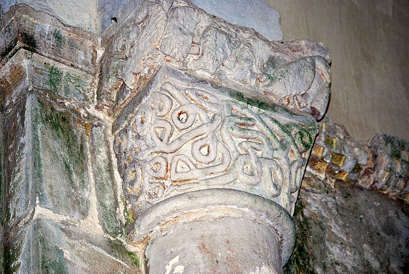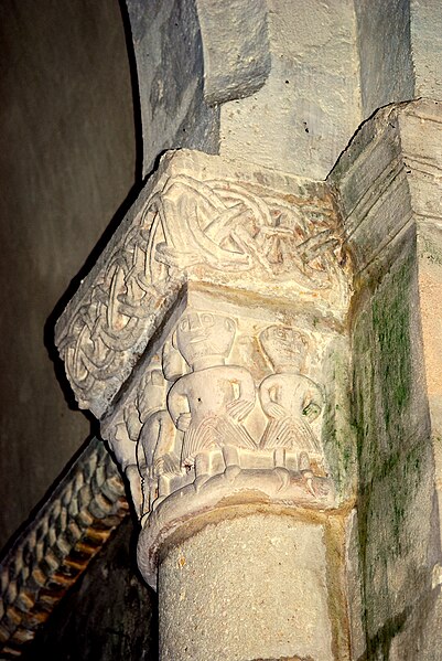 L'intérieur de l'église est sobre ; le décor sculpté se concentre dans la partie romane du chœur et du chevet. La nef communique avec le chœur par un arc triomphal en ogive, et le chœur est relié à l'abside par un autre arc ogival. Six chapiteaux datés du XIIe siècle ornent la baie axiale et les colonnes du chœur : ceux de l'arc triomphal présentent, au nord, une corbeille à rinceaux surmontée d'une frise d'oiseaux et, au sud, une corbeille figurant cinq personnages en tuniques courtes accompagnés de deux masques, interprétés tour à tour comme compagnons de Roland ou martyrs de saint Clair. Autour du chevet court un cordon à damier ; au nord du chœur une corbeille montre une triple arcature en plein cintre et des feuilles gravées, tandis qu'au sud on trouve un entrelacs simple. La baie axiale comporte, sur le chapiteau nord, trois paires de poissons aux écailles apparentes ; sur le chapiteau sud figurent des scènes complexes avec un quadrupède écailleux tenant une proie, une créature renversée aux défenses, et, sur l'autre face, deux hommes en robes longues aux manches très amples et aux chaussures pointues.