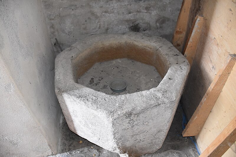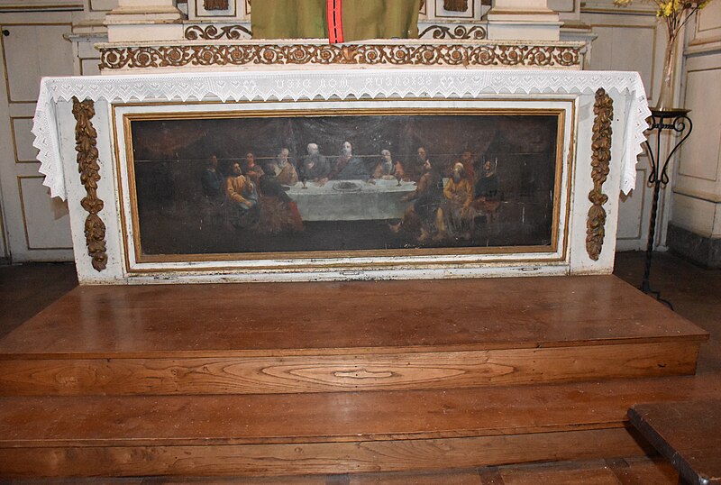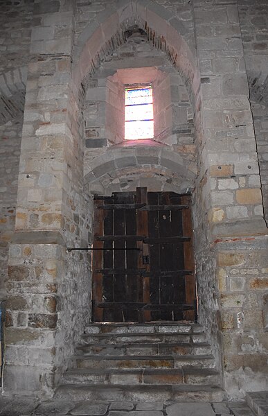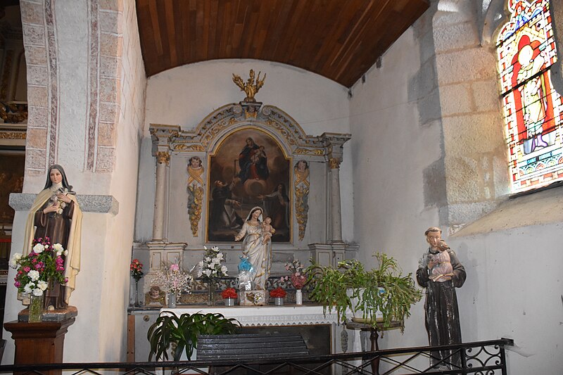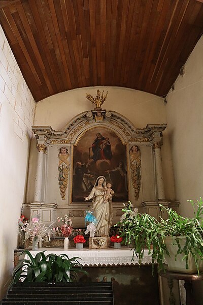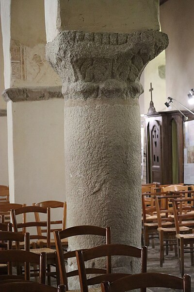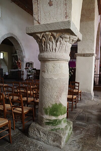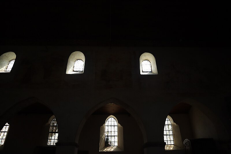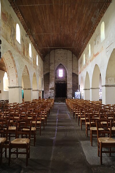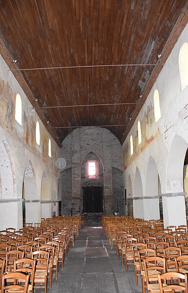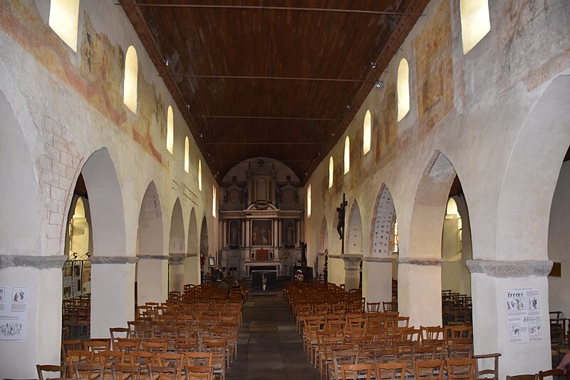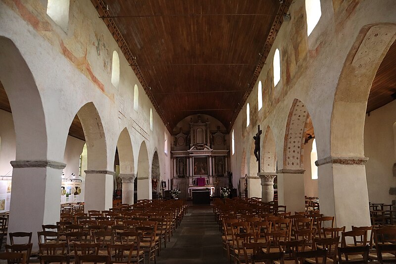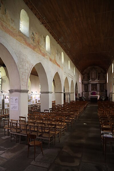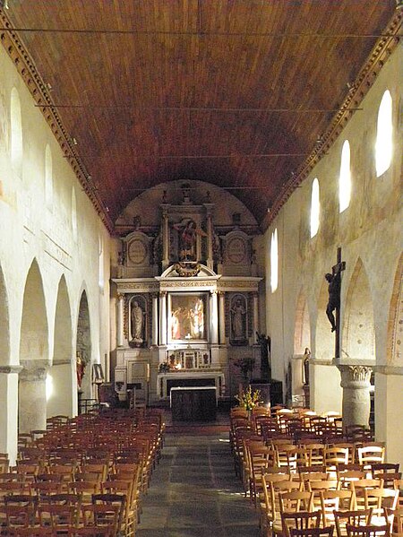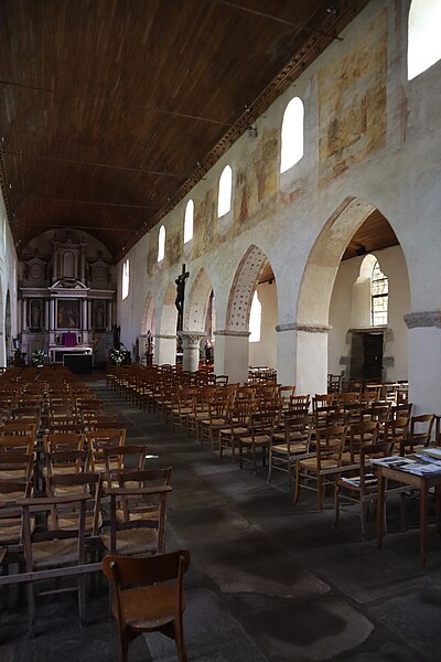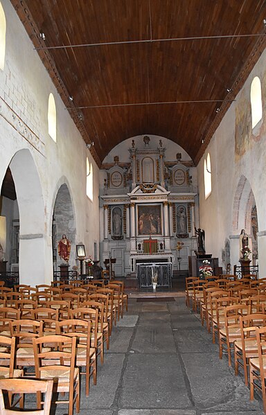 De plan basilical sans transept, l'église offre un vaisseau central flanqué de collatéraux ; l'élévation de la nef est à deux niveaux, avec six grandes arcades ogivales reposant sur des piliers carrés (à l'exception de deux colonnes munies de chapiteaux marquant l'ancien accès au chœur), et des fenêtres hautes étroites en plein cintre. La nef est couverte d'un doublis de bois en berceau et s'achève par un chevet plat abritant un grand retable en bois daté des XVIIe–XIXe siècles.
