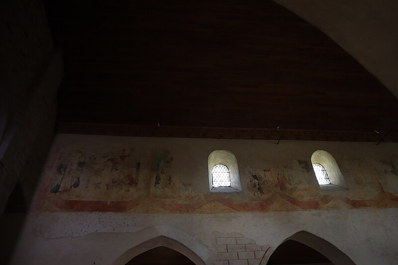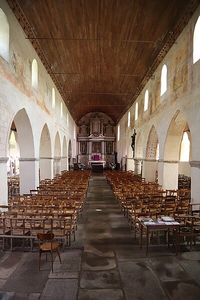 L'édifice est particulièrement renommé pour son ensemble de peintures murales médiévales. Des fragments de peintures du XIIe siècle, représentant un appareillage orné de frises et de feuillages, subsistent mais furent largement recouverts aux XIVe et XVe siècles par des décors représentant la Passion et l'Enfer. Sur les murs nord et sud du vaisseau principal se conserve un cycle exceptionnel des XVe siècles consacré à la Passion et à la Résurrection du Christ, couvrant notamment les deux premières travées au nord et les travées deux à six au sud ; ces peintures, découvertes en 1864 puis à nouveau mises au jour en 1971 après avoir été masquées sous un badigeon, ont été classées le 16 mars 1971 et figurent parmi les ensembles médiévaux les plus importants d'Ille-et-Vilaine. La fresque de l'Enfer, située sur le mur sud de la première travée, illustre les tourments infligés aux damnés : un diable pousse une charrette pleine de condamnés, un démon chevauche une femme damnée, se succèdent les supplices de la roue, des pendus à l'arbre de la connaissance du bien et du mal, la vision de Satan dévorant un enfant tandis que sa mère brûle, et la chute des âmes dans l'abîme. Ces compositions, comme l'ensemble des décors muraux, ont fait l'objet de campagnes de protection et de restauration afin d'en préserver la lisibilité.