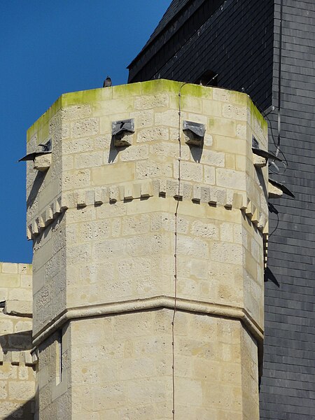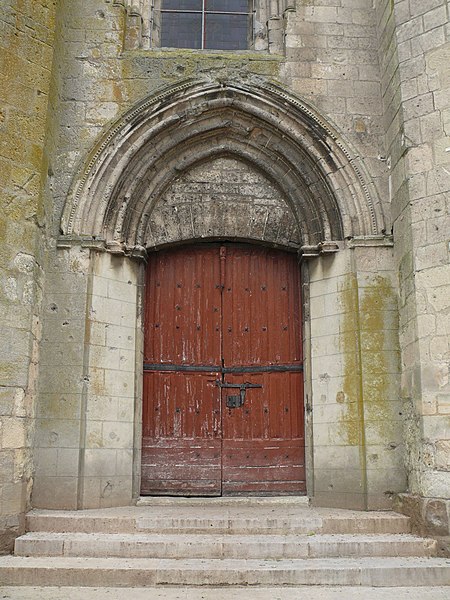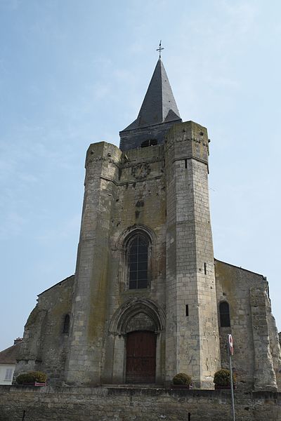 La façade occidentale est dominée par les tourelles octogonales percées de meurtrières et couronnées d'une balustrade reliée par un passage ouvert ; ces éléments, associés à des gargouilles, donnent à l'édifice un aspect militaire qui traduit la volonté affichée de le fortifier. La grande fenêtre en arc brisé au-dessus du portail, flanquée de colonnettes à chapiteaux et surmontée d'une archivolte torique, atténue néanmoins ce caractère défensif. Le portail occidental, richement archivolté, a retrouvé depuis 2012 des colonnettes et des éléments de chapiteaux restitués, bien que certains chapiteaux restent des blocs bruts ; son linteau suit un arc en anse de panier et supporte un tympan non décoré.