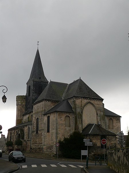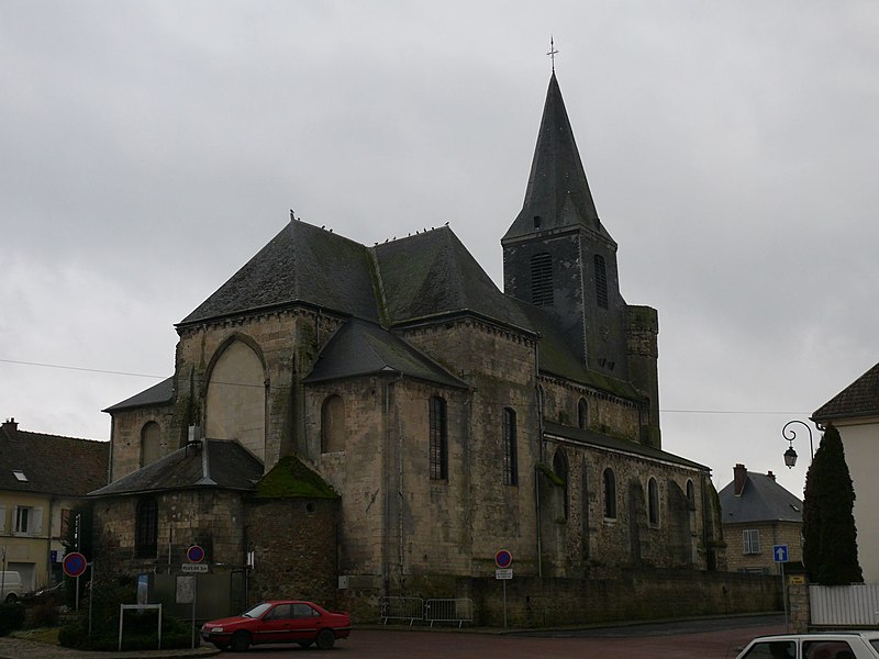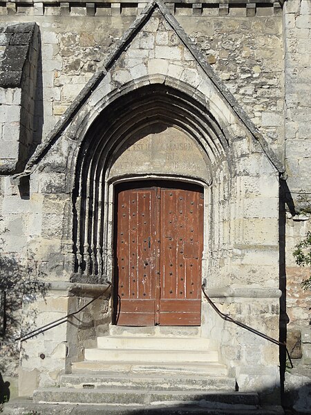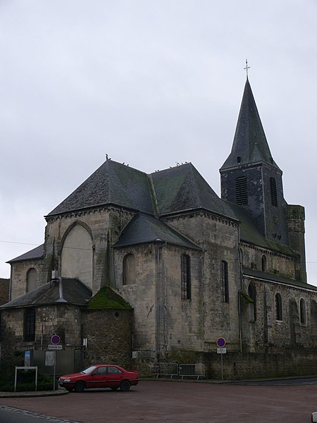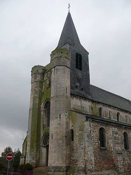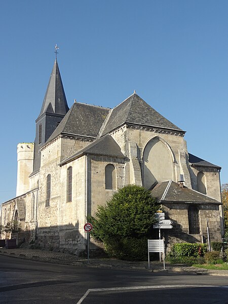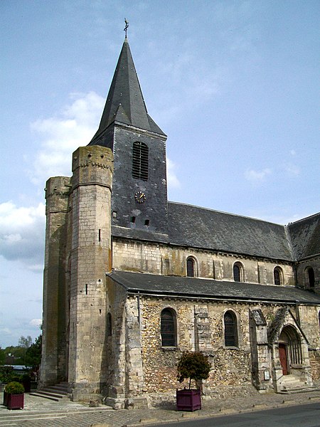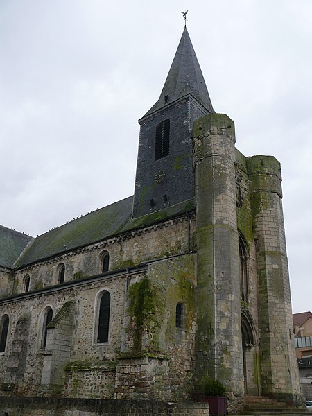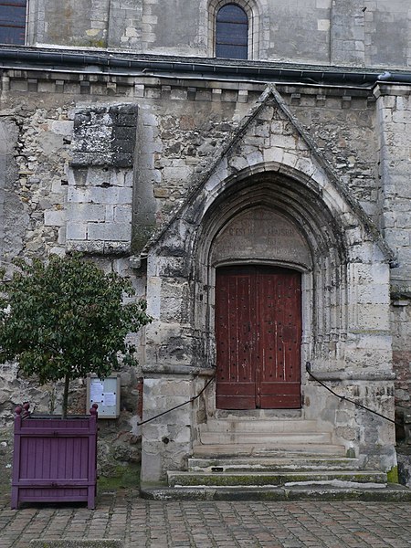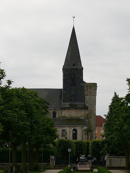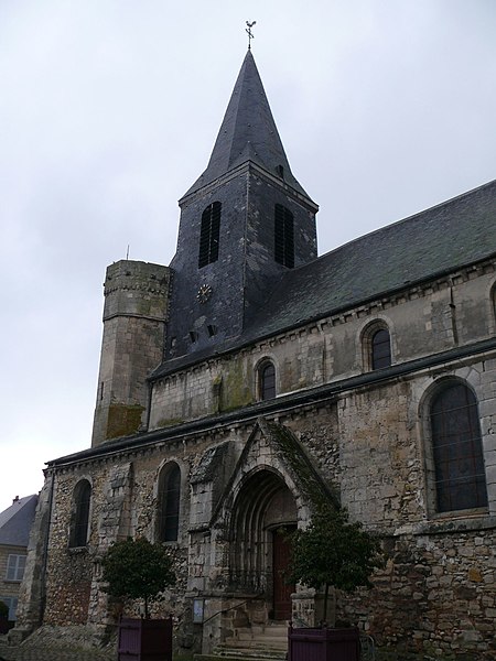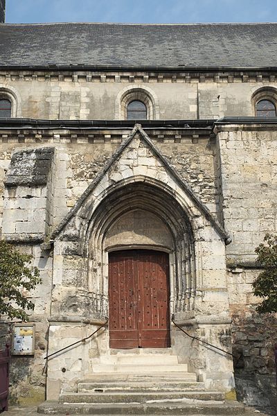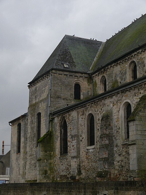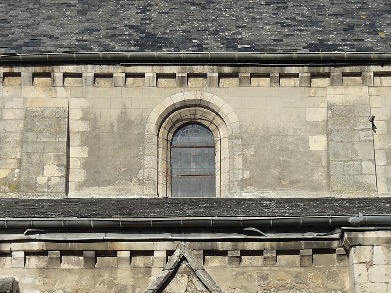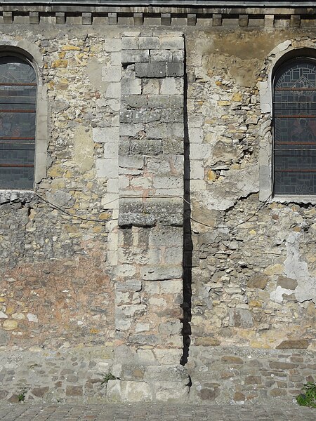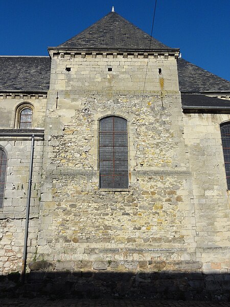 Latéralement, le clocher est en charpente et les murs hauts de la nef sont épaulés par des contreforts plats d'allure romane, terminés par une corniche sommaire ; les fenêtres hautes en plein cintre présentent un double ébrasement et des claveaux chanfreinés. Les bas-côtés sont couverts de toits en appentis faiblement inclinés afin de préserver l'éclairement des fenêtres de la nef. Le portail latéral sud, à la troisième travée, adopte des formes gothiques flamboyantes avec un gâble aigu et une sextuple archivolte prismatique, tandis que le tympan porte encore des traces d'une inscription.