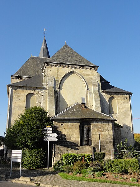 Le mobilier comprend dix-sept vitraux polychromes datés d'environ 1956, réalisés en verre acrylique pour des décors géométriques et en verre antique pour des vitraux figurés illustrant les vertus portées par divers saints ; deux vitraux sont attribués à Pauline Peugniez, les autres à Adeline Hébert-Stevens et Paul Bony. Parmi les éléments d'intérêt mobilier figurent des bancs de fidèles clos par des portières, un banc d'œuvre au dossier rocaille, des stalles et un ensemble homogène du XVIIIe siècle, ainsi que deux châsses-reliquaires en bois doré imitant des édicules Renaissance et contenant, selon la tradition, des reliques offertes par le cardinal César d'Estrées. La statue de saint Pierre sous la tribune d'orgue s'inspire d'un modèle vaticanais ; des statues et tableaux d'époques diverses complètent l'ensemble, dont une Déploration datée et restaurée et une Descente de Croix en mauvais état.