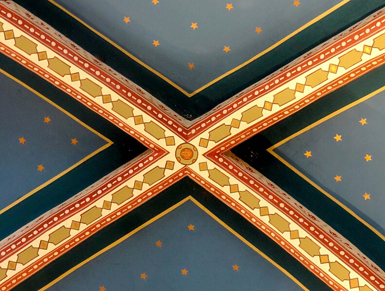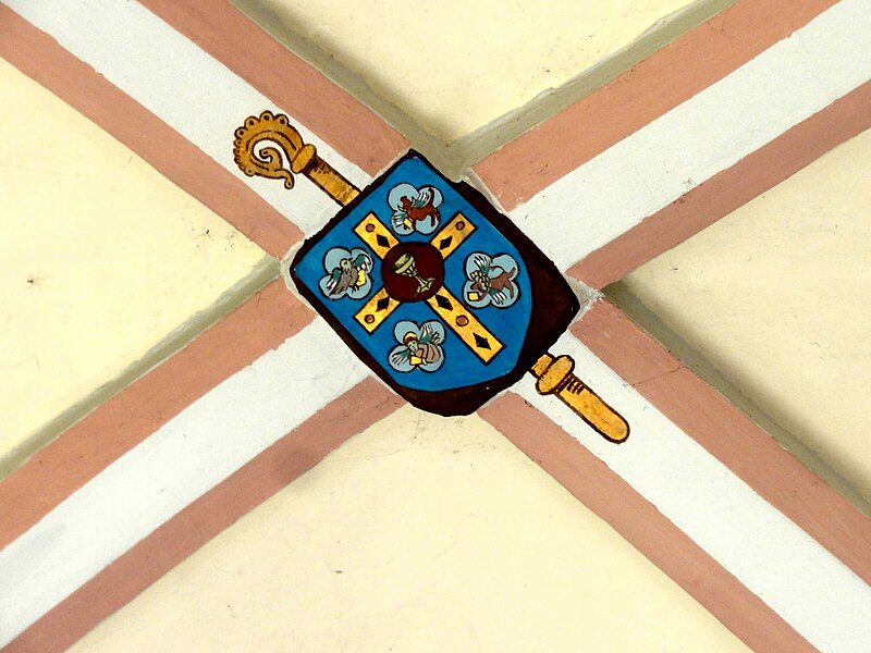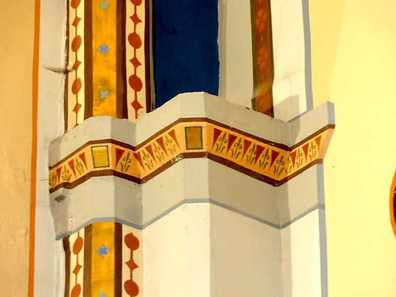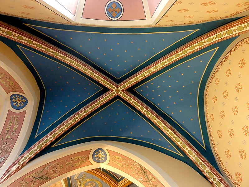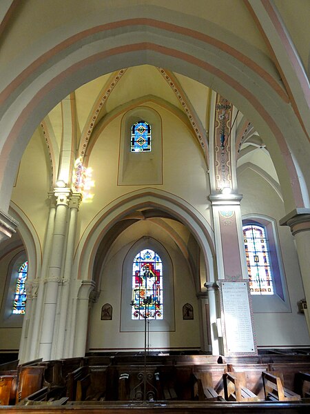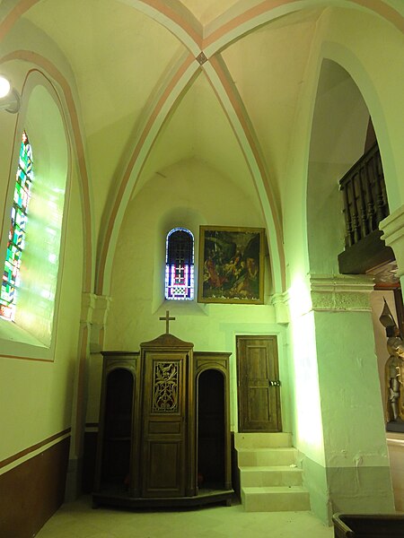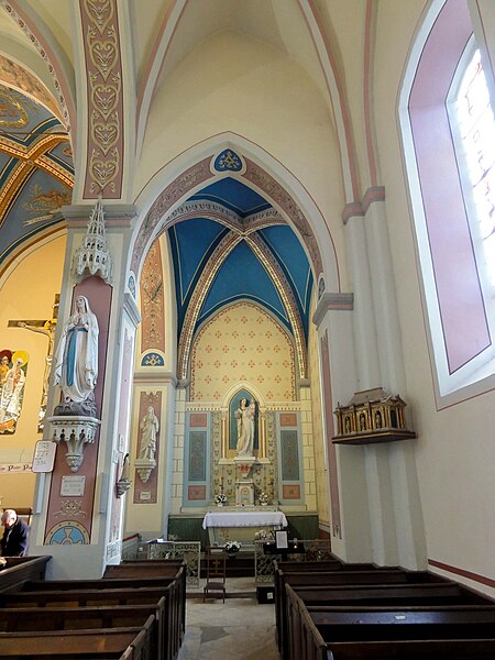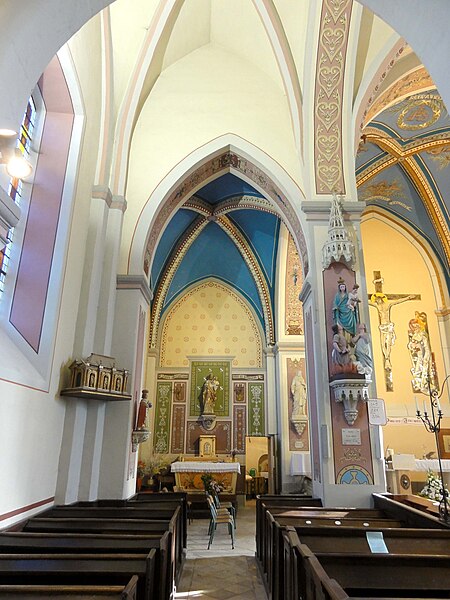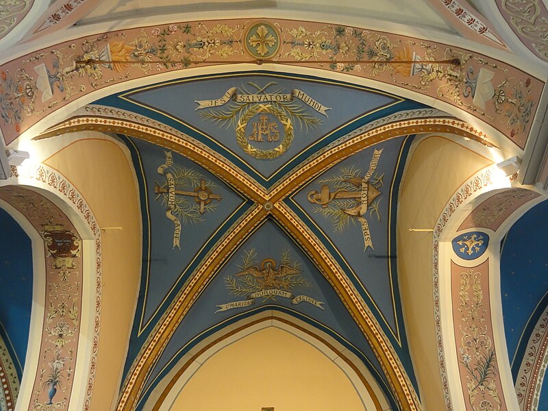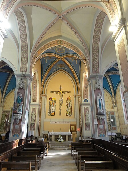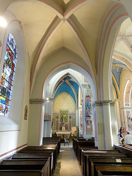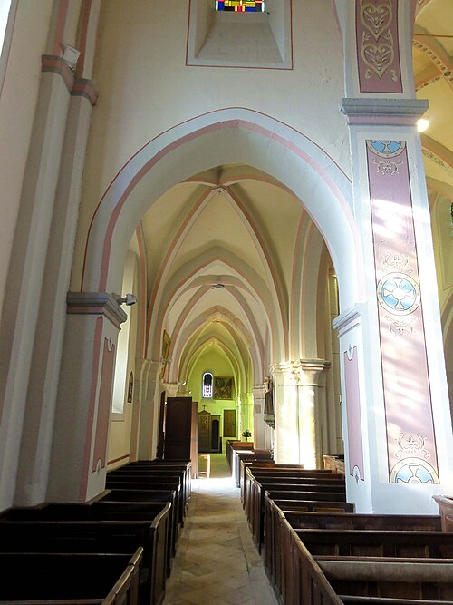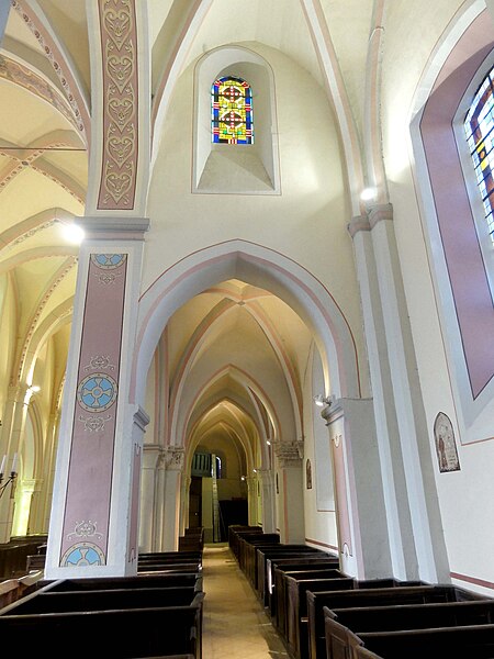 La transition vers le transept et les parties orientales résulte de reprises datées des XVIIe–XVIIIe siècles qui ont modifié les piles et les doubleaux, introduisant des tailloirs à profil classique et des fenêtres en anse de panier ; ces interventions ont conservé l'emploi d'arcades et de voûtes en tiers-point afin d'assurer une continuité stylistique. La polychromie architecturale récente restitue une lisibilité décorative qui fait défaut en l'absence de ces décors.