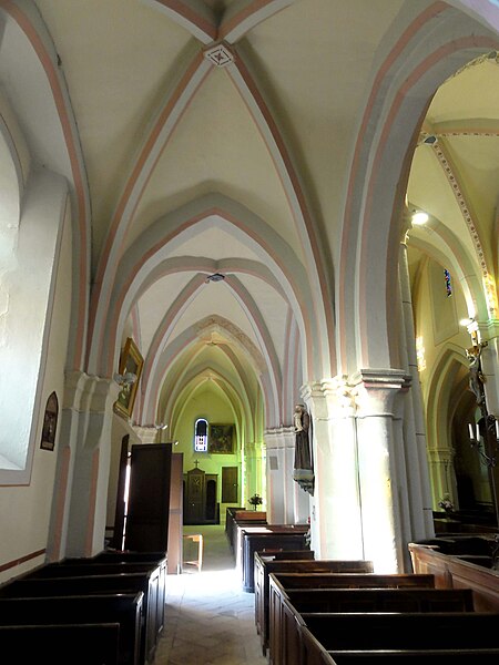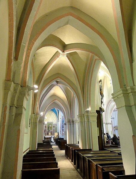 À l'intérieur, la nef présente une élévation à deux niveaux dominée par des arcades en tiers-point et des voûtes d'ogives sans mouluration, les arcs et nervures étant simplement chanfreinés. Les supports témoignent de deux campagnes de construction : certaines travées plus anciennes reposent sur des faisceaux de colonnettes et des chapiteaux sculptés de feuillages stylisés, de lions et de chimères d'inspiration romane, tandis que d'autres parties adoptent des pilastres à ressauts et des corbeilles carrées dépourvues d'ornement, peut‑être par suite de mutilations ou d'évolutions de goût aux XVIIe–XVIIIe siècles. Cette absence de mouluration généralisée donne à la nef une apparence rudimentaire, mais l'originalité des supports en fait un ensemble remarquable.
