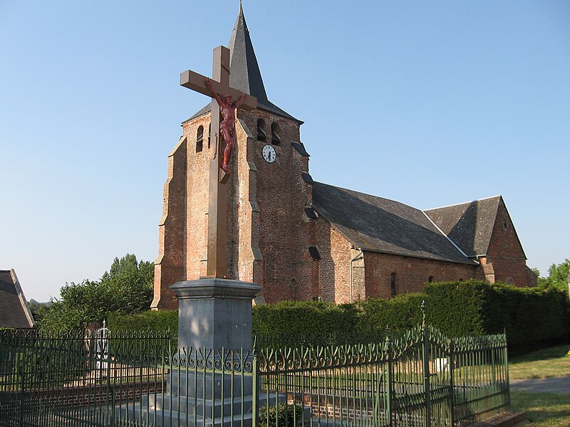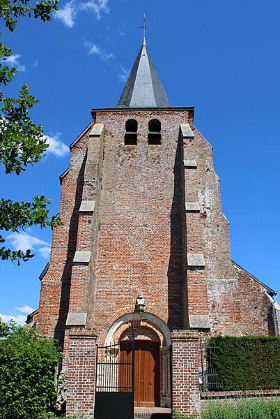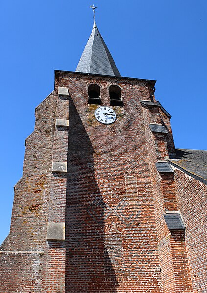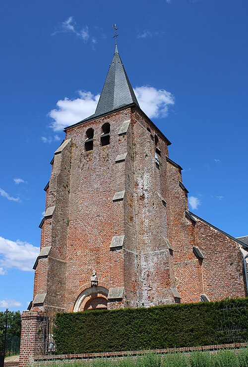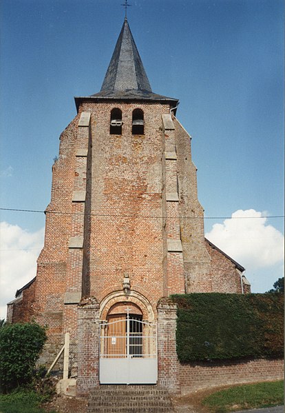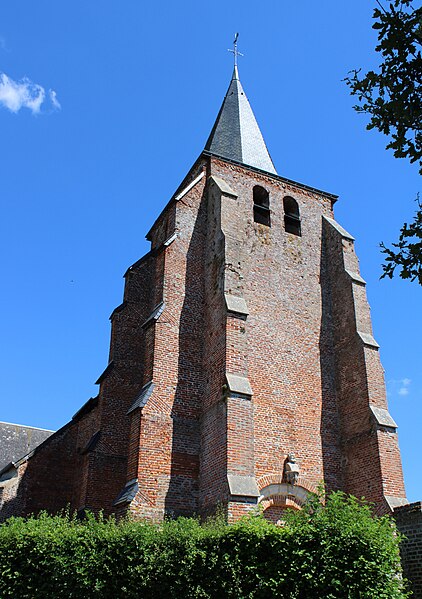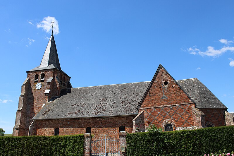 L'église Saint-Pierre, située à Saint-Pierre-lès-Franqueville (Aisne), est construite entièrement en brique, à l'exception du portail roman de la façade ouest, issu d'un réemploi. La nef, épaulée de collatéraux et séparée de ceux-ci par des arcades reposant sur des piles octogonales, est précédée d'un clocher‑porche à quatre étages qui présente des traces de meurtrières. L'édifice comprend un petit transept orné de losanges en briques vitrifiées et un chœur désaxé par rapport à la nef. Des meurtrières percées à hauteur d'homme sont visibles sur les murs de la nef et du chœur. D'une grande homogénéité historique et stylistique, l'église est très représentative des constructions rebâties au XVIe siècle dans la région de Vervins et présente certaines similitudes avec l'église de cette ville. Le clocher‑porche a principalement été conçu pour servir de refuge, les éléments de fortification y restant toutefois discrets. Le monument a été inscrit au titre des monuments historiques en 1989. Pour une description détaillée, consulter la monographie de M. Leroy (instituteur) publiée sur le site des Archives départementales de l'Aisne en 1880. Des notices et ressources complémentaires sont accessibles dans les bases Mérimée, Clochers de France et l'Observatoire du patrimoine religieux, ainsi que sur les portails consacrés aux monuments historiques, à l'architecture chrétienne et au catholicisme.