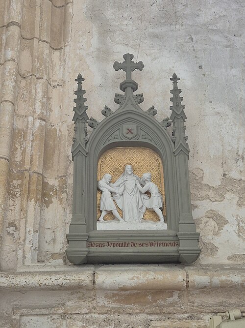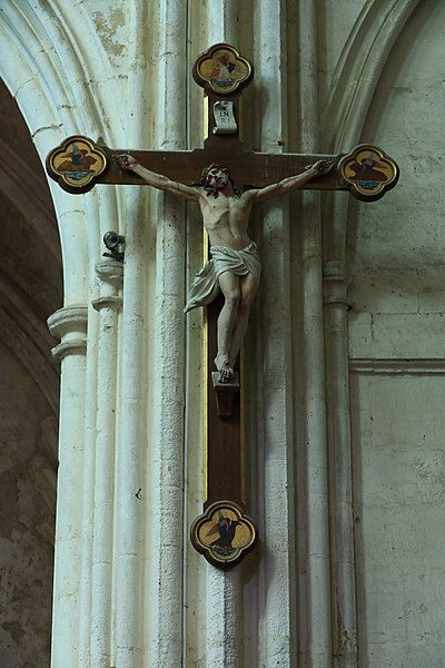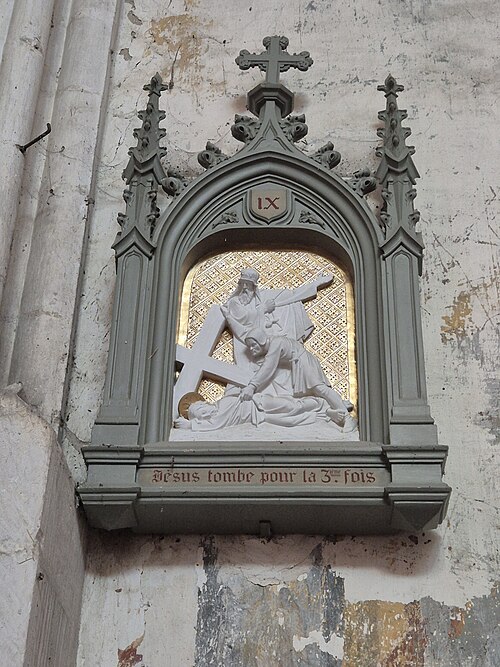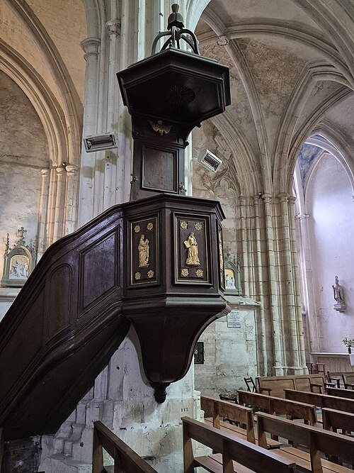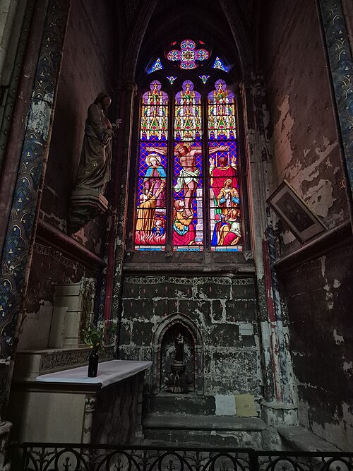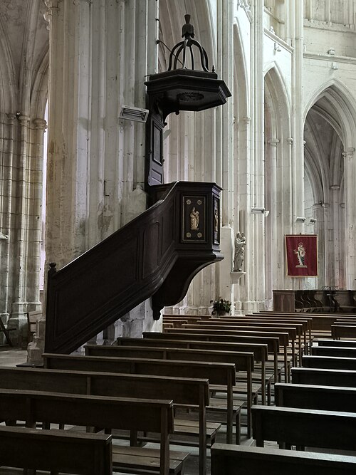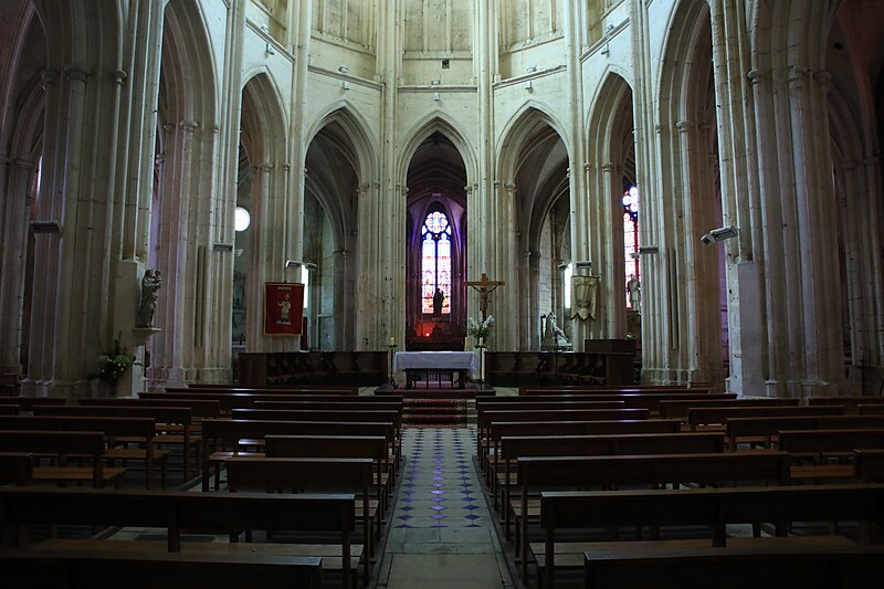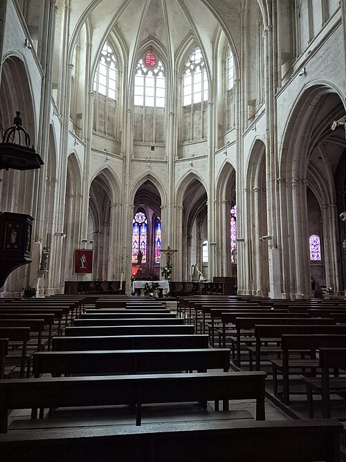Le chœur, flanqué de bas-côtés et d’un déambulatoire, est entouré de sept chapelles dont cinq chapelles rayonnantes. De grandes arcades séparent le vaisseau central des bas-côtés ; au-dessus des piles un passage de circulation traverse l’église sous des fenêtres qui occupent toute la surface de chaque travée. Les piliers, très élevés, portent une voûte d’apparence légère. Les chapelles conservent pour la plupart des vitraux du XIXe siècle et le maître-autel est de style baroque. Parmi les sculptures et mobiliers, on remarque notamment une statue de saint Roch et une imposante mise au tombeau du XVIIIe siècle qui a été restaurée.