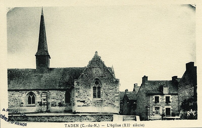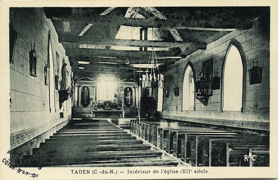 L'église Saint-Pierre de Taden, dans les Côtes-d'Armor (Bretagne), est un petit édifice d'orientation liturgique dont la construction remonte au XIVe siècle et qui a été profondément modifié aux XIXe et XXe siècles. Le bâtiment se compose d'un unique vaisseau à plan très allongé, d'un chevet plat et de deux chapelles latérales bordant le chœur ; un porche précède l'entrée et la nef est surmontée d'un clocher à flèche octogonale. Les baies sont équipées de vitraux contemporains et l'intérieur se caractérise par une grande simplicité. Des sondages réalisés en 2003 puis la dépose du retable ont mis au jour des décors peints de grande qualité, couvrant une chronologie allant du XIVe au XVIIIe siècle. Une bulle papale de 1387 atteste qu'une chapelle y fut édifiée pour Geffroy de Quédillac en l'honneur de la Vierge, de saint Christophe et de sainte Catherine ; plusieurs baies de la nef et des chapelles latérales sont attribuables à cette campagne de la fin du XIVe siècle. La porte ouest de la chapelle sud, avec son linteau droit aux angles arrondis, renvoie à des modèles remarquables du début du XVe siècle. D'importants travaux au XVe siècle ont notamment conduit à l'installation d'une charpente lambrissée qui a masqué un décor peint antérieur placé au sommet du chevet. Les rampants très ornés du pignon de la chapelle sud — feuilles retournées, petits personnages et animaux — correspondent à une phase décorative de la première moitié du XVIe siècle et s'inscrivent dans la tradition des gables de la région. Une sacristie a été ajoutée contre la chapelle nord au XVIIe siècle. Les armoiries de Raoul Marot, acquéreur des seigneuries de la Garaye et de Taden au début du XVIIe siècle et titré ensuite vicomte puis comte, figurent dans l'embrasure intérieure d'une fenêtre de la nef et sur une pierre de la façade ouest ; sa pierre tombale et celle de son épouse se trouvent dans l'ancien enclos paroissial. Après des saccages lors de la Révolution l'édifice a fait l'objet de restaurations tout au long du XIXe siècle, dont l'ouverture de nouvelles baies dans la nef entre 1873 et 1880 sous la direction de Théophile Adam, et d'une restauration générale de l'architecture et du mobilier en 2017 coordonnée par l'architecte Frédérique Le Bec. Au-dessus de la charpente du chœur a été récemment mise au jour une peinture murale du XIVe siècle représentant le Christ auréolé d'un nimbe crucifère, les bras levés, accompagnée d'un chandelier d'autel à trois branches et d'autres signes sur fond blanc ; cette représentation exceptionnelle a pu être liée à une scène du Jugement dernier. D'autres vestiges peints apparaissent autour de la baie : un petit personnage bouclé et souriant, des faux appareillages, une moucheture d'hermines et des motifs de fleurs de lys, ainsi que deux litres seigneuriales peintes à des époques différentes. Les armoiries peintes comportent, d'un côté, celles des Ferré et, de l'autre, celles des Quédillac ; le contrat de mariage de 1512 entre Catherine de Quédillac et Bertrand Férré permet de situer une partie du décor dans la première moitié du XVIe siècle. Enfin, un décor d'accompagnement du retable, réalisé à la fin du XIXe siècle par D. Lavenant, complète l'ensemble des peintures découvertes. L'église Saint-Pierre est inscrite au titre des monuments historiques par arrêté du 15 mars 2012.