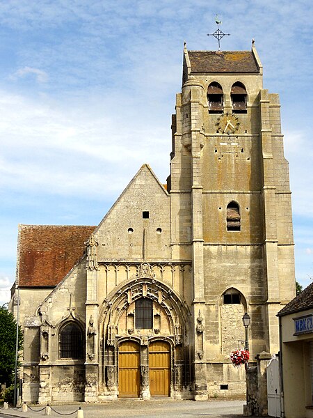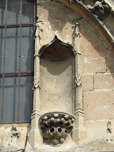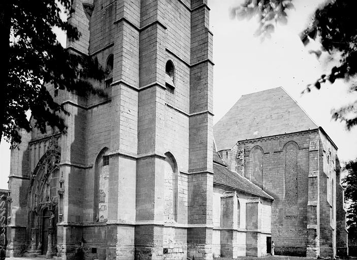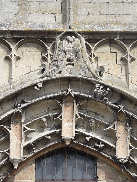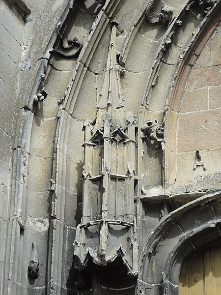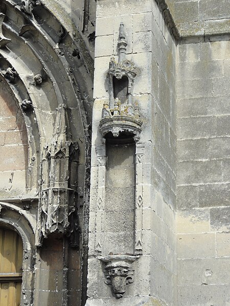 Sur la façade occidentale, le portail est encadré de contreforts ornés de niches à statue sous dais et d’un pinacle, et l’archivolte très large comporte plusieurs autres niches décorées ; le tympan ajouré d’une baie moderne et la profusion de petites sculptures (têtes, motifs végétaux) témoignent d’un décor soigné, tandis qu’une baie flamboyante éclaire le bas‑côté nord. Le clocher, haut de 33,2 m, est structuré par des larmiers horizontaux ; son rez‑de‑chaussée abrite une chapelle, les étages intermédiaires sont aveugles et l’étage supérieur est percé de baies abat‑son en cintre brisé, flanqué d’une échauguette ; parmi les cloches anciennes, deux fondues en 1681 et 1755 furent classées comme objets en 1912, mais seule la plus récente subsiste et porte un bas‑relief de la Vierge à l’Enfant.