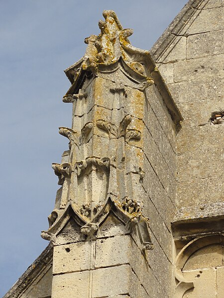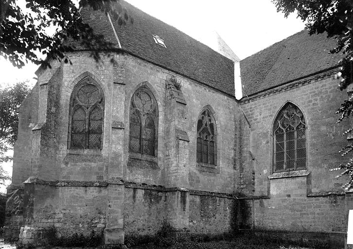 La nef et les bas‑côtés, datés de la fin du XVe ou du premier quart du XVIe siècle, relèvent du style flamboyant ; leurs toits en appentis empêchent l’ouverture de fenêtres hautes et les murs gouttereaux sont munis de corniches moulurées. Les contreforts rythment les travées et présentent des glacis et des décorations variées ; chaque travée s’ouvre par une fenêtre en tiers‑point sans remplage, tandis que les croisillons affichent des baies aux remplages flamboyants pour le nord et des lancettes étroites pour le sud, ce dernier présentant des éléments ornementaux hérités du XIIe siècle mais des contreforts et proportions qui éloignent son interprétation d’un modèle roman pur. Le chevet à pans coupés, de style gothique rayonnant, est composé de deux lancettes surmontées d’un oculus ; ses meneaux chanfreinés évoquent une datation entre 1260 et la fin du XIIIe siècle, tandis que les remplages flamboyants de la première travée du chœur résultent d’interventions postérieures.