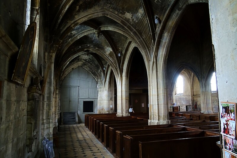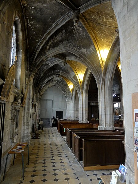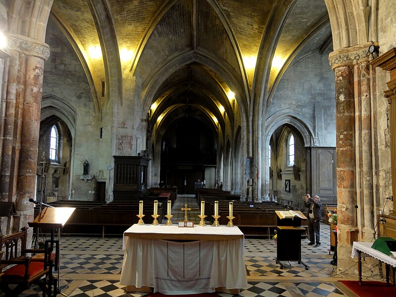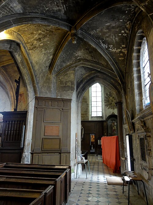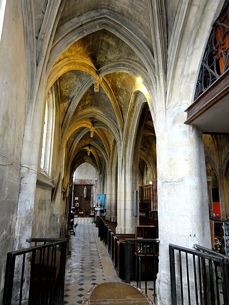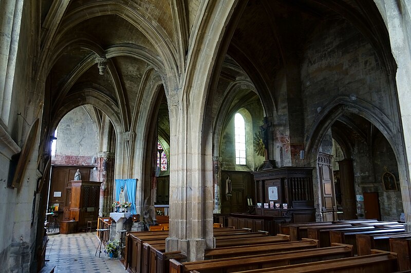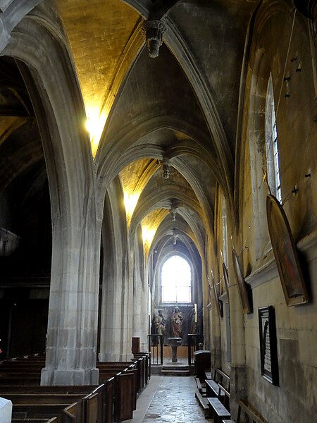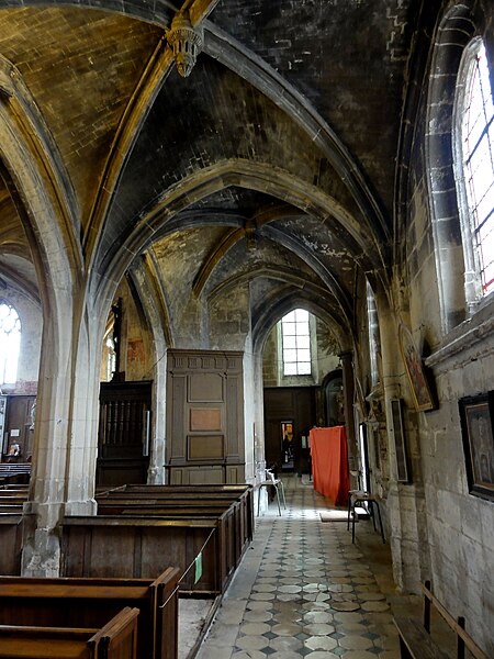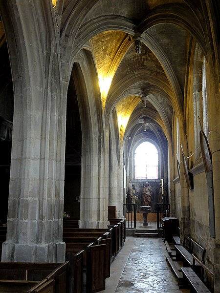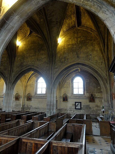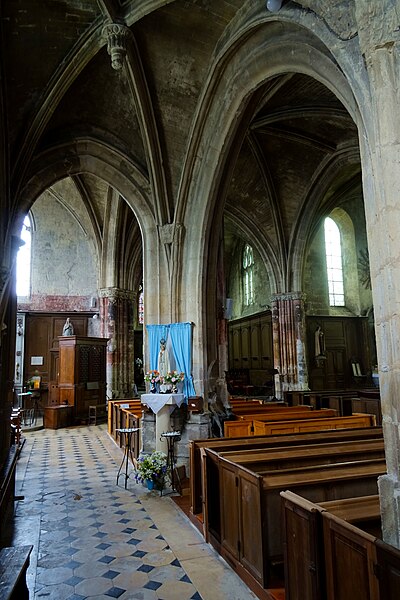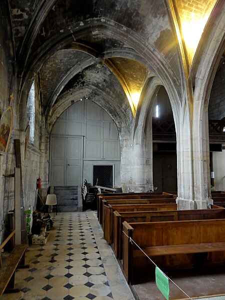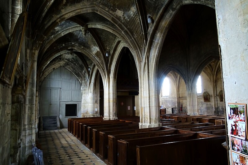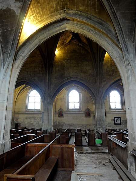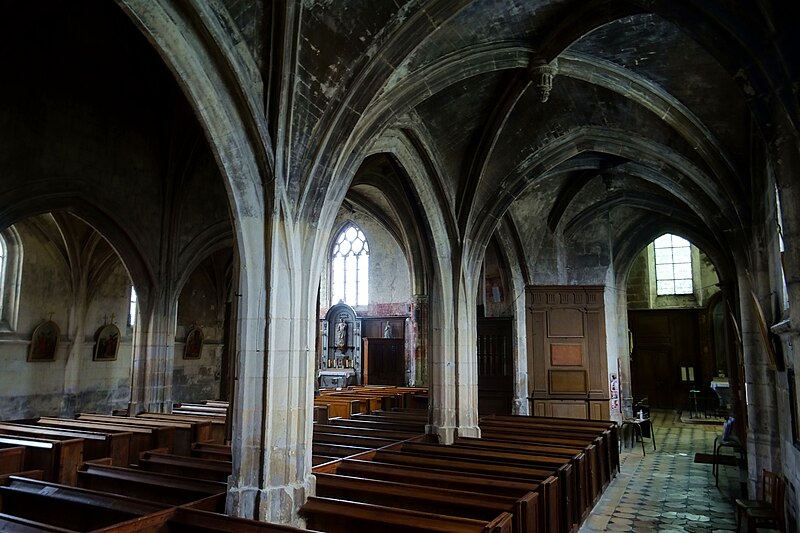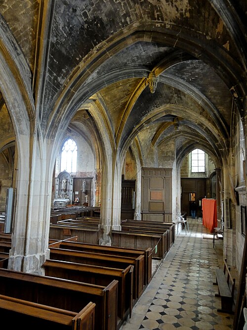 À l’intérieur, la nef paraît trapue et assez obscure, l’absence de fenêtres hautes n’étant pas compensée par des éclairages généreux dans les bas‑côtés ; les grandes arcades brisées qui relient la nef aux bas‑côtés présentent des moulurations variées et des nervures prismatiques pénétrantes sans chapiteaux, tandis que certains piliers ondulés, d’influence renaissante, soutiennent un doubleau puissant lié au clocher. Les voûtes de la nef comportent des croisées d’ogives avec liernes et, dans la troisième travée, une voûte décorative à liernes et tiercerons dont certains sont en quart‑de‑cercle ; la chapelle sous la base du clocher est cloisonnée et la tribune d’orgue occupe la première travée, obstruant la fenêtre du tympan occidental.