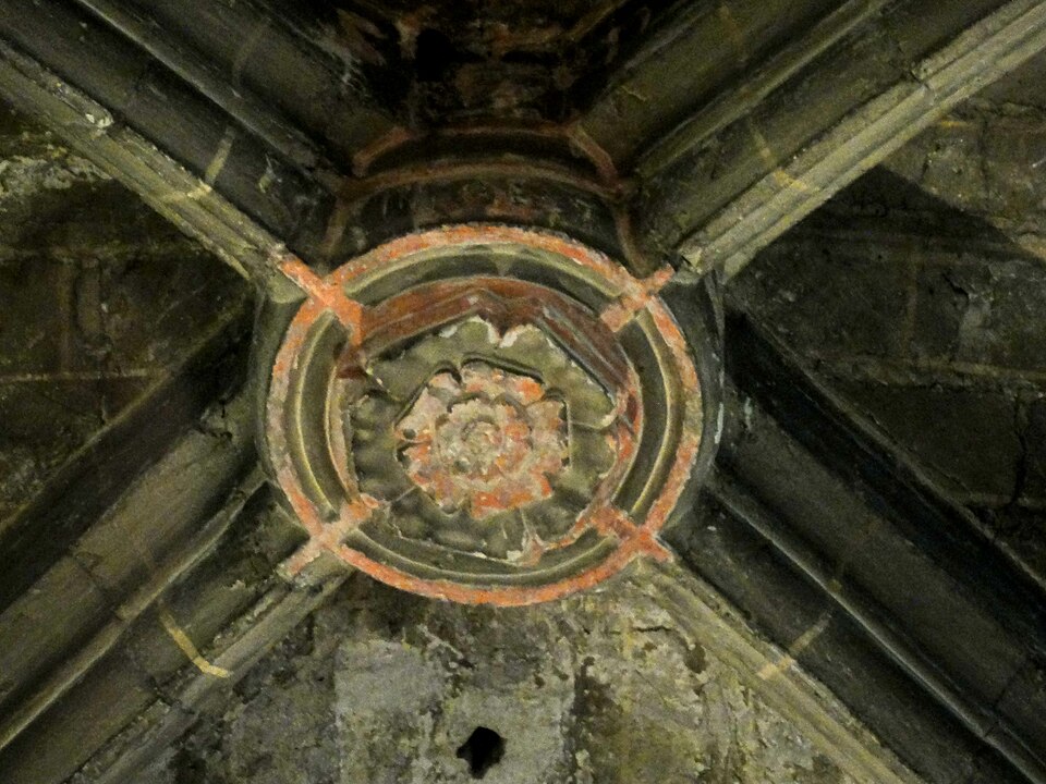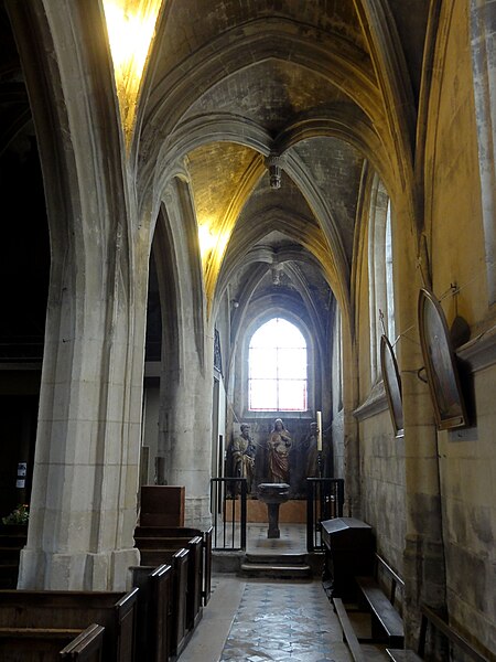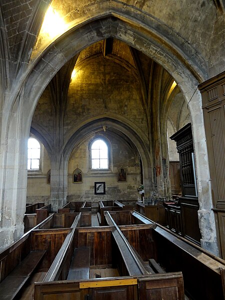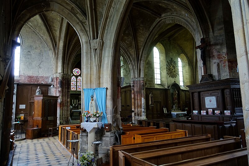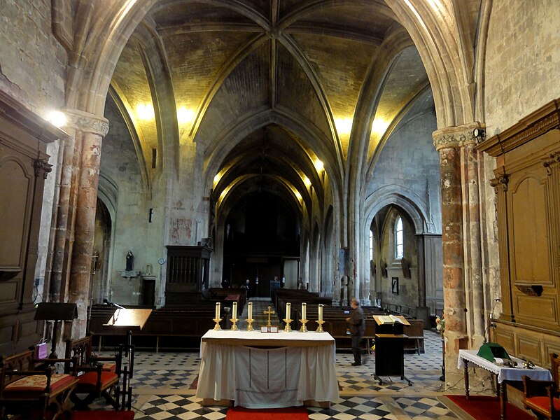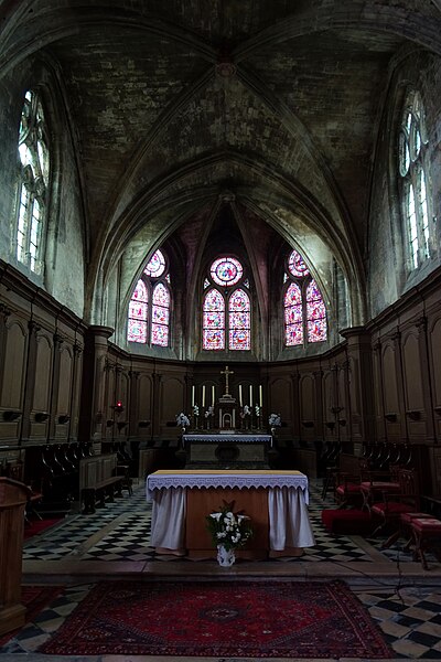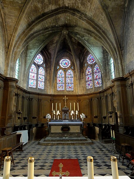 Le chœur, profond et relativement bas, conserve des dispositions rayonnantes d’origine avec des meneaux et colonnettes dans les fenêtres de l’abside, tandis que la première travée présente des réseaux flamboyants ; les voûtes semblent avoir été restaurées après la guerre de Cent Ans, les ogives conservant cependant un profil renvoyant à la période rayonnante, et le soubassement des fenêtres est revêtu de boiseries.