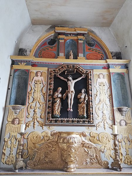 L'ancienne église Saint-Pierre-ès-Liens de Gluges, située au hameau de Gluges sur la commune de Martel (Lot), est un petit édifice roman partiellement adossé et à demi creusé sous une paroi rocheuse. Elle était sans doute à l'origine un oratoire ou une chapelle de cimetière ; il ne subsiste aujourd'hui que des pans de murs et deux corniches à corbeaux dont le larmier repose sur des modillons sculptés du XIIe siècle. Deux chapiteaux à entrelacs et palmettes, remployés dans l'arc doubleau de la nef et datables de la seconde moitié du XIe siècle, sont les seuls éléments susceptibles d'appartenir à un édifice antérieur. Le décor des modillons situe la construction principale dans la seconde moitié du XIIe siècle, mais des coupures et anomalies dans la maçonnerie, comme l'interruption de la corniche sur le chevet, laissent penser à plusieurs phases de construction ou de reprise. Une chapelle nord aurait été adjointe à la fin du XIIe siècle ou au début du XIIIe siècle, puis élargie par une travée voûtée d'ogives aux périodes attribuées alternativement aux XIIIe–XIVe siècles ou à la fin du XVe siècle. À l'époque moderne, l'édifice a été remanié, notamment par l'ouverture de deux grandes fenêtres dans la façade sud. Antoine Lascoux, seigneur de Mirandol, fit en 1469 un faux document pour prétendre que Gaillard de Mirandol avait fondé l'église et l'avait dotée de reliques, prétention que l'évêque de Cahors, le vicomte de Turenne et leurs successeurs contestèrent jusqu'au XVIIIe siècle ; des documents signalent la présence, en 1469, des armes des Mirandol dans la chapelle Notre-Dame et l'existence d'une tombe familiale. Gluges se trouve sur un itinéraire reliant Martel à Gramat par Brassac et Montvalent, voie qui est devenue un chemin de pèlerinage en raison de la découverte du corps d'Amadour à Rocamadour et des acquisitions vicomtales au XIIe siècle. Pendant la Révolution, l'église fut vendue par le maire à un particulier en l'an IV puis rachetée par la commune en l'an XII. En 1841 l'édifice était jugé en mauvais état et insuffisant pour la paroisse ; une nouvelle église fut construite entre 1854 et 1859 et la travée orientale de l'ancienne nef fut annexée au presbytère en 1861. Le bâtiment fut abandonné par le curé en 1928, occupé par divers particuliers par la suite, puis acquis par la municipalité de Martel en 2000 ; des travaux de sauvegarde ont été menés en 2008. L'édifice est classé au titre des monuments historiques depuis le 13 juin 1913. Architecturalement, l'église se compose de deux corps accolés : une nef initialement à deux travées voûtée en berceau plein cintre et un chœur carré plus étroit et plus bas, fermé par un mur droit et percé de petites fenêtres aux linteaux monolithes. La maçonnerie en pierre de taille et la qualité de la sculpture des quatorze modillons du XIIe siècle rapprochent l'ornementation des grands tympans romans du Quercy. La situation exceptionnelle de l'église, nichée dans une anfractuosité de la falaise avec une cavité et un puits derrière la chapelle, accentue son caractère singulier. Intérieurs et extérieurs conservent des traces de décors peints successifs : pigments ocre rouge sur les modillons et peinture noire dans le chœur attribuables au XIIe siècle, faux appareil et motifs gothiques dans la chapelle et la nef, ainsi que plusieurs litres funéraires du XVe au XVIIIe siècle portant les armes des seigneurs de Gluges, dont les Lasteyrie du Saillant et les Maynard-Lestrade. Le retable, vandalisé au XXe siècle, a pu être restitué après la découverte d'une photographie ancienne attribuée à Armand Viré et grâce à une restauration qui a utilisé des effets de trompe-l'œil. L'association de sauvegarde des maisons et paysages de Martel a participé au remplacement de la couverture en tôle ondulée du chœur par une couverture traditionnelle en tuile plate ancienne.