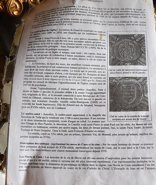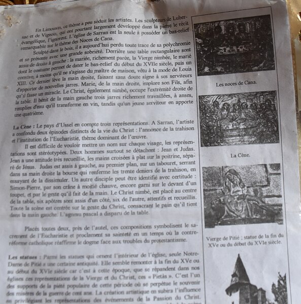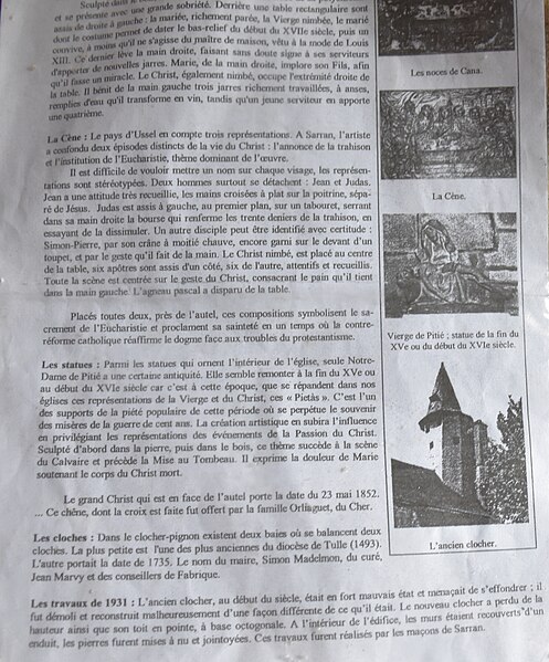 L'église Saint-Pierre-ès-Liens, située à Sarran (Corrèze), est une église rurale dont la construction est datée de 1409. Elle présente une nef unique de trois travées, séparées par des doubleaux, et un chœur à chevet plat. Une chapelle s'ouvre au nord‑est dans la première travée, tandis que deux autres chapelles forment un petit transept au nord et au sud de la troisième travée. L'ensemble est voûté par des croisées d'ogives. La façade nord‑ouest comportait un clocher‑pignon dont les niveaux étaient délimités par d'étroits bandeaux ; cette façade est également percée d'un portail « limousin » aux voussures moulurées, légèrement brisées. La clé de voûte de la première travée porte l'inscription Anno Domini MCCCCIX (1409), rappelant l'origine de la chapelle devenue église paroissiale, et deux chapelles latérales ont été ajoutées ultérieurement. À la fin du XIXe siècle, l'édifice fut agrandi par l'édification d'un clocher octogonal surmonté d'un toit conique ; ce clocher, en mauvais état, fut démoli en 1931 et remplacé par le clocher‑mur actuel. Parmi les objets mobiliers protégés figurent la cloche du clocher‑mur, une statue de saint Jean‑Baptiste, les demi‑reliefs des Noces de Cana et de la Cène, une Pietà et un tabernacle à ailes. L'église a été inscrite au titre des monuments historiques par arrêté du 31 mai 1988.