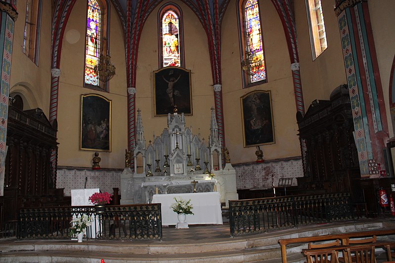 Derrière le maître-autel est placé un tableau de la Crucifixion; le chœur est encadré par deux pilastres sculptés d'enfants, quadrupèdes, chimères et démons, et la voûte s'achève par des culs-de-lampe ornés de figures similaires; ces sculptures pourraient être des réemplois reconstitués. Le maître-autel et le tabernacle sont en marbre blanc; le bas-relief central représente la mise au tombeau de Jésus entourée de deux apôtres et le tabernacle comporte trois ciboriums. Les stalles du XVIIe siècle, classées au titre des objets des monuments historiques, proviennent de l'ancienne abbaye des Feuillants de Labastide-Clermont.