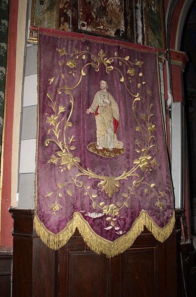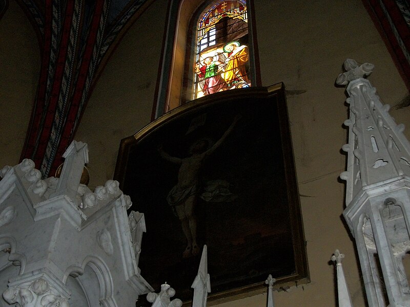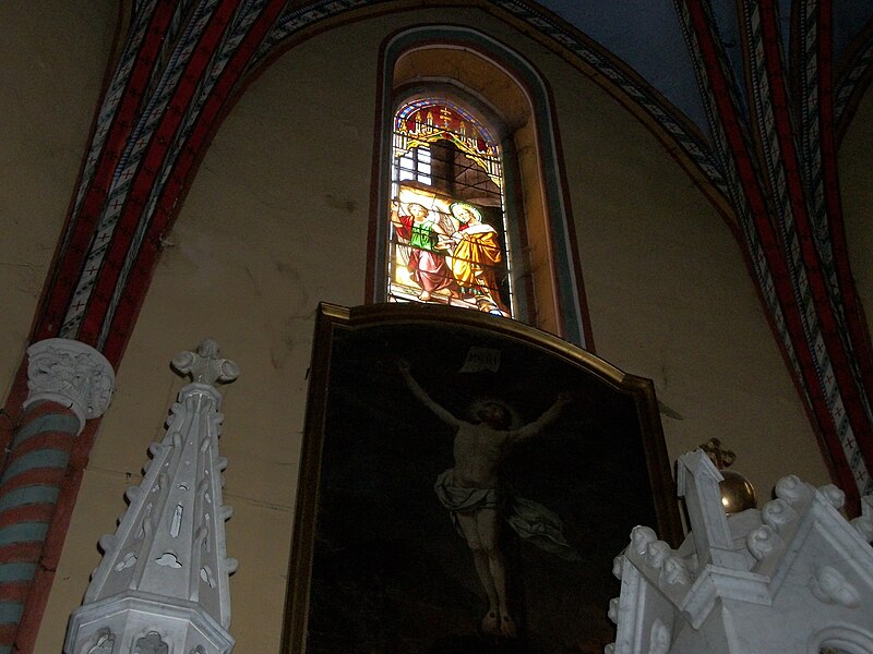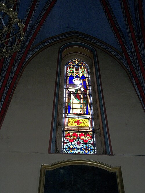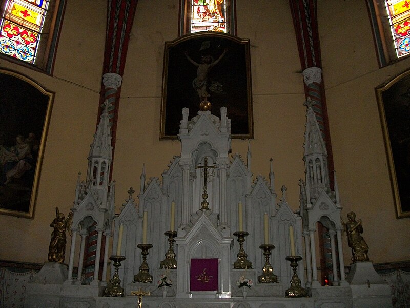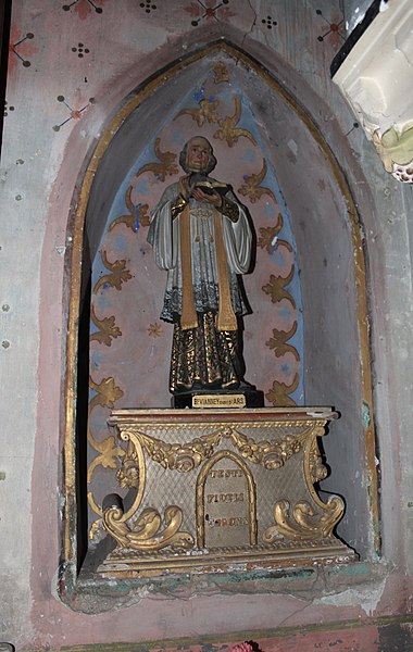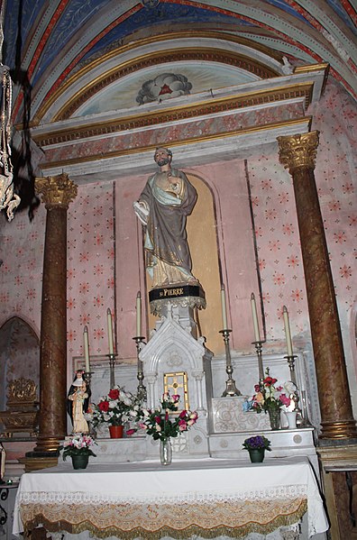 L'entrée se situe dans la chapelle Saint-Jean‑Baptiste. La chapelle Notre-Dame du Rosaire présente un retable monumental centré sur un tableau où l'Enfant remet le rosaire à saint Dominique; l'autel et le tabernacle en marbre blanc sont ornés d'un monogramme marial A‑M entouré de branches de rosier, et le tabernacle porte une frise végétale dorée. La chapelle Saint-Pierre comporte un retable avec une statue de saint Pierre, un autel et un tabernacle en marbre blanc et deux coffrets reliquaires.