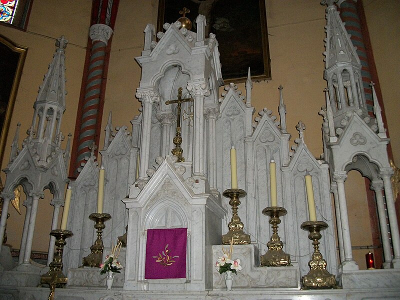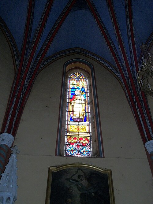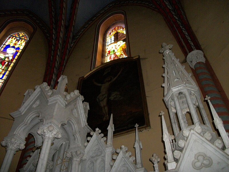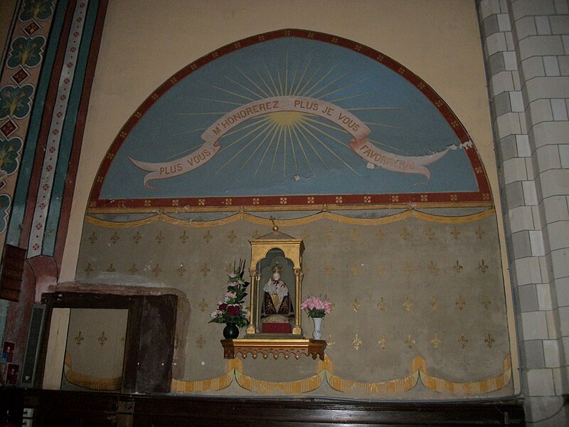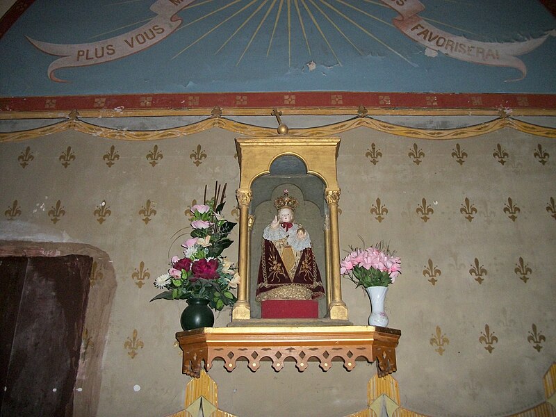 La chapelle de la Vierge conserve un retable orné de colonnes sculptées de feuilles de vigne et de grappes, avec au centre une pietà du XVIe siècle; son sommet porte une statuette de la Vierge à l'Enfant entourée d'anges et l'inscription "Notre-Dame des Victoires, Priez pour nous" en lettres dorées. Deux retables latéraux du XVIIIe siècle figurent l'Annonciation et la Nativité; l'autel et le tabernacle sont en marbre blanc, la façade de l'autel est ornée de deux cœurs dorés (Cœur immaculé de Marie et Sacré-Cœur) et le tabernacle présente frises de feuillage, oiseaux symbolisant l'Esprit Saint, un agneau portant une croix, fleurs de lys, triangles évoquant la Trinité et le monogramme marial A‑M.