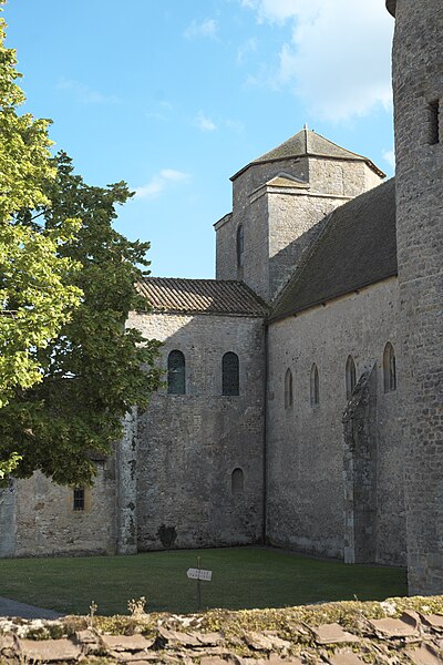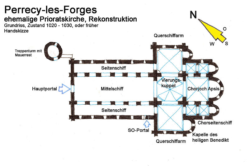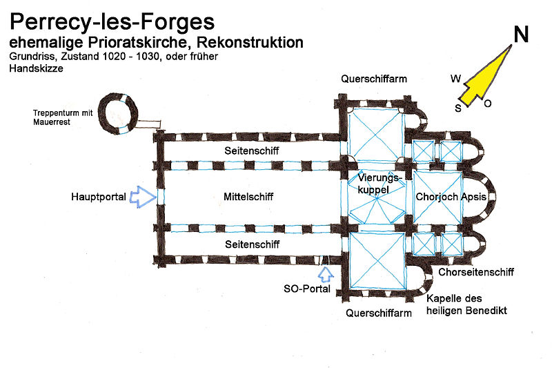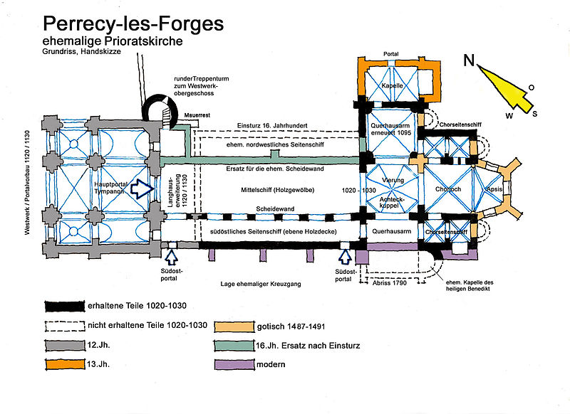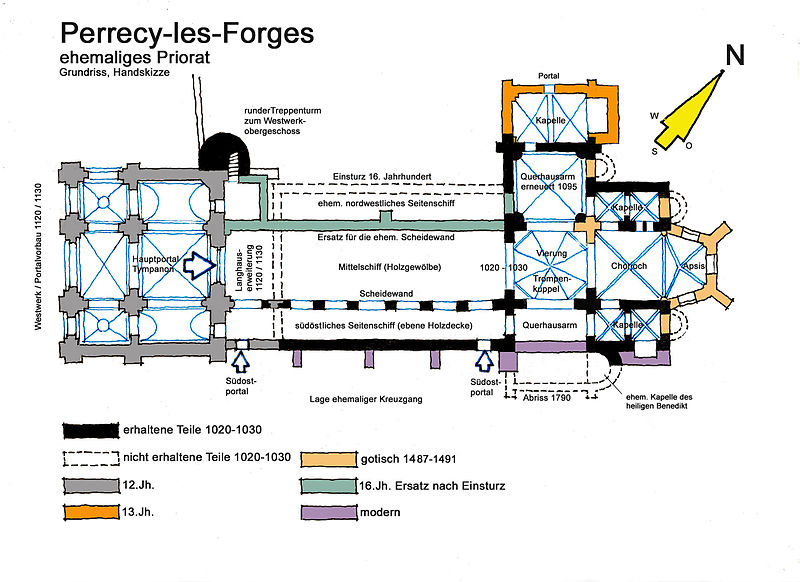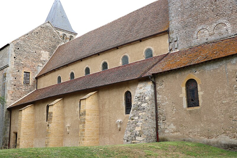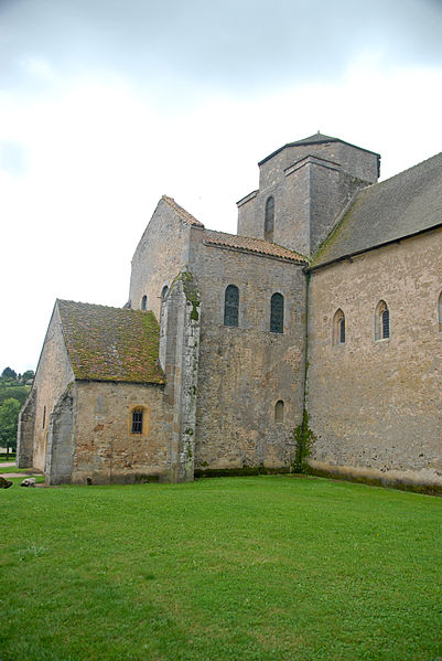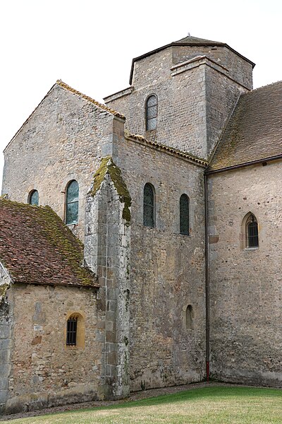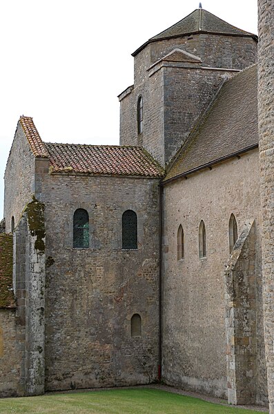 Le plan primitif est largement préservé, malgré l'absence en élévation du bas-côté nord dont subsiste un petit fragment, de l'extrémité du croisillon sud du transept et du haut vaisseau du chœur. De la construction initiale du début du XIe siècle subsistent la totalité du mur sud de la nef, très déversé, la totalité de la croisée du transept jusqu'à la coupole surplombant la tour-lanterne, les murs du chœur avec leurs deux travées de bas-côtés et la base de l'abside polygonale. Ces parties sont bâties en maçonnerie de petit moellon carré, caractéristique du XIe siècle et distincte des autres campagnes de construction.