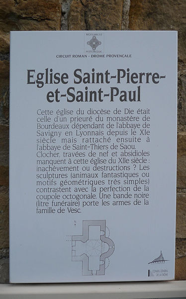 L'église Saint-Pierre-et-Saint-Paul, de style roman, se situe à Comps dans le département de la Drôme, en région Auvergne-Rhône-Alpes. Elle est un ancien prieuré bénédictin rattaché à l'abbaye de Savigny. L'édifice est classé au titre des monuments historiques depuis le 14 mars 1938. Sa silhouette est dominée par une tour carrée imposante dont le registre supérieur est rythmé de pilastres plats et surmonté d'un petit clocheton. Les bras du transept prennent la forme de chapelles semi-circulaires, configuration habituellement rencontrée au chevet. La façade occidentale, très simple, présente une porte rectangulaire et une baie cintrée. La nef est tronquée et l'église privilégie l'espace en largeur dans le sens des transepts. L'édifice apparaît dans l'émission de télévision "Mystères", épisode "Peur En La Demeure". Des informations complémentaires sont disponibles en ligne, notamment sur Clochers de France, l'Observatoire du patrimoine religieux, la base Mérimée, le site Lieux Sacrés et sur les portails consacrés à l'architecture chrétienne, au catholicisme, à la Drôme et aux monuments historiques.