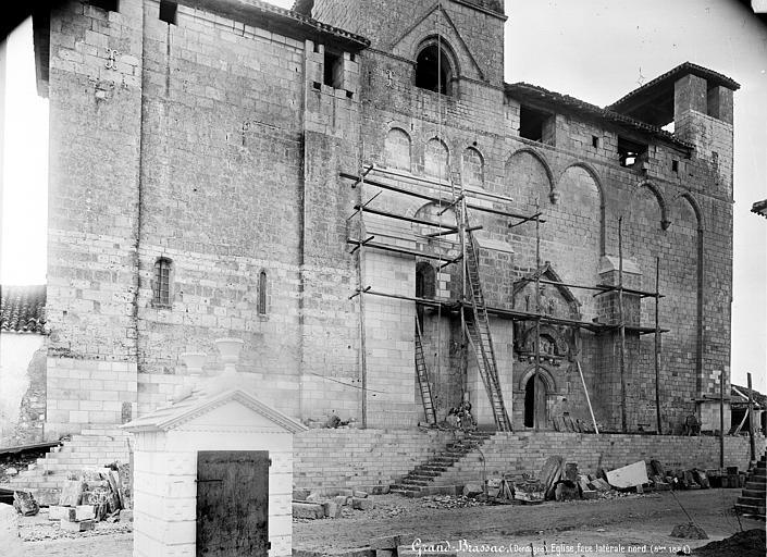 L'église Saint-Pierre-et-Saint-Paul est une église catholique fortifiée située au centre du village de Grand-Brassac, en Dordogne (Nouvelle-Aquitaine, France). De l'extérieur, l'édifice prend l'allure d'une forteresse : ses murs élevés sont aveugles et couronnés de larges créneaux, et un clocher carré orné d'arcatures domine la construction. À l'ouest, une salle de garde et un chemin de ronde surplombent le portail. La porte de la face nord est encadrée d'un motif sculpté de style roman-byzantin : une archivolte en plein cintre décorée repose sur un bandeau analogue soutenu par des corbeaux ornés de bas-reliefs figurant divers personnages. Dans le tympan, sur la saillie du bandeau et sur l'archivolte, des statuettes ayant conservé des traces de peinture sont protégées par un auvent triangulaire ; elles ne sauraient être antérieures au XIVe siècle. À l'intérieur, la nef est couverte par trois coupoles sur pendentifs soutenues par des arcs en tiers-point, tandis que le chevet, de plan carré, est d'un état plus récent. Un escalier logé dans la saillie d'un contrefort conduit aux combles fortifiés. La construction a commencé vers 1140 et s'est achevée au XIIIe siècle ; l'édifice a été agrandi et fortifié au XIIIe siècle, puis légèrement remanié à la fin du XVIe siècle, une poutre de la charpente portant la date de 1599. Assaillie à plusieurs reprises pendant la guerre de Cent Ans puis lors des guerres de Religion, l'église a servi de refuge aux habitants sans tomber aux mains de l'ennemi. Classée au titre des monuments historiques en 1885, elle a été restaurée l'année suivante par l'architecte des Monuments Historiques Rapine. Parmi les éléments de mobilier et de sculpture, le portail nord comporte notamment cinq sculptures polychromes classées en 1908 ; le tableau-reliquaire est également classé en 1908 et le tabernacle en bois du maître-autel, daté du XVIIe siècle, a été classé en 1972.