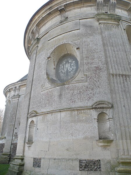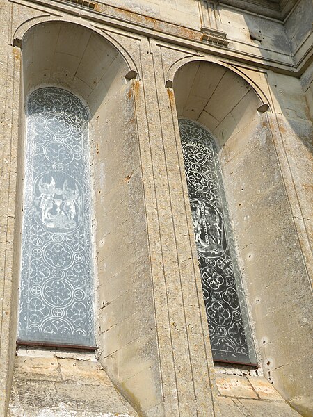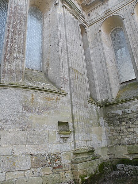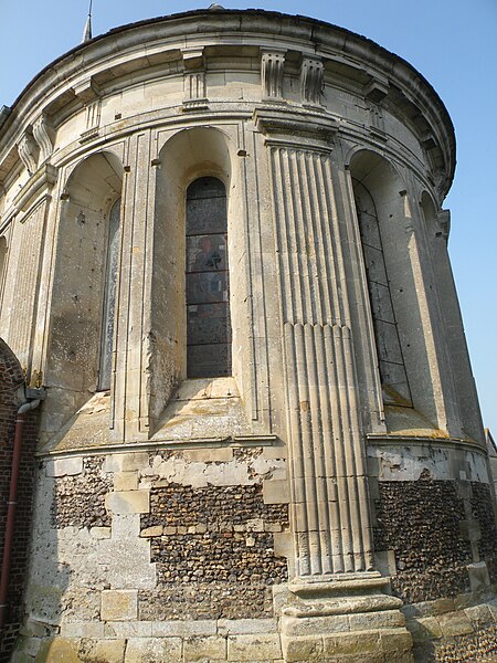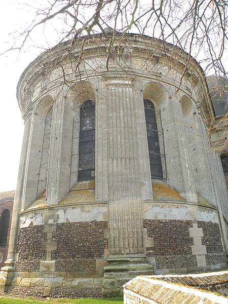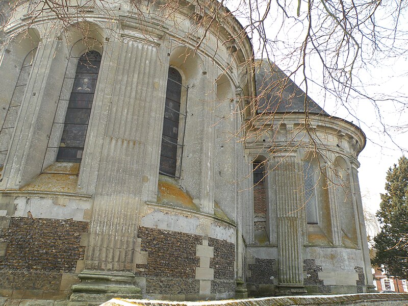Le mur extérieur est presque entièrement en pierre de taille, les soubassements des fenêtres étant fréquemment réalisés en moellons de silex ; le narthex et la sacristie sont en briques. Il n'existe pas de façade occidentale et le pignon de la nef est fermé par une cloison provisoire revêtue de bardeaux, tandis que des pierres en attente signalent l'inachèvement de l'ouvrage. Les pilastres cannelés extérieurs, plus larges que ceux de l'intérieur, portent des chapiteaux doriques sobres et un entablement élevé agrémenté de biglyphes et de consoles irrégulièrement répartis ; des niches à statues avec frontons en plein cintre ponctuent le chevet des croisillons. L'ensemble extérieur, soigné mais d'une certaine austérité, ne comporte pas de motifs religieux sculptés.