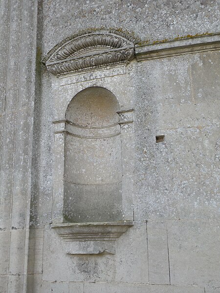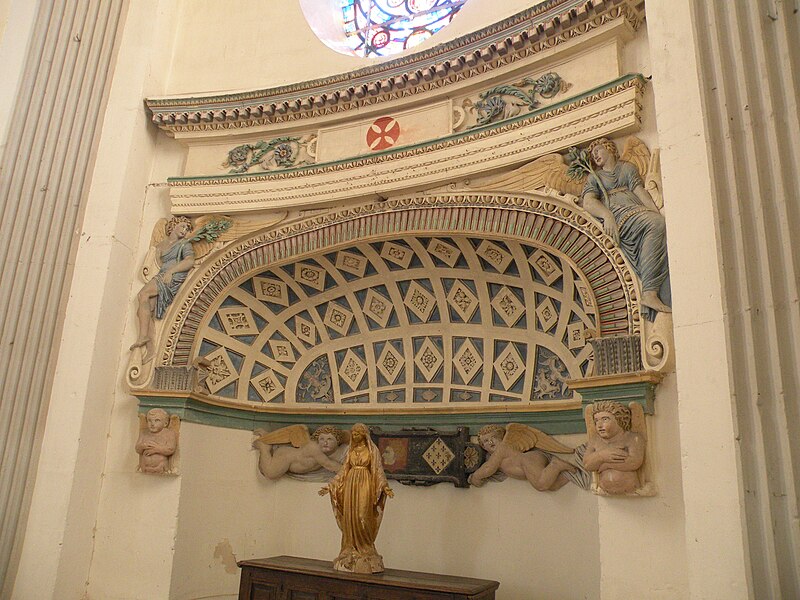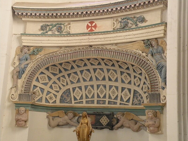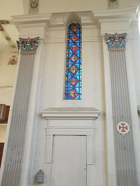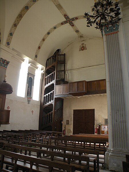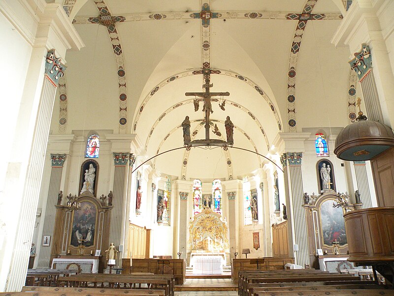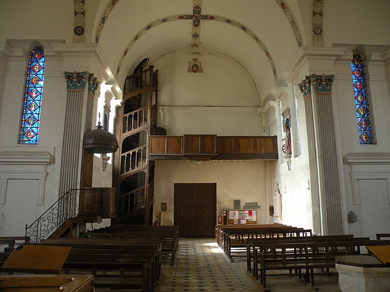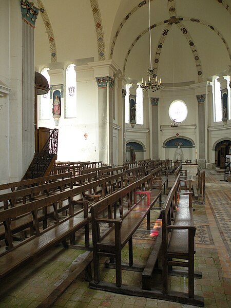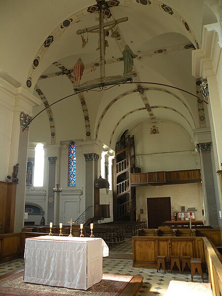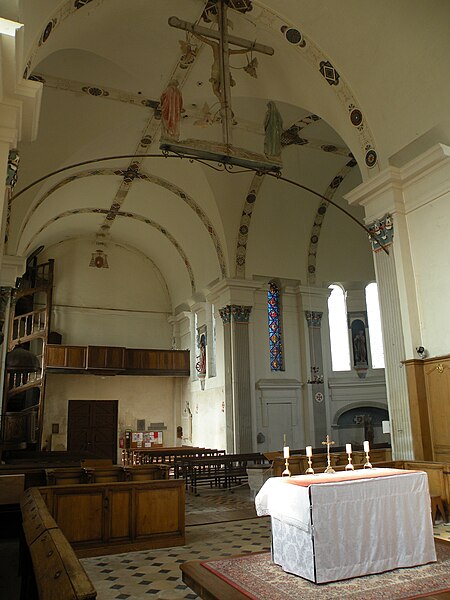Orientée dans un axe légèrement dévié vers le sud‑ouest, l'église présente un plan cruciforme avec une nef courte, sans travées ni bas-côtés, un transept dont chaque croisillon comprend une partie droite et une abside hémicylindrique, et un chœur plus profond mais analogue aux croisillons. L'ensemble est voûté en berceau, la croisée présentant une voûte d'arêtes résultant de la rencontre des berceaux ; un petit narthex moderne précède la nef, une sacristie en brique occupe l'angle entre le croisillon sud et le chœur, et un petit clocher en charpente s'élève au-dessus de la croisée. L'architecture intérieure s'appuie principalement sur des pilastres corinthiens fortement stylisés, des dosserets et un entablement à métope aniconique, tandis que les fenêtres interrompent la corniche en arrivant jusqu'aux impostes des baies en plein cintre. Les voûtes sont ornées de larges bandeaux sculptés et de motifs alternant rosaces, coquilles Saint-Jacques et gerbes, certains éléments présentant une polychromie architecturale. L'intérieur se caractérise par une homogénéité générale, mais aussi par l'absence de continuité stylistique entre élévations latérales et voûtes, traduisant des interventions successives.