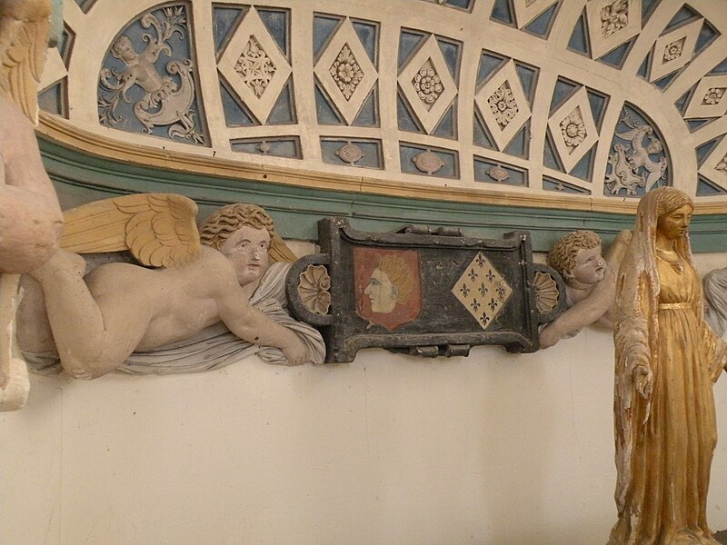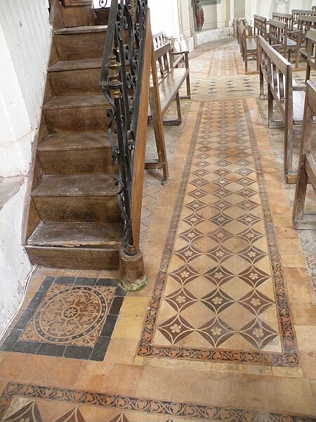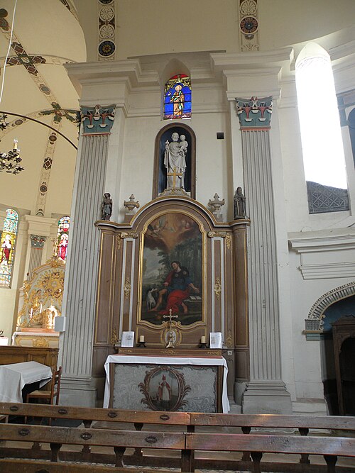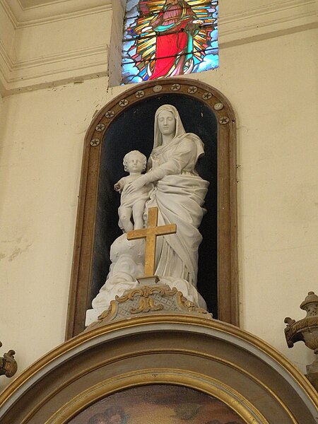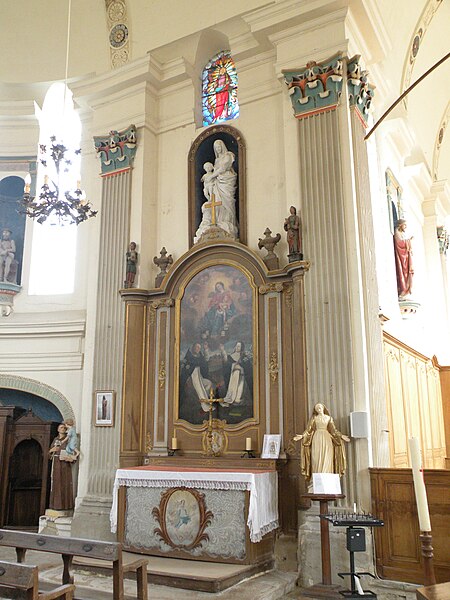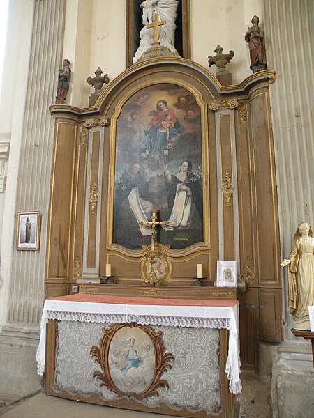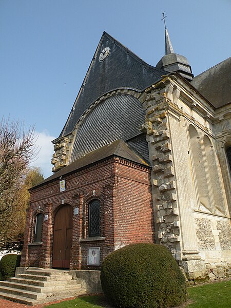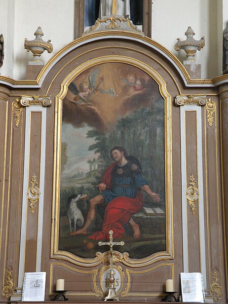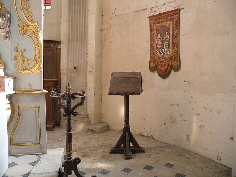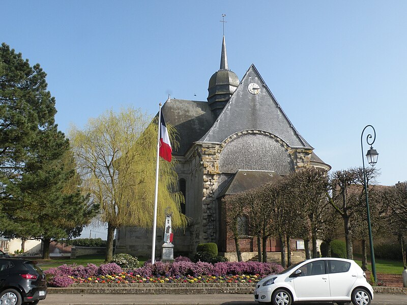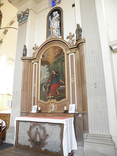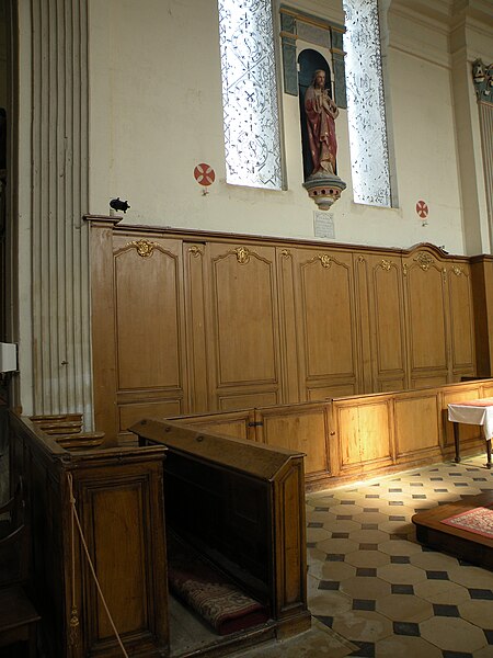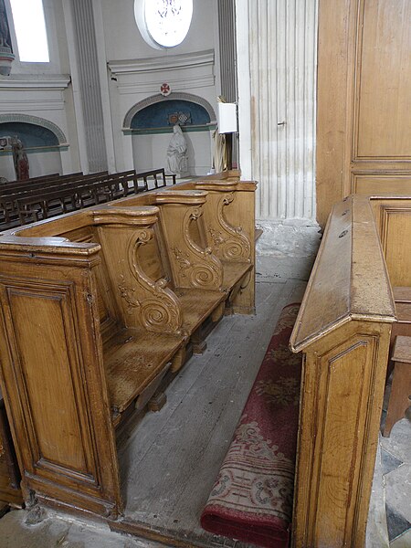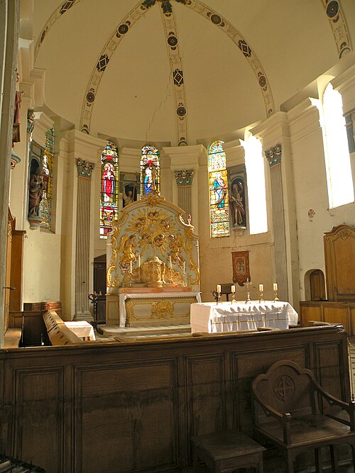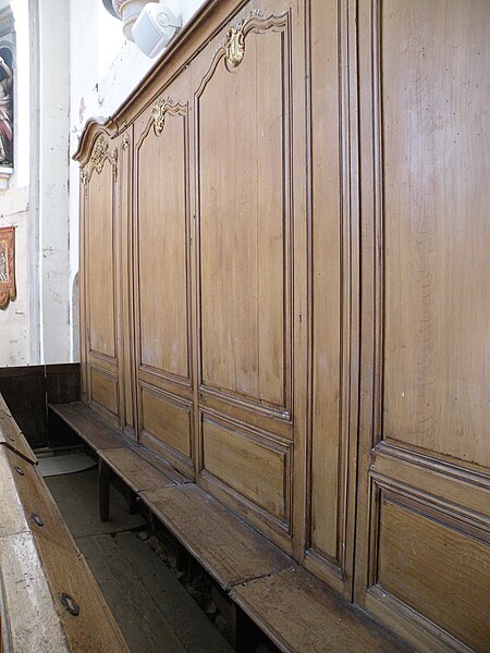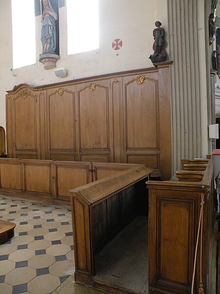 Le mobilier comprend des éléments remarquables et classés : la poutre de gloire, d'origine ancienne et classée en 1912, présente un Christ en croix flanqué d'une Vierge et d'un saint Jean, avec des éléments de fer forgé figurant le sang et des médaillons figurant le Tétramorphe ; l'ensemble formé par le maître-autel, le tabernacle et le retable, de style rocaille et daté du milieu ou du troisième quart du XVIIIe siècle, est en bois sculpté, vernis blanc et doré, et a été classé au titre des objets. Les retables latéraux encadrant l'entrée du chœur abritent deux grands tableaux anonymes du XVIIIe siècle, représentant respectivement la réception du Rosaire et saint Roch, restaurés en 2009 ; les boiseries proviennent d'un atelier de Gisors. L'ensemble classé du maître-autel, naguère remisé dans le porche et restauré, présente un tabernacle richement orné et un retable couronné d'une gloire rayonnante et d'une rocaille.