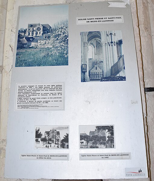 L'église Saint-Pierre-et-Saint-Paul se situe à Mons‑en‑Laonnois, dans le département de l'Aisne. Son état actuel remonte aux XIIe–XIVe siècles. Elle est classée au titre des monuments historiques depuis 1909. Des études consacrées à l'édifice figurent notamment dans les actes du Congrès archéologique de France (Jean‑Pierre Ravaux) et dans Picardie gothique (Dany Sandron). Des ressources et collections d'images sont également accessibles sur Wikimedia Commons, ainsi que dans des bases et sites spécialisés comme Mérimée, Clochers de France, GCatholic.org et l'Observatoire du patrimoine religieux.