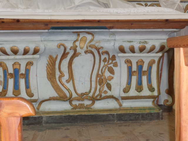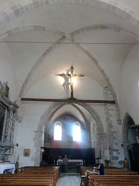 L’église conserve trois autels classés avec retables en bois, partiellement peints ou dorés, et un antependium en toile peinte du XVIIe siècle, très rare et classé au titre d’objet. Avant le séisme de 1959, une grande chapelle latérale dédiée à Marie se trouvait sur le côté gauche ; la restauration de cette chapelle ayant été jugée trop coûteuse, elle fut démolie et son mur obturé, et son grand retable transféré à l’entrée droite de l’église. Le retable dédié à Marie représente saint Roch, tandis que le retable du chœur illustre les rois mages offrant leurs présents. Les bancs du chapitre paroissial subsistent derrière l’autel déplacé et la restauration de 1960 a permis la redécouverte d’un tabernacle ainsi que de fresques et d’autres éléments décoratifs. L’ornementation comprend de nombreuses variations du symbole de la coquille Saint-Jacques, visibles sur le baptistère, le bénitier, un bouton de porte et dans une toile intitulée "Donation du Rosaire". Enfin, divers éléments extérieurs et intérieurs — le clocher, le cimetière voisin, le monument aux morts côté nord, le portail latéral sud considéré comme le plus ancien, et un très ancien antependium — attestent de la richesse historique et artistique de l’église.