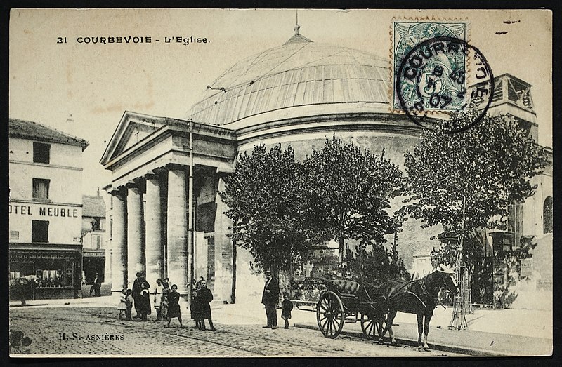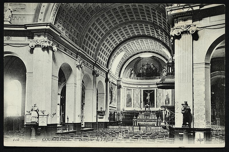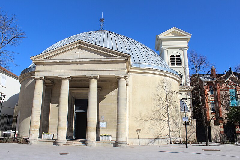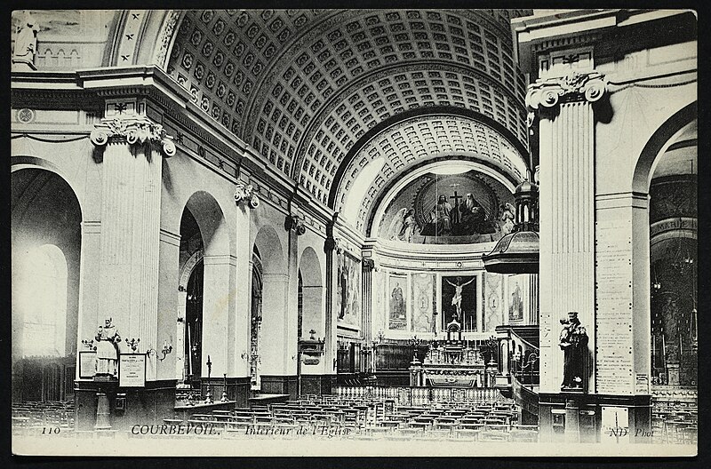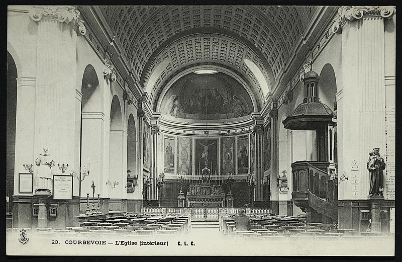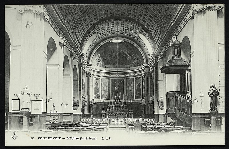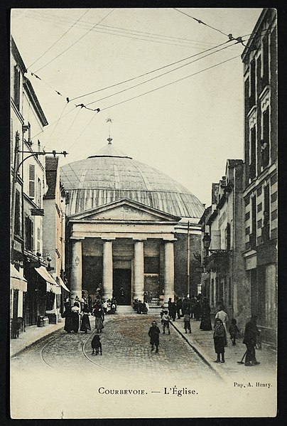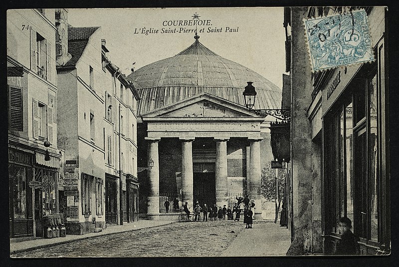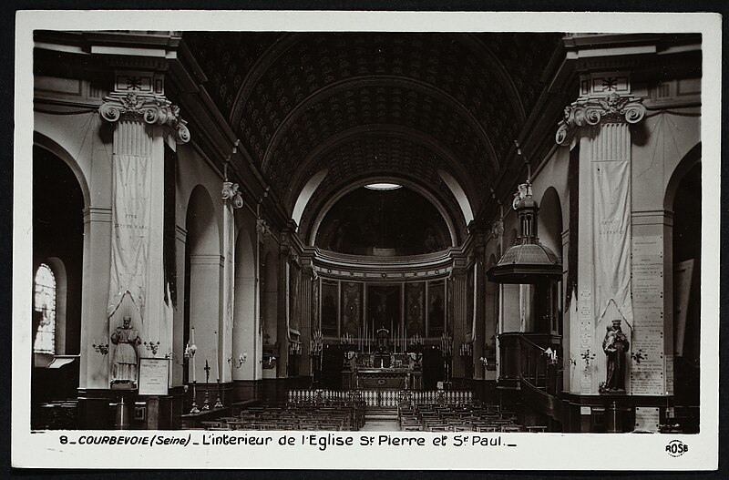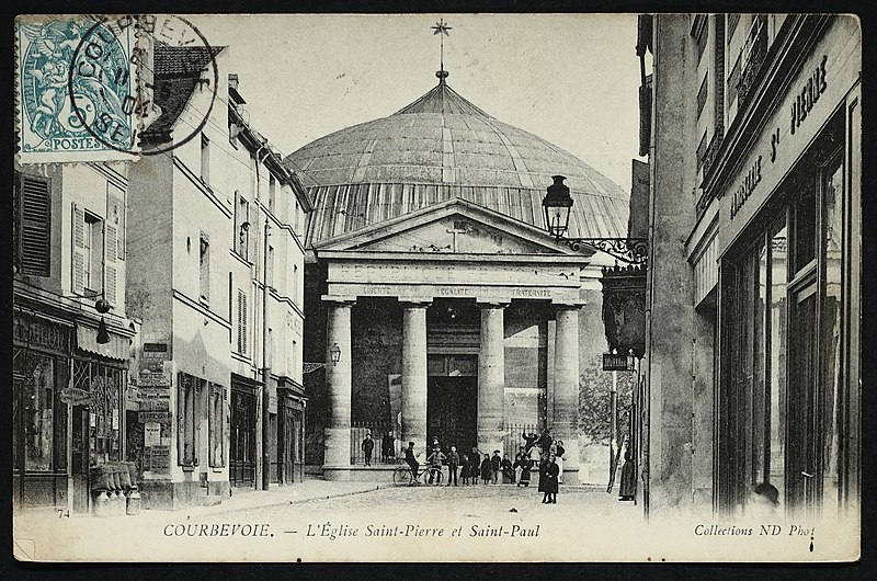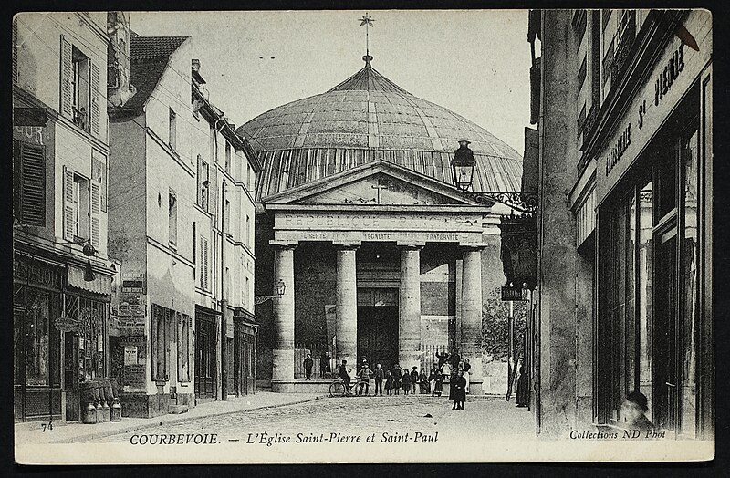 L'église Saint-Pierre-Saint-Paul de Courbevoie, située dans les Hauts-de-Seine, est un lieu de culte catholique inscrit au titre des monuments historiques depuis le 11 juin 1971. Dès le XIVe siècle une chapelle dédiée à Saint-Pierre et Saint-Paul occupait le site ; détruite pendant la guerre de Cent Ans, elle fut reconstruite au XVIe siècle puis élargie au début du siècle suivant par deux chapelles latérales consacrées à Notre‑Dame et à saint Sébastien, avant de tomber en ruines vers 1770. Nommé vicaire de Courbevoie en 1769, l'abbé Pierre Hébert œuvra à la création de la paroisse autorisée en 1784 et fut nommé curé en 1785 ; il engagea la construction de la nouvelle église dont la première pierre fut posée le 9 mai 1790. L'édifice fut conçu et dirigé par Louis Le Masson, architecte et ingénieur des Ponts et Chaussées, élève de Claude‑Nicolas Ledoux ; sa réalisation, menée entre 1790 et 1793, présente un plan elliptique surmonté d'un dôme. Le Masson adapta son projet à l'étroitesse du terrain en disposant la nef principale en rotonde elliptique précédée d'un petit péristyle à quatre colonnes et en plaçant, sur le petit axe, un sanctuaire rectangulaire flanqué de collatéraux ouverts par des arcades sur la rotonde. La voûte ovale de la rotonde, percée d'un oculus central, et la sobriété des éléments décoratifs — corniche dorique, niches et péristyle à fronton triangulaire — participent de la rigueur du décor intérieur et extérieur. Après la destitution de Louis Le Masson en 1793, les travaux s'interrompirent et, pendant deux décennies, l'édifice resta inachevé et se détériora. En 1819 la duchesse d'Angoulême réunit et offrit des fonds qui permirent la restauration et l'achèvement du monument. De 1868 à 1870 l'architecte Jean‑Baptiste Guenepin dirigea une campagne d'agrandissement qui modifia l'orientation de l'église : la nef fut prolongée vers l'est pour ouvrir sur un nouveau chœur et les chapelles latérales furent allongées et élargies ; le portique d'entrée, formé de quatre colonnes ioniques, d'un entablement et d'un fronton triangulaire, fut réalisé à cette occasion. Les décors picturaux et les grandes toiles du chœur sont pour la plupart installés à partir de cette période et structurent visuellement le sanctuaire. Après la loi de séparation de 1905, les inscriptions «République française» puis «Liberté, Égalité, Fraternité» furent peintes au fronton ; la première disparut lors du bombardement du 15 septembre 1943 et la seconde fut effacée lors de la restauration de la façade en 1992‑1993. L'abbé François Neuville, curé de 1907 à 1942, fit édifier le clocher prévu par les plans d'origine en 1932 et demanda à reposer sous la tribune d'orgue ; son action paroissiale est rappelée par une épitaphe. Depuis la chaire de cette église fut lancé, le 31 janvier 1954, un appel à la solidarité nationale en faveur des sans‑abri, relayé ensuite par les stations de radio. Menacée de destruction par un projet immobilier en 1971, l'église échappa à la démolition grâce à l'intervention du docteur Henri de Frémont et à son inscription à l'inventaire des monuments historiques le 11 juin 1971 ; le clocher de 1932 n'était pas inclus dans la protection. Des travaux d'entretien et de restauration ont été menés par la suite : ravalement de la façade et du péristyle en 1980, réfection de la toiture en 1987‑1988 et restauration intérieure complète en 1992‑1993. Au fil du XIXe et du XXe siècle des adjonctions furent réalisées, notamment une chapelle des catéchismes construite par l'architecte Daubin en 1925 et le clocher de 1932. La coupole de la rotonde, construite en poterie assemblée sur une armature en fer et recouverte d'un enduit, avait été à l'origine protégée par une couverture en ardoise remplacée ensuite par un toit en plomb à la suite des dégradations. Avec l'église Saint‑Nicolas‑et‑Saint‑Marc de Ville‑d'Avray, l'édifice constitue l'un des rares monuments religieux construits en France pendant la période révolutionnaire ; il conserve la singularité de son plan en T, formé d'une rotonde elliptique accolée à un vaisseau rectangulaire, et les principes structurels et décoratifs imaginés par Le Masson.