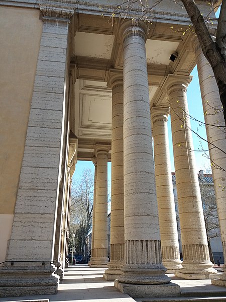 L'église Saint-Pothin est un édifice religieux de Lyon, située place Édgar Quinet dans le quartier Foch du 6e arrondissement ; elle a été inscrite dans son intégralité au titre des Monuments historiques par arrêté préfectoral du 2 mai 2007. Sa création répond à l'accroissement de la population et s'inscrit dans l'urbanisation du quartier des Brotteaux organisée à la fin du XVIIIe siècle selon un plan de Jean-Antoine Morand ; cette partie appartenait alors à la commune de La Guillotière, rattachée ensuite à Lyon. Une chapelle avait été ouverte dès 1818, une ordonnance royale facilita la création de la paroisse en 1826 et ses limites furent fixées en 1827. Les Hospices civils de Lyon firent don du terrain en 1835 et un concours municipal fut remporté par l'architecte Christophe Crépet ; les travaux furent réalisés de 1841 à 1843 et l'église fut inaugurée à Noël 1843. Le budget, initialement sous-évalué, tripla, ce qui entraîna l'ajournement de la décoration prévue et l'emploi de matériaux de moindre qualité, à l'origine de désordres ayant nécessité d'importantes restaurations ultérieures. Des campagnes de restauration furent menées par l'architecte de la ville Tony Desjardins en 1867 puis par Claudius Porte dans les années 1870. L'organiste Adrien Rougier obtint que Maurice Duruflé vienne interpréter en personne la première de son Requiem dans sa version pour orgue. L'édifice, de style néoclassique, présente un plan en croix latine et se signale par une façade en pierre de Villebois ornée d'un portique hexastyle d'ordre dorique surmonté d'un fronton triangulaire. La croisée du transept est couronnée d'une coupole et le clocher se situe au-delà du chevet. L'intérieur comprend une nef centrale aveugle voûtée en plein-cintre, flanquée de deux collatéraux dont les voûtes en berceau sont supportées par une colonnade d'ordre ionique. Le transept n'altère pas l'impression de basilique dégagée par la nef ; le chœur, terminé en cul-de-four, occupe un espace réduit en raison de l'emplacement des grandes orgues, et les sacristies sont disposées au-delà du chœur. Christophe Crépet avait prévu un programme décoratif qui ne fut pas réalisé pour des raisons d'économie ; l'aménagement décoratif intérieur fut repris à partir de 1892 par l'architecte Sainte-Marie Perrin. La coupole reçut une verrière de Lucien Bégule et une fresque peinte par Étienne Couvert représentant la Vierge et les douze apôtres entre 1893 et 1894 ; le cul-de-four fut orné au début du XXe siècle. Le programme de vitraux des murs latéraux, réalisé en 1932 par Émile Bégule dans les ateliers grenoblois Balmet, met en parallèle les fondateurs de l'Église de Lyon et ceux de la France : les saints occupent le collatéral nord, guidés par l'évangéliste Jean, et les saintes le collatéral sud, conduites par la Vierge, gardienne de la cité. L'église conserve également un chemin de croix monumental statufié et, dans le transept sud, un bas-relief de marbre représentant la Cène. Le premier orgue aurait été construit en 1846 par la société Daublaine-Callinet ; en 1876 la manufacture J. Merklin & Cie construisit un instrument neuf à deux claviers et pédalier, augmenté ensuite en 1880 et en 1910. En 1945 la société Ruche & Cie livra un nouvel orgue à trois claviers et pédalier réutilisant du matériel Merklin, et l'orgue actuel a été construit en 2004 par la société Kern en réemployant l'instrument ancien. L'orgue de Saint-Pothin tint un rôle important dans la vie musicale lyonnaise après la Seconde Guerre mondiale : Adrien Rougier, titulaire à partir de 1945, invita de nombreux interprètes de renom ; après Loïc Mallié, le titulaire actuel est Octavian Saunier.