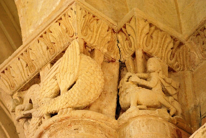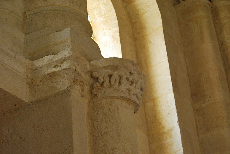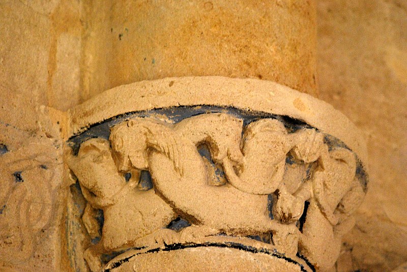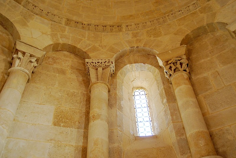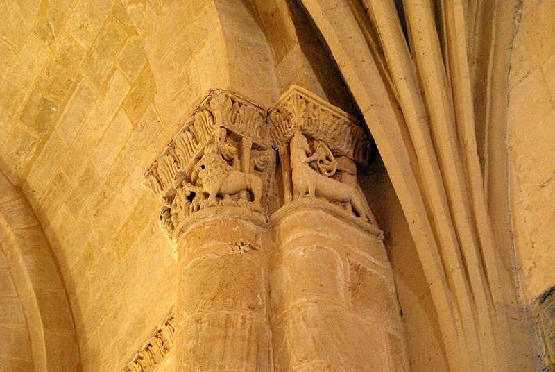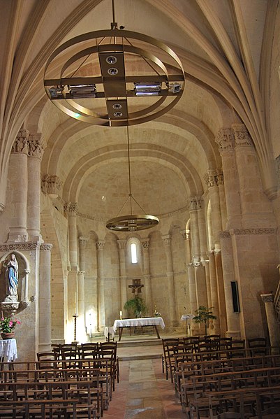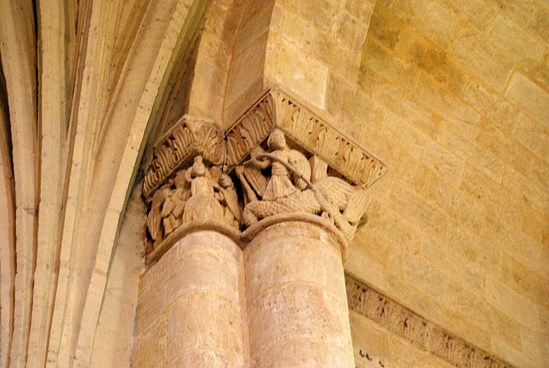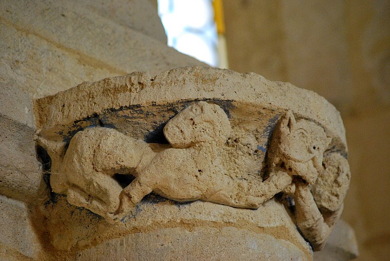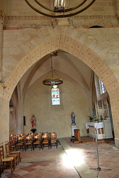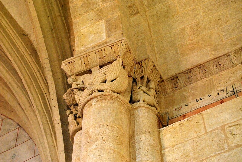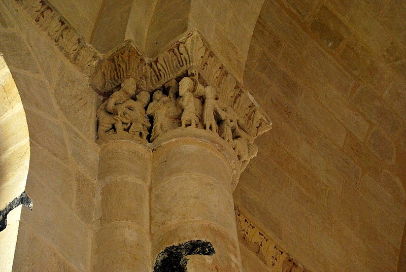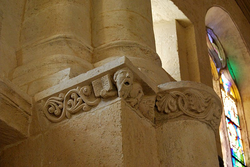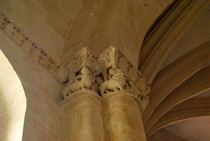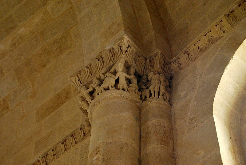 L'iconographie intérieure est concentrée autour de l'arc triomphal, du chœur et du chevet. Le pilier nord de l'arc triomphal porte trois colonnes engagées avec corbeilles historiées reproduisant des thèmes connus à La Sauve-Majeure : le baptême du Christ, saint Michel terrassant le dragon et Samson tuant le lion. Le pilier sud présente, parmi ses corbeilles, un Daniel dans la fosse aux lions de grande qualité et deux centaures affrontés, copies des modèles de La Sauve-Majeure mais présentant une disposition particulière. L'arc doubleau intermédiaire du sanctuaire comporte un ensemble original consacré à trois épisodes d'Abraham — l'alliance et la circoncision, le sacrifice d'Isaac interrompu par l'ange, et la dénonciation des mœurs de Sodome — scènes traitées de façon narrative et moralisante.