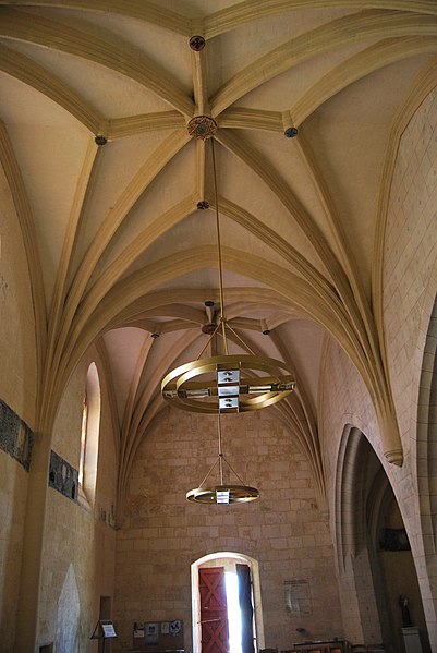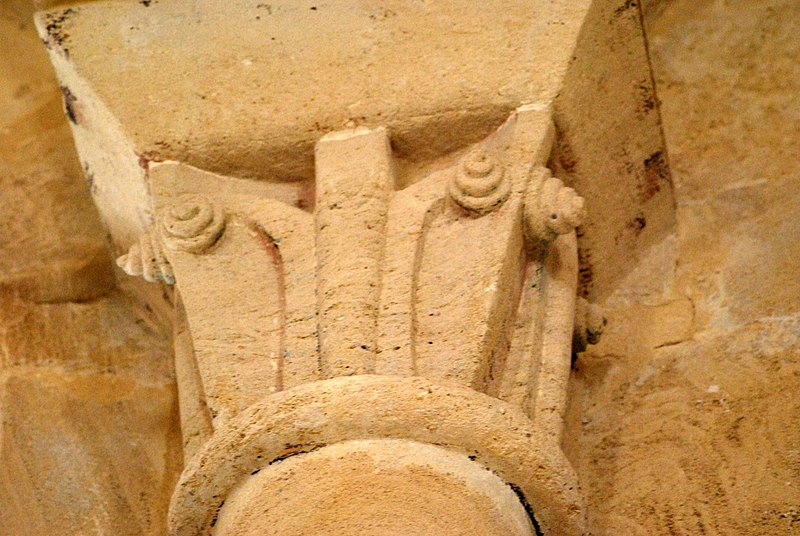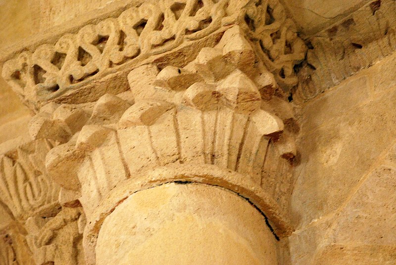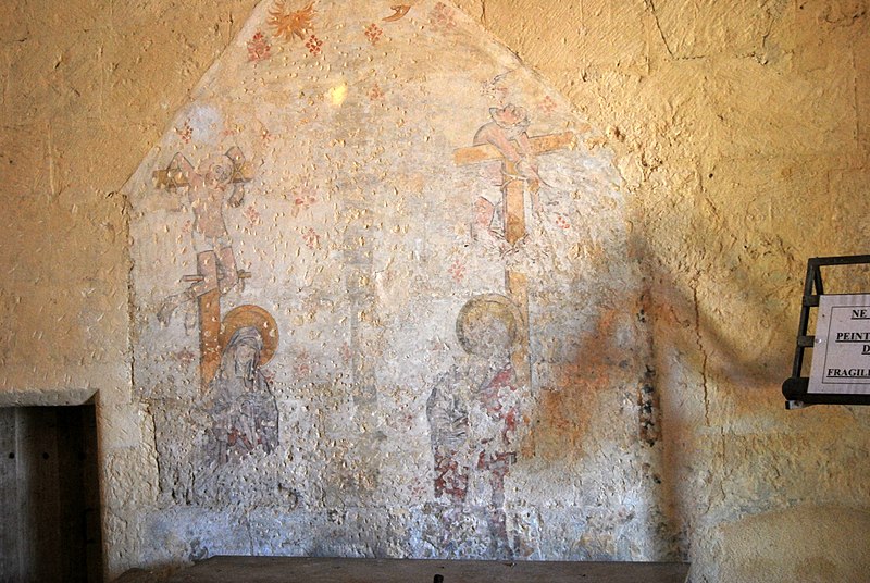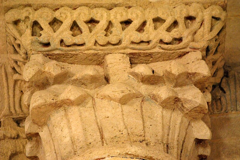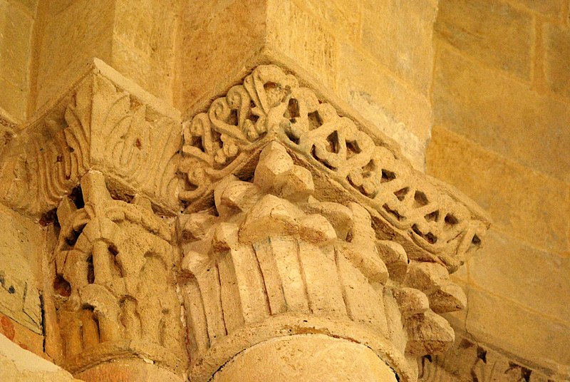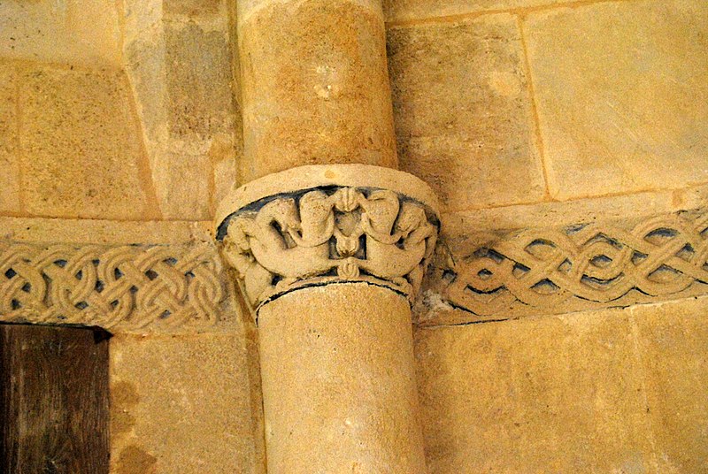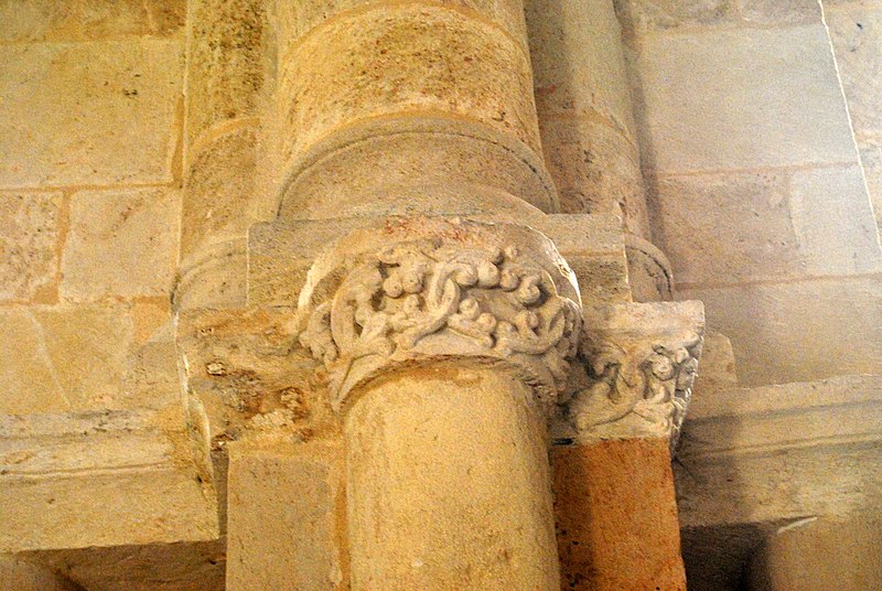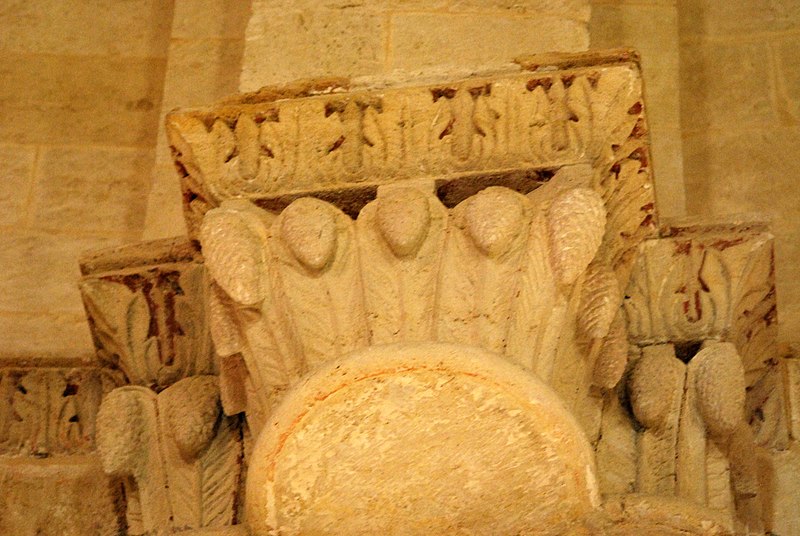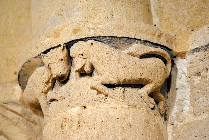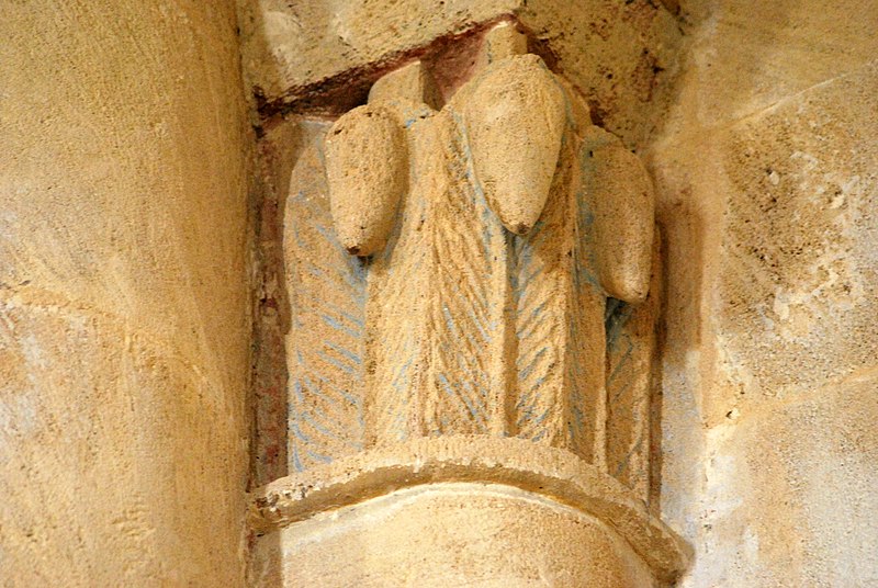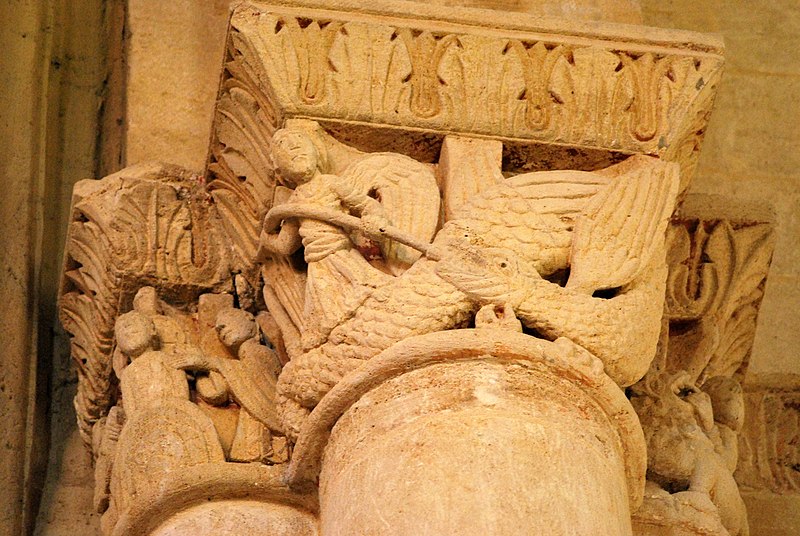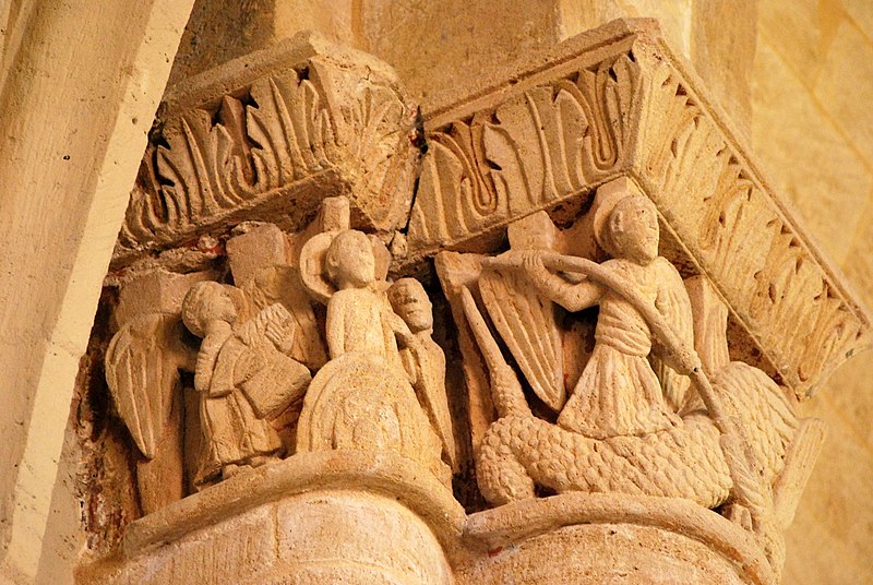 L'iconographie intérieure est concentrée autour de l'arc triomphal, du chœur et du chevet. Le pilier nord de l'arc triomphal porte trois colonnes engagées avec corbeilles historiées reproduisant des thèmes connus à La Sauve-Majeure : le baptême du Christ, saint Michel terrassant le dragon et Samson tuant le lion. Le pilier sud présente, parmi ses corbeilles, un Daniel dans la fosse aux lions de grande qualité et deux centaures affrontés, copies des modèles de La Sauve-Majeure mais présentant une disposition particulière. L'arc doubleau intermédiaire du sanctuaire comporte un ensemble original consacré à trois épisodes d'Abraham — l'alliance et la circoncision, le sacrifice d'Isaac interrompu par l'ange, et la dénonciation des mœurs de Sodome — scènes traitées de façon narrative et moralisante.