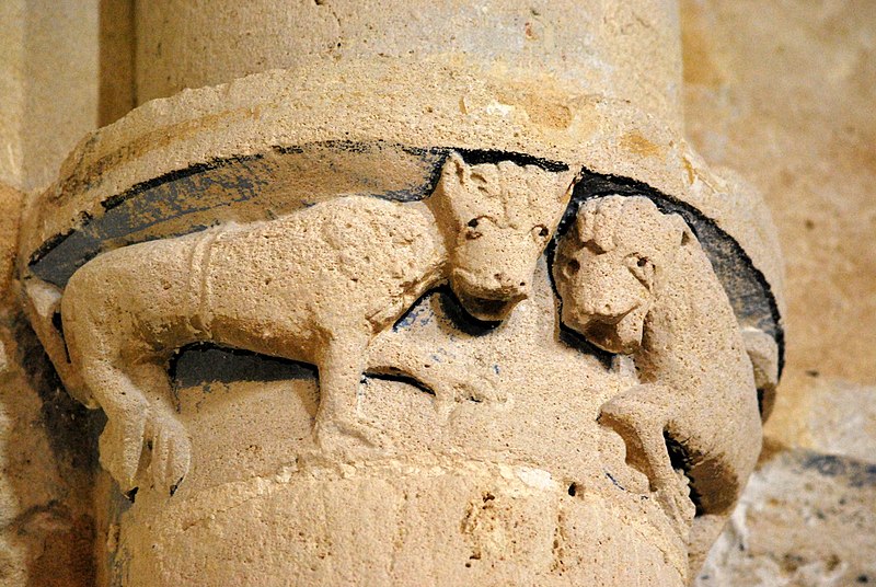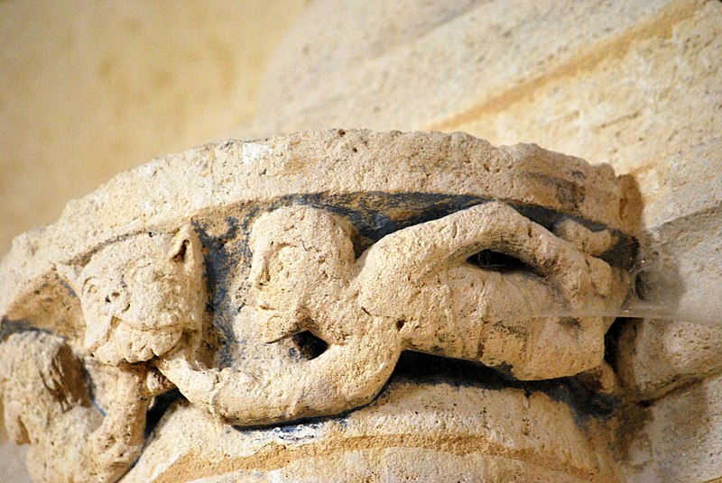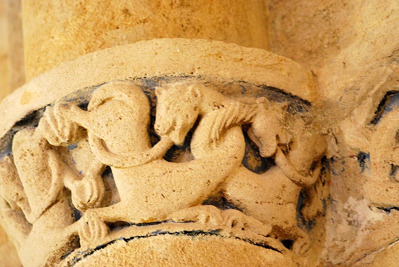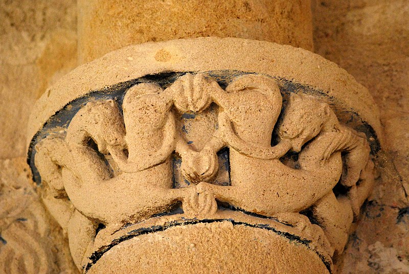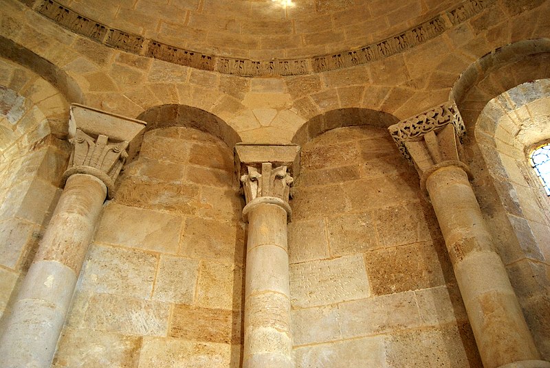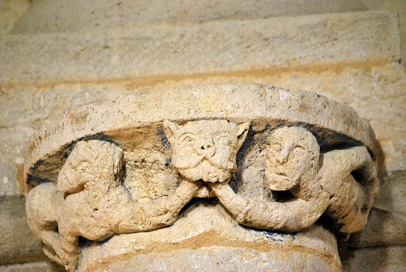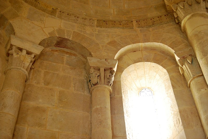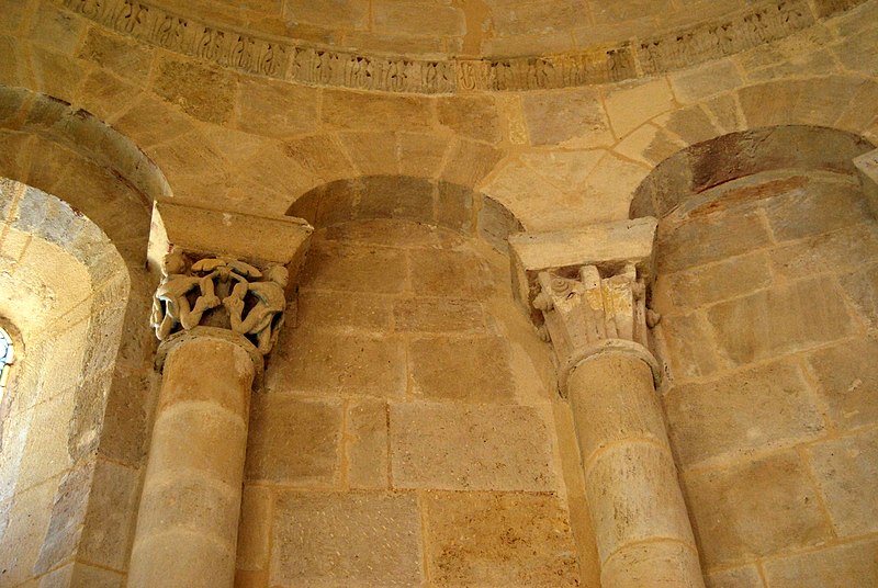 Le chevet combine ornements végétaux et chapiteaux historiés mettant en garde contre les péchés capitaux, avec notamment un chapiteau nord figurant l'avarice et la luxure et un chapiteau sud illustrant la libido par des figures humaines enlacées de lianes. Les sculptures du cordon, pour leur part, multiplient les mises en garde morales : fauves engouffrant des oiseaux ou des avant-bras, un loup face à un agneau, quatre lions entrelacés et la représentation d'un moine chantant depuis un antiphonaire.