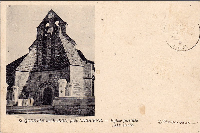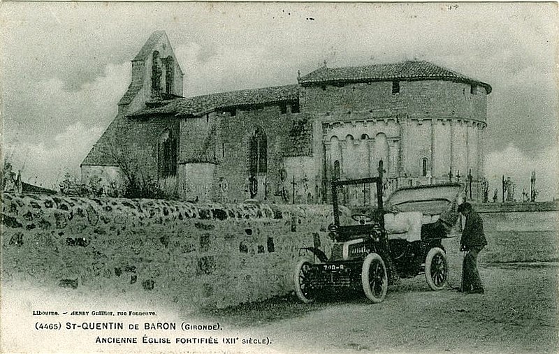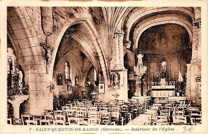 L'église Saint-Quentin de Saint-Quentin-de-Baron (Gironde) a été fondée au début du XIIe siècle ; sa construction primitive comprenait une nef unique prolongée par un chœur et un sanctuaire en hémicycle, dont subsistent aujourd'hui les volumes du chœur et le mur sud de la nef. Au XIVe siècle l'édifice est pourvu d'un parapet crénelé avec archères, élevé à partir de la corniche romane du chevet et du chœur, marquant son rôle partiellement fortifié. Les transformations les plus importantes datent du XVIe siècle : un vaste bas-côté est ajouté au nord, la nef reçoit un nouveau voûtement à ogives en étoile, un clocher est édifié et l'intérieur se pare d'un décor peint, comprenant des peintures murales dont certaines évoquaient la vie du seigneur de Bisqueytan. Une sacristie est établie au XVIIe siècle, reconstruite en 1903 puis démolie en 2007. Dans la seconde moitié du XIXe siècle, l'intérieur fait l'objet d'une réfection décorative par Augier et Millet, qui réalisent une peinture simulant des coupes de pierre ; le chœur, le sanctuaire et le pignon est du bas-côté sont traités de motifs géométriques, une scène religieuse ornait le cul-de-four, des vitraux datés de 1862 garnissent les baies et deux autels en bois polychrome sont ajoutés, le dallage étant refait. L'édifice est classé au titre des monuments historiques en 2004.