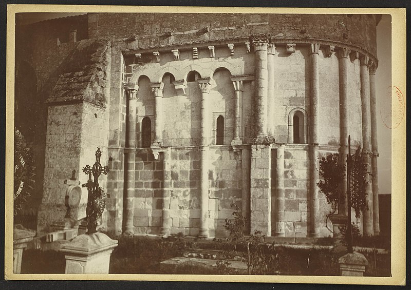 Les chapiteaux de la corniche présentent majoritairement des décors végétaux inspirés de La Sauve-Majeure, mais trois chapiteaux figurés se distinguent : deux sirènes mono-caudales tenant des tiges feuillues, encadrées par des modillons montrant un loup et un homme ithyphallique ; des mascarons crachant des lianes ; et un chapiteau partiellement englobé dans la maçonnerie du bas-côté illustrant trois personnages et un animal, interprété comme un avertissement moral contre les attouchements impurs. L'ensemble modillonnaire du chevet est d'une qualité remarquable ; certains modillons du mur nord ont conservé des traces de polychromie médiévale grâce à la protection offerte par la toiture du bas-côté et le répertoire sculpté est proche de pièces aujourd'hui disparues à La Sauve-Majeure.