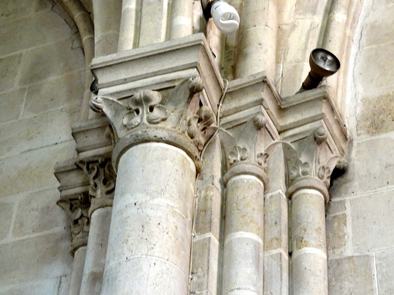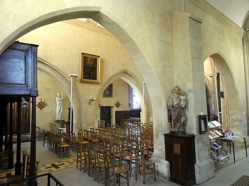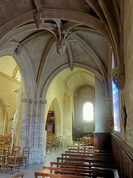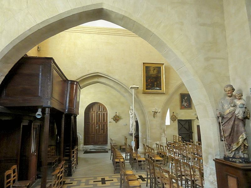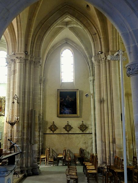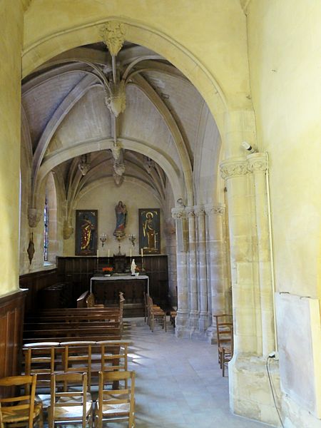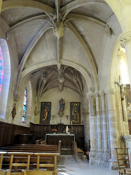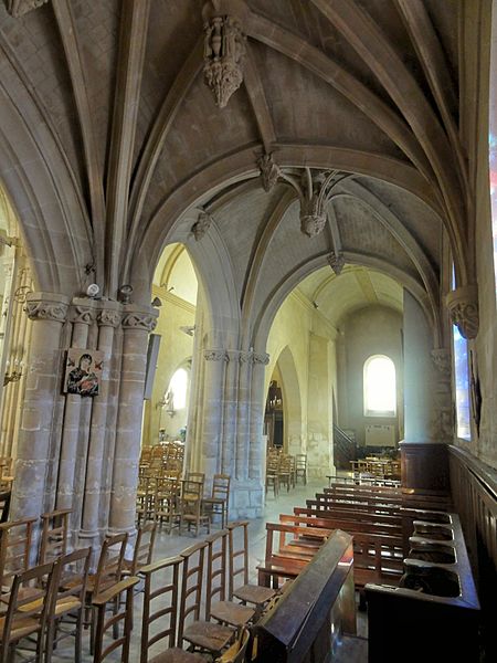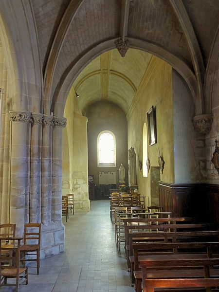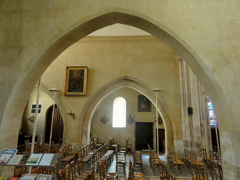 L'intérieur révèle un contraste marqué entre la simplicité de la nef, inspirée des nefs-granges romanes, et l'élégance gothique du chœur, élevé et entièrement voûté d'ogives. La porte d'entrée, percée au milieu du mur, donne sur un pilier et oblige à descendre plusieurs marches ; les arcades en tiers-point qui séparent la nef des bas-côtés sont moulurées côté nef mais dépourvues de colonnettes et chapiteaux côté bas-côtés. Les bas-côtés ont été rehaussés et leurs fenêtres en plein cintre datent au plus tôt du milieu du XVIe siècle ; leurs toitures formaient à l'origine des appentis indépendants, comme le suggèrent des ouvertures hautes désormais obstruées. L'arc triomphal repose sur chapiteaux à crochets et colonnettes engagées, et des traces de pierres de réserve et de faisceaux de colonnettes témoignent d'un projet initial d'une nef plus haute et voûtée auquel on renonça en cours de chantier, selon Louis Régnier.