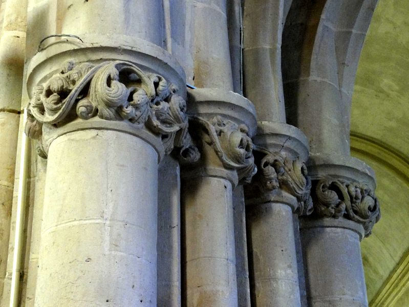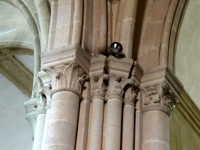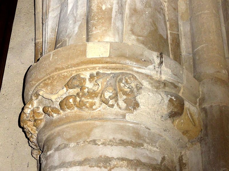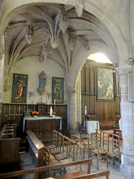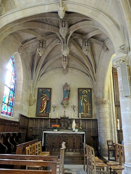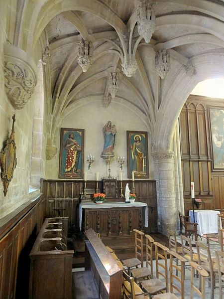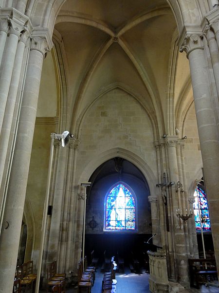 Le chœur, éclairé par lancettes fortement ébrasées, forme une entité homogène avec le collatéral sud voûté à la même hauteur ; les travées diffèrent de dimensions et la diversité des chapiteaux montre une grande variété stylistique, même si bases et socles ont été refaits au XIXe siècle. Le principe d'équivalence entre la charge et le nombre de supports n'a pas été mené à terme : des faisceaux de colonnettes subsistent dans certaines travées tandis que d'autres n'ont reçu que des supports réduits, signe d'un changement d'option en cours d'exécution. La chapelle seigneuriale, plus basse et sombre, communique avec le vaisseau central et le bas-côté nord ; ses voûtes présentent des liernes et tiercerons, des culs-de-lampe sculptés de rinceaux et de grappes de vigne, et des clés pendantes où niches à statuettes et anges supportant un écusson composent l'ornementation. Les thèmes sculptés y reprennent principalement des feuilles d'acanthe et des motifs végétaux; la clé principale de la première travée montre des apôtres et des saints identifiables à leurs attributs, et la seconde travée porte le blason de Charles de Villiers de L'Isle-Adam entouré de petites clés figurant d'autres saints.