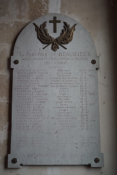L'église Saint-Remi, de style gothique, se dresse au sommet du village de Beaurieux dans l'Aisne et possède une flèche de pierre remarquable, unique dans le Laonnois. Elle domine le village et est entourée du cimetière. Les bas-côtés sont agencés comme une succession de chapelles perpendiculaires, chacune couverte d'un toit à double pente. L'accès occidental se fait par trois portes : la porte centrale est protégée par un porche et la porte de gauche présente un tympan trilobé décoré d'étoiles et des armes seigneuriales. Le clocher, en pierre, a été inscrit au titre des monuments historiques en 1927 ; le reste de l'édifice a été inscrit en 2004. Le chevet est plat et percé d'un vitrail triple surmonté d'une ouverture singulière. L'intérieur conserve plusieurs objets remarquables, dont une plaque obituaire de Claude Marquette, seigneur de Beaurieux au XVIIe siècle, une chaire en bois avec son ciel gothique, un chemin de croix composé de douze peintures, et l'autel principal surmonté d'un ciel en bois peint. On y voit également un vitrail de Jacques Simon représentant une messe dans une tranchée de la Grande Guerre, ainsi que des reliques d'Eutropie, sœur de Nicaise, évêque de Reims. Le pèlerinage d'Eutropie jouissait d'une grande renommée et donna lieu à une procession le lundi de la Pentecôte en direction de la fontaine de la montagne. L'église est située sur la commune de Beaurieux, dans le département de l'Aisne.